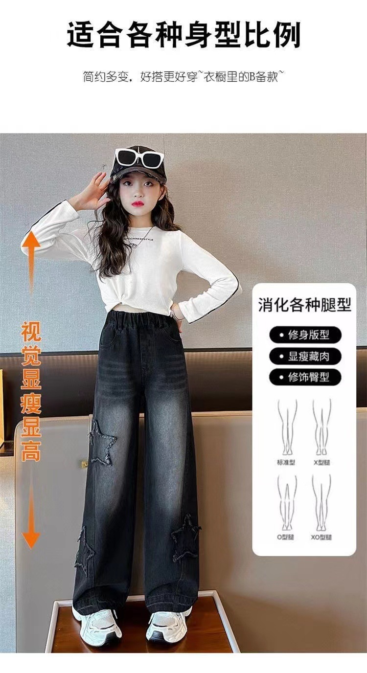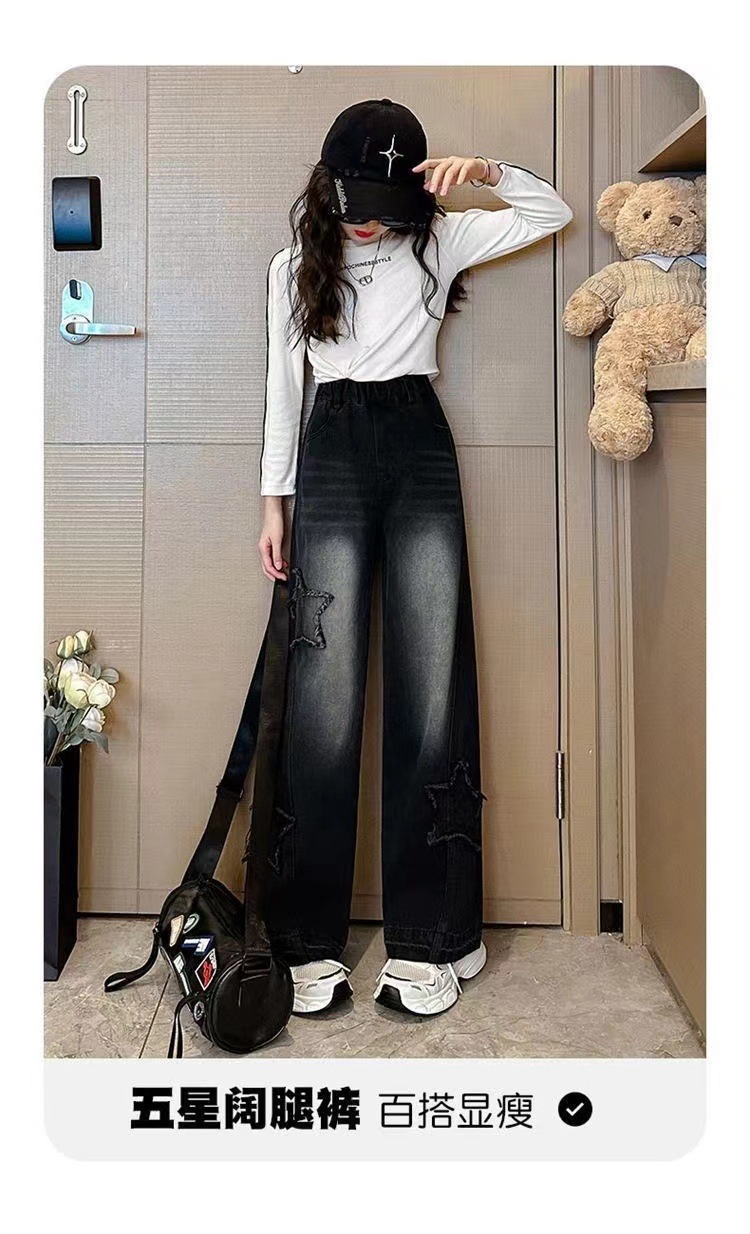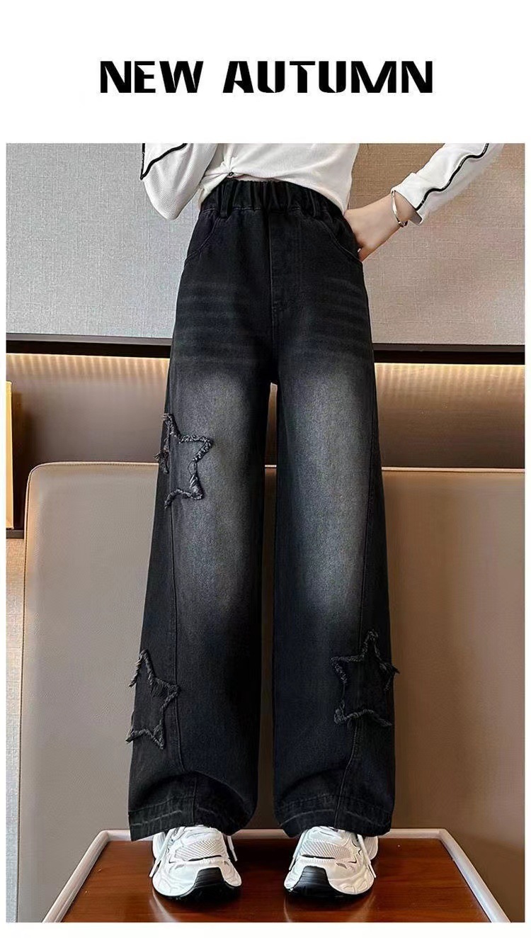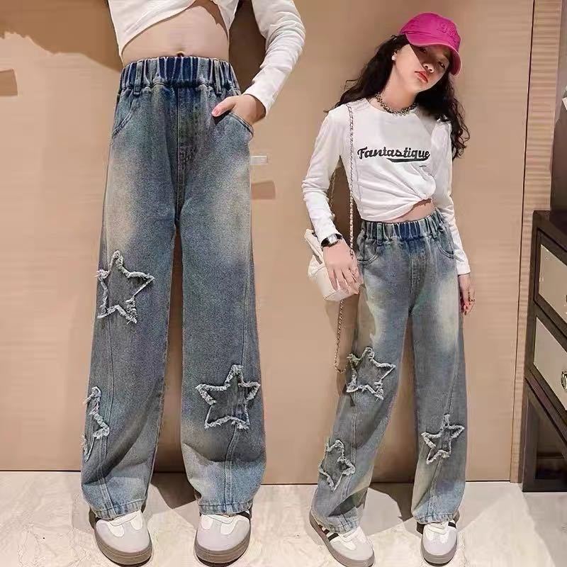 소녀 청바지 봄과 가을 2025 새로운 스타일 중대형 어린이 스트레이트 다리 바지 세련된 어린이 어린 소녀의 느슨한 넓은 다리 바지스토어 가기