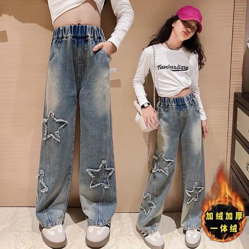 소녀 청바지 봄과 가을 2025 새로운 스타일 중대형 어린이 스트레이트 다리 바지 세련된 어린이 어린 소녀의 느슨한 넓은 다리 바지