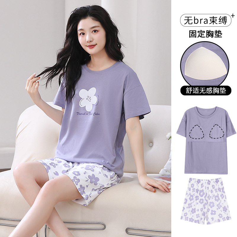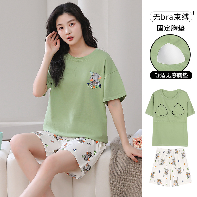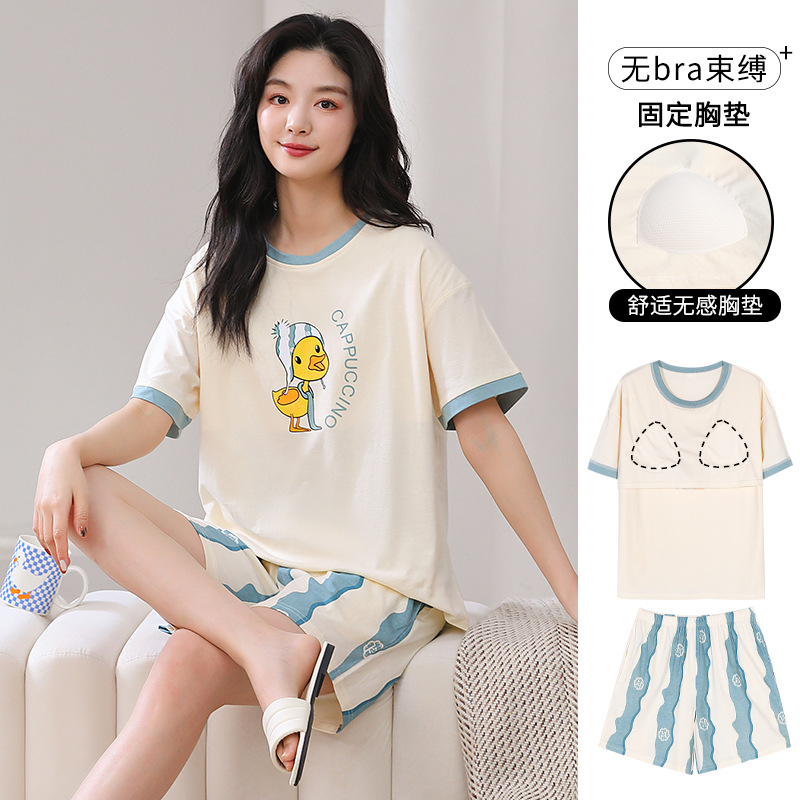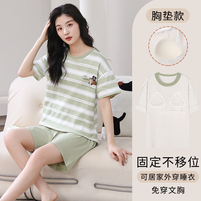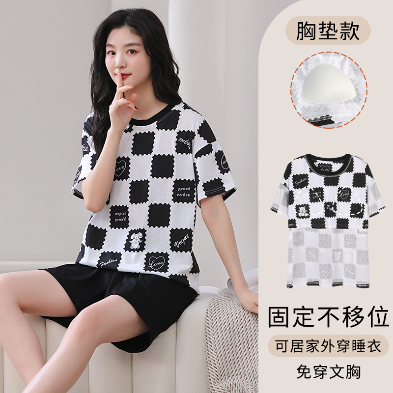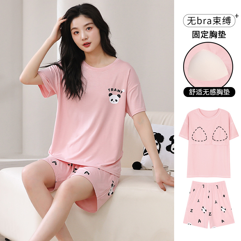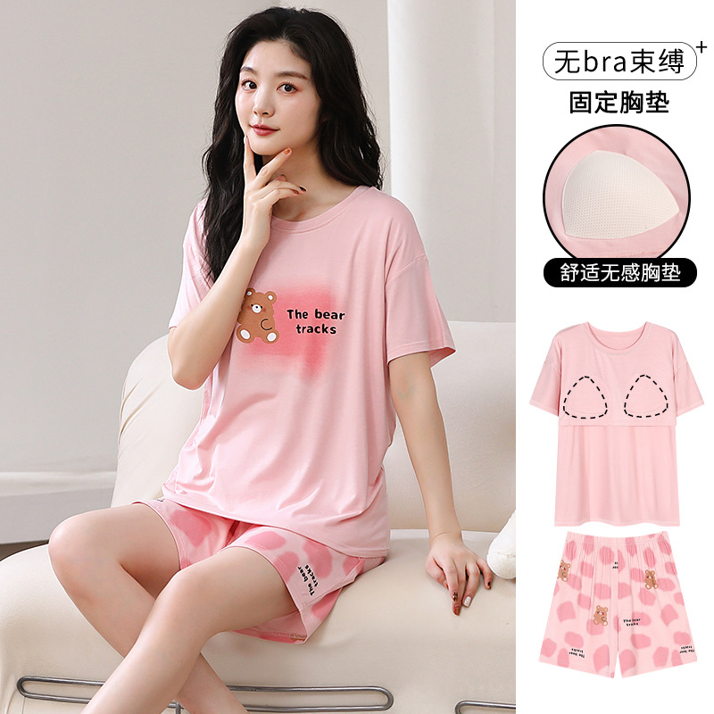 [가슴 패드와 함께] 잠옷 여성 여름 반팔 반바지 투피스 캐주얼 아웃웨어 여성 여름 홈 의류 세트