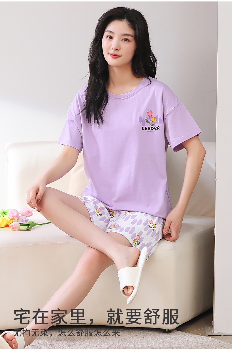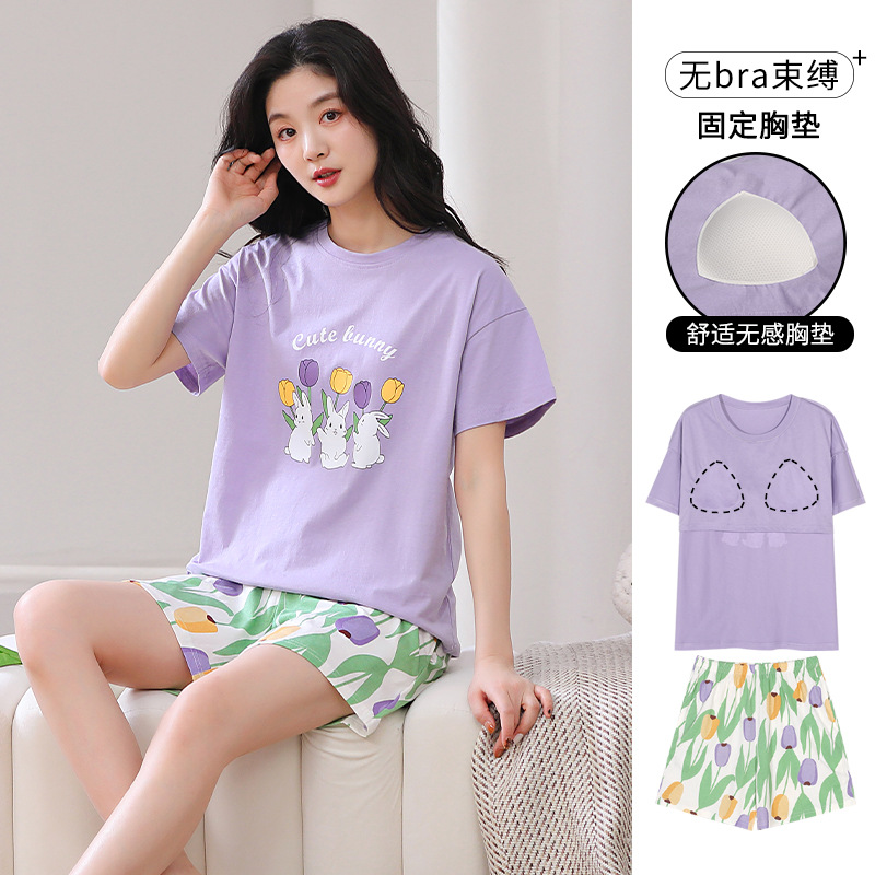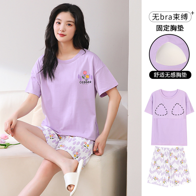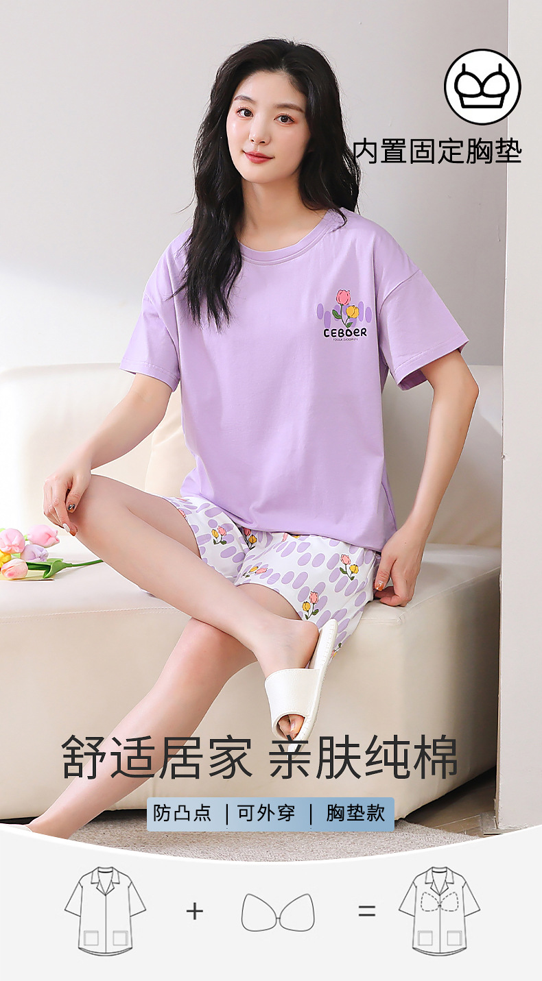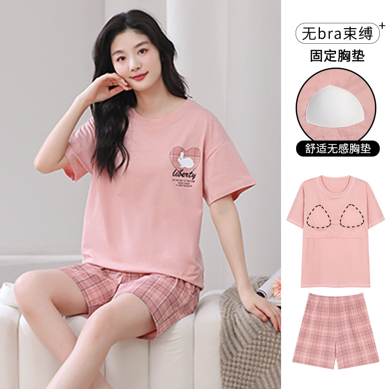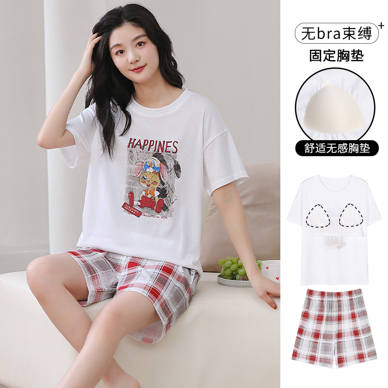 [가슴 패드와 함께] 잠옷 여성 여름 반팔 반바지 투피스 캐주얼 아웃웨어 여성 여름 홈 의류 세트