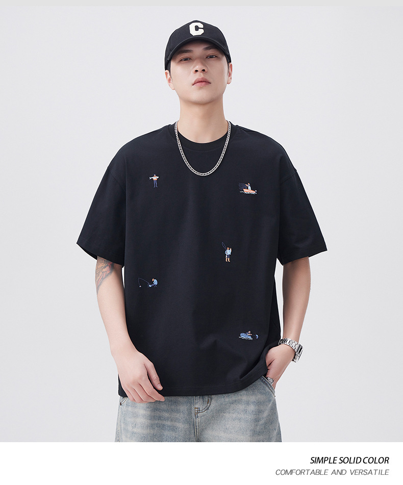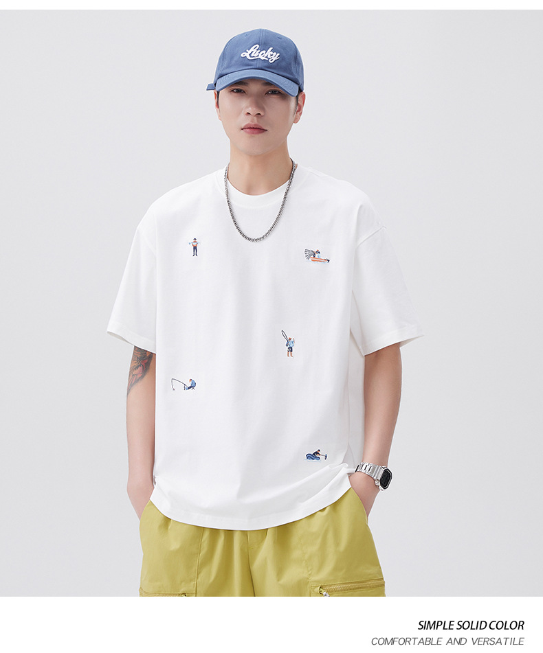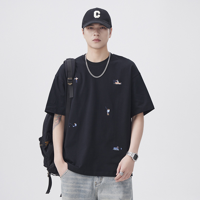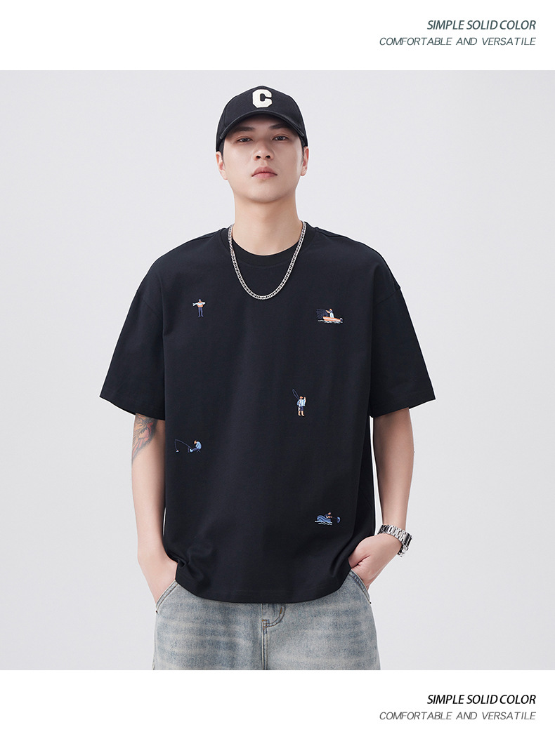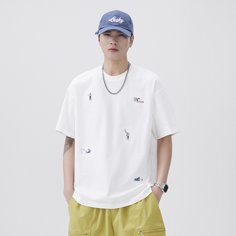 260g 헤비 코튼 캐주얼 티셔츠 남자의 여름 새로운 창조적 인 자수 티셔츠 느슨한 반 소매베이스 셔츠