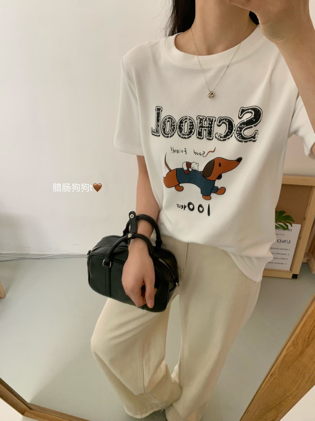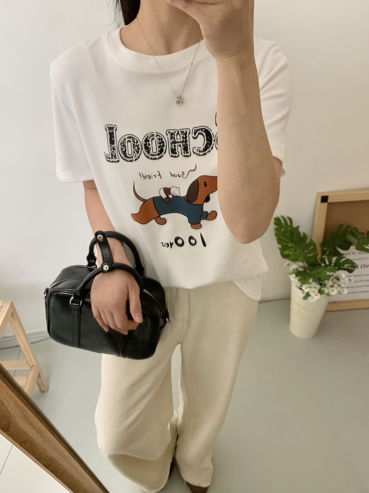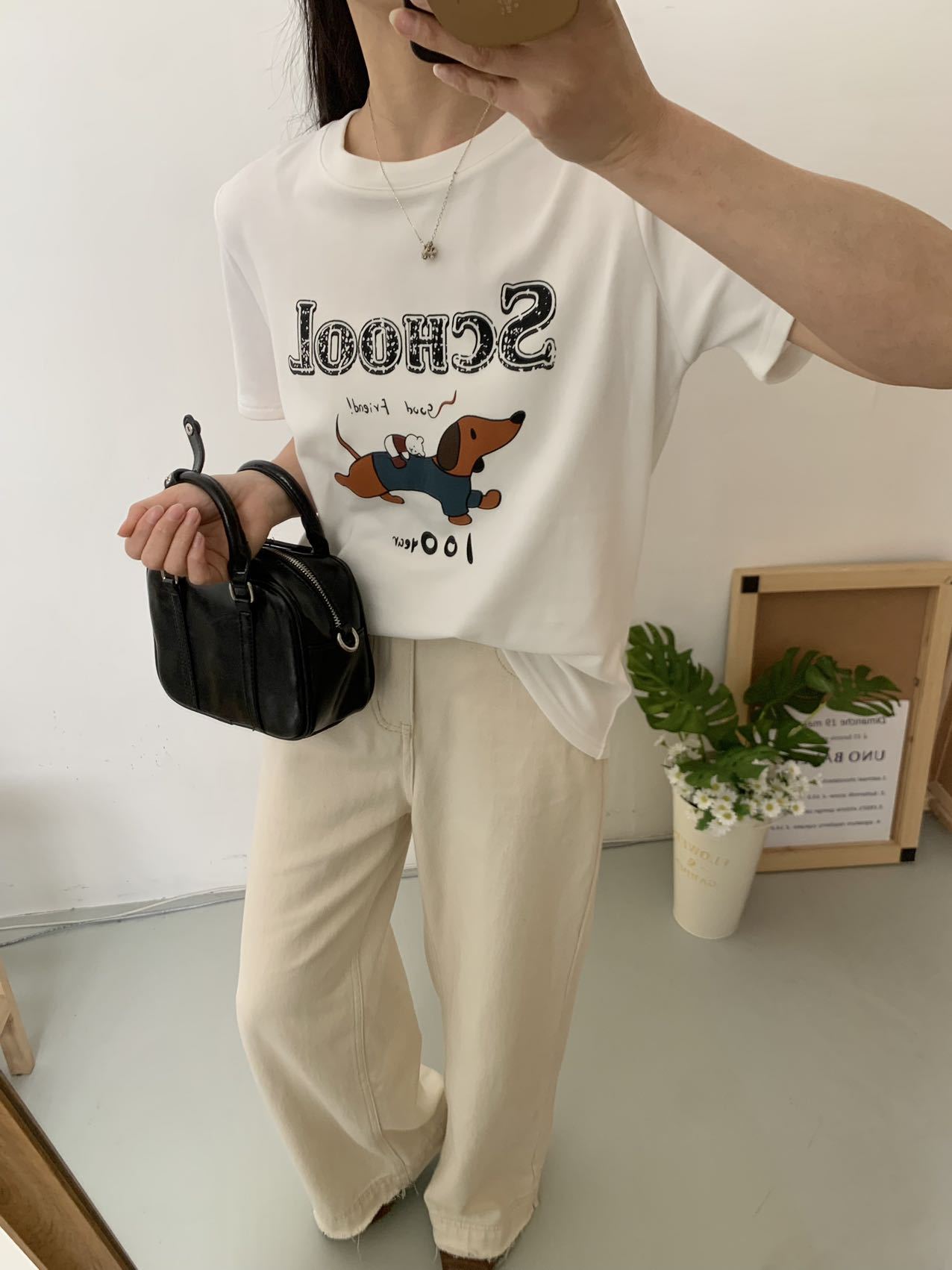봄이 늦지 않은 흰색 만화 편지 인쇄 티셔츠 여성의 2025 년 초 봄 새로운 올 매치 라운드 넥 반팔 루즈 탑