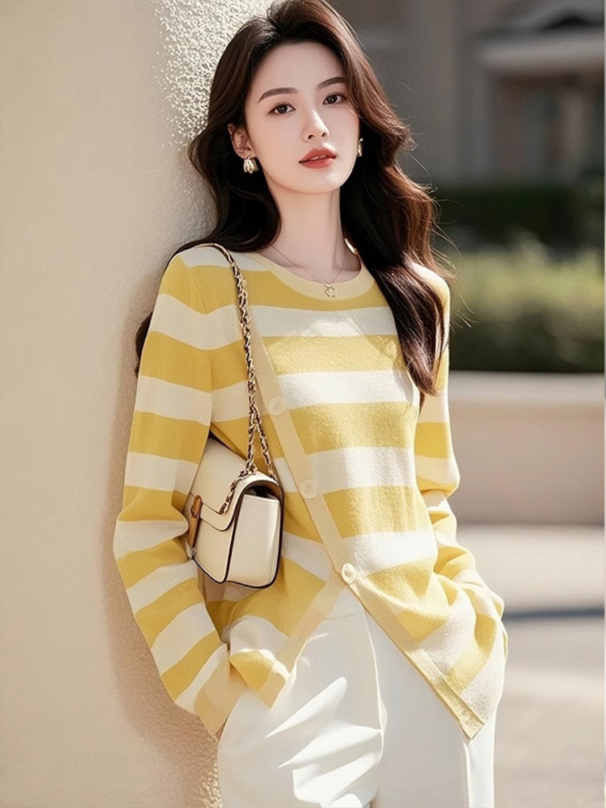 프랑스 도파민 노란색 스트라이프베이스 셔츠 여성의 2025 봄 새로운 디자인 불규칙한 분할 탑스토어 가기