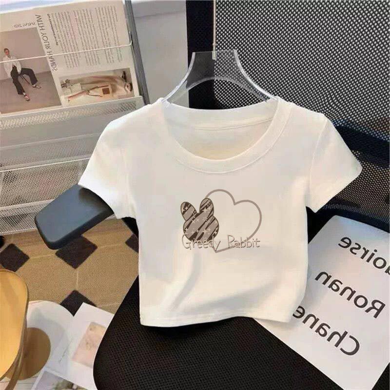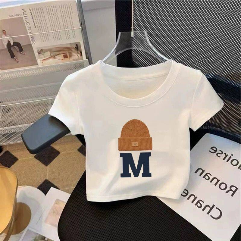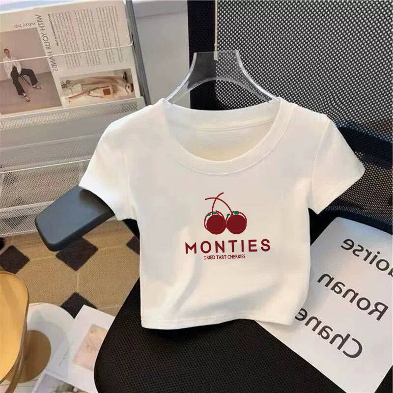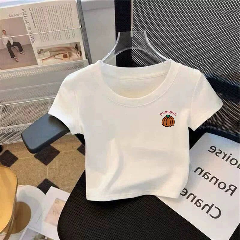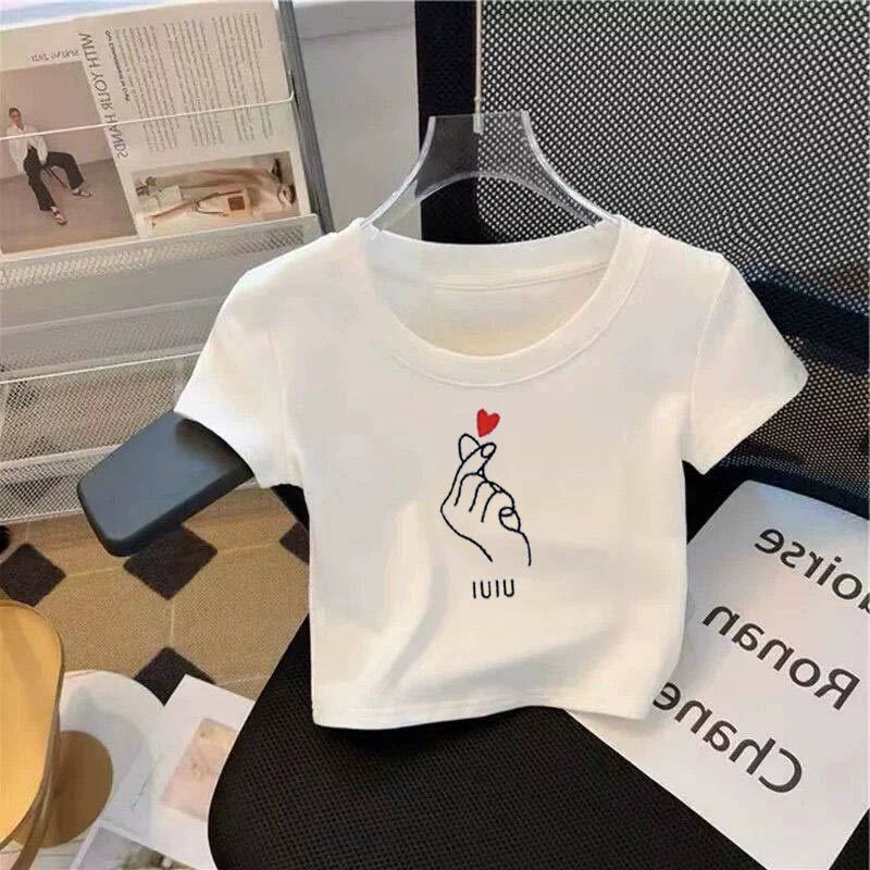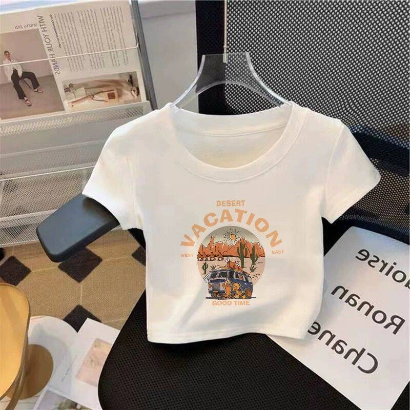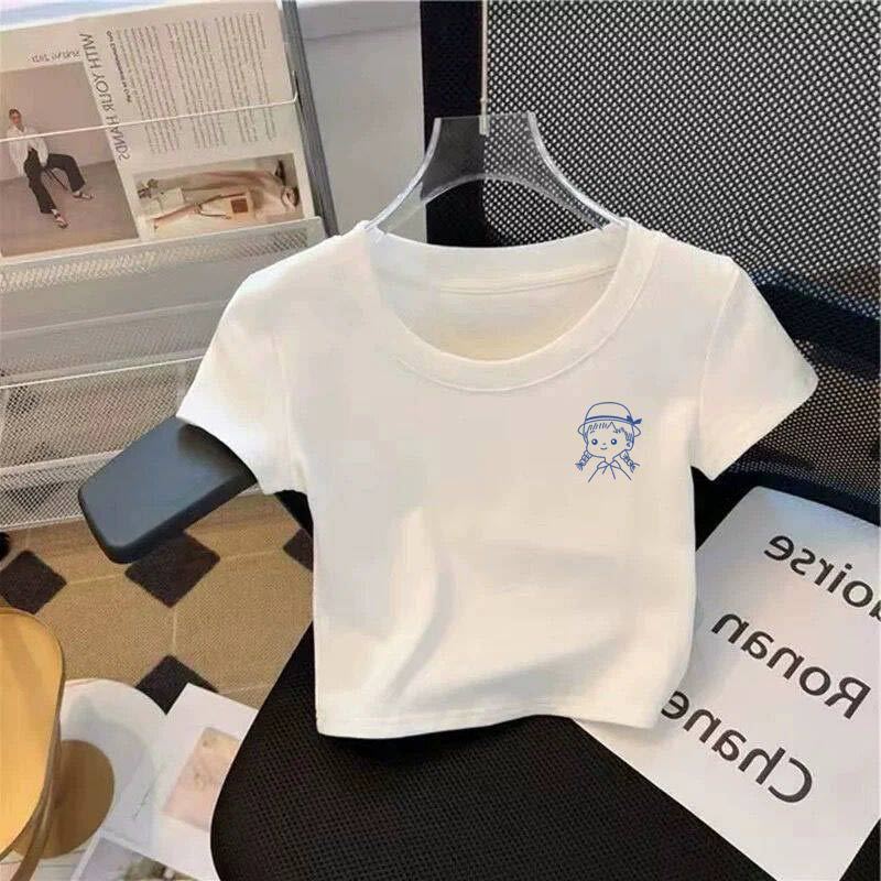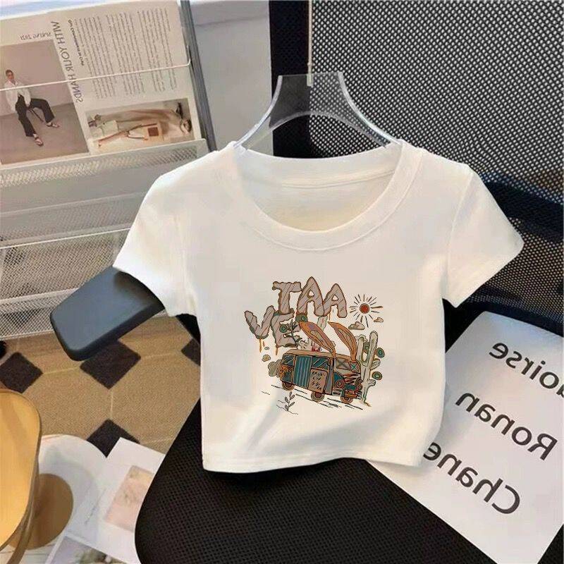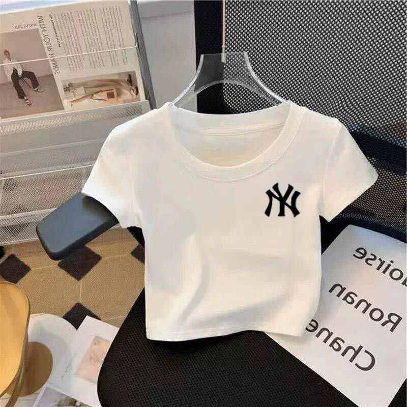 면 반팔 티셔츠 여성용 화이트 숄더 여름 새로운 라운드 넥 셔츠 슬림핏 짧은 배꼽 셔츠스토어 가기