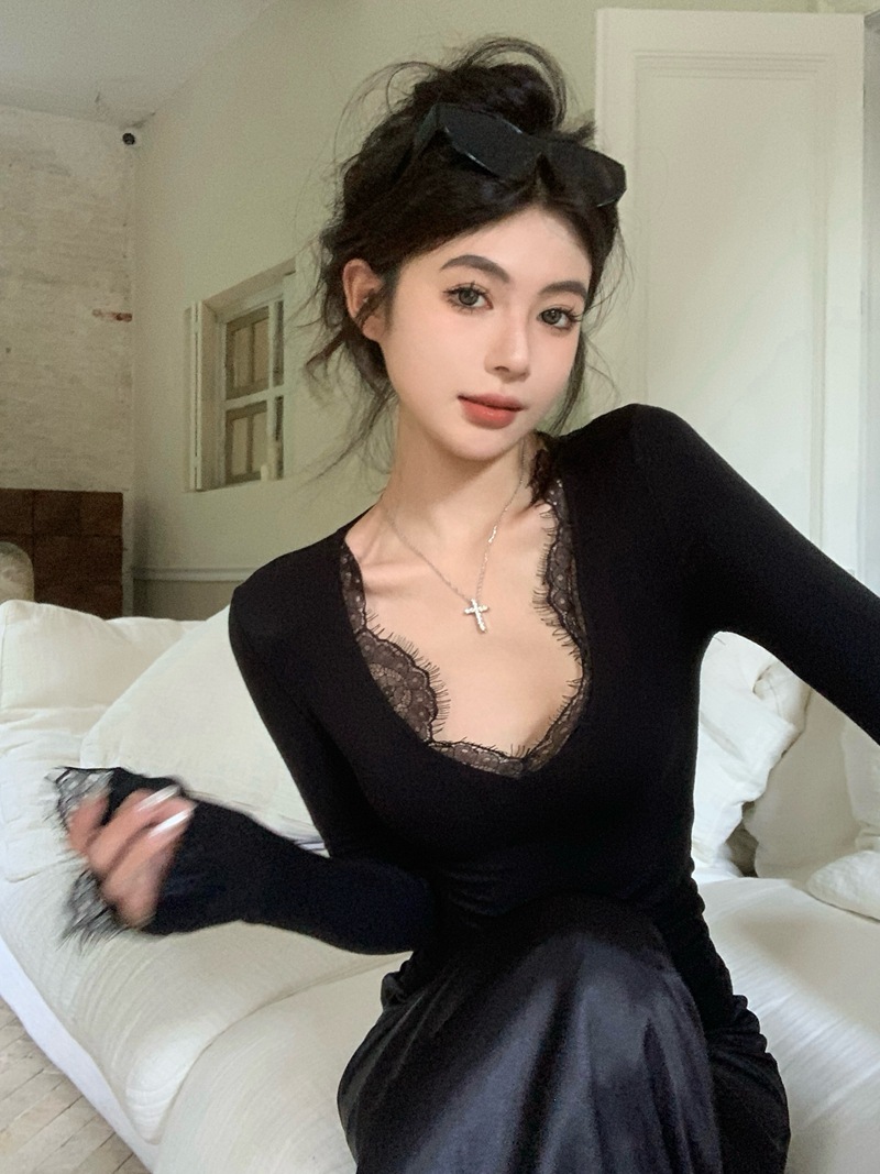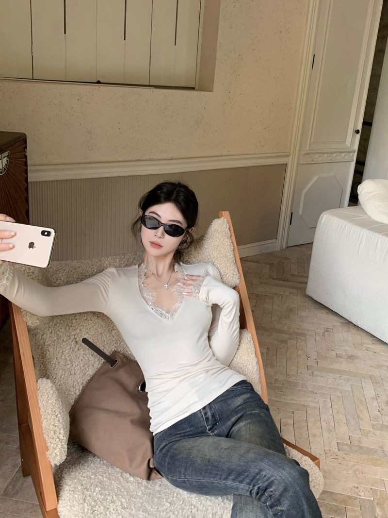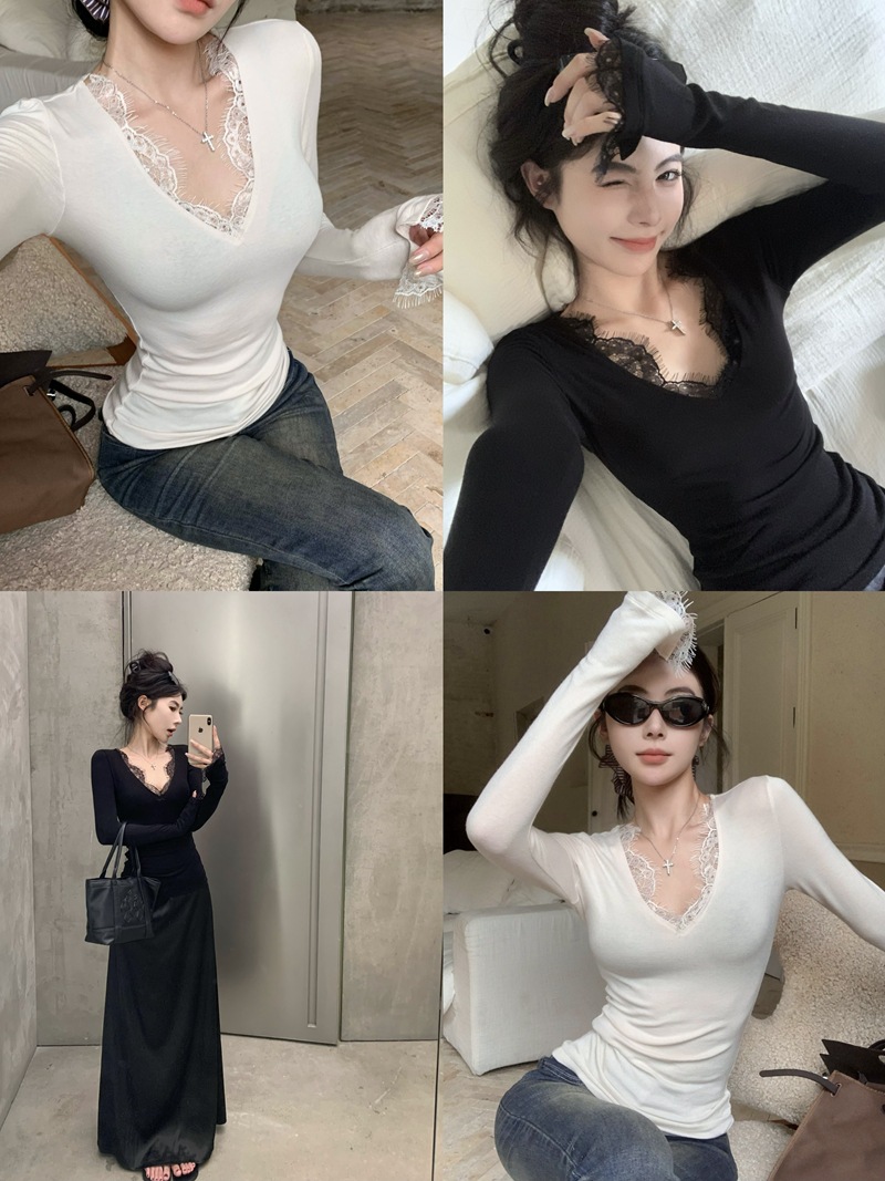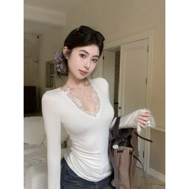 진짜 샷 봄과 가을 순수한 욕망 섹시한 여신 내베이스 셔츠 여성용 슬림핏 슬리밍 V 넥 레이스 탑