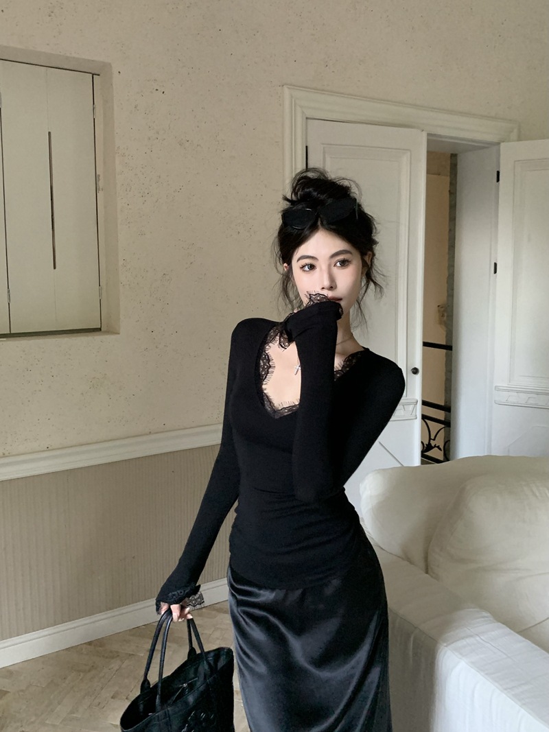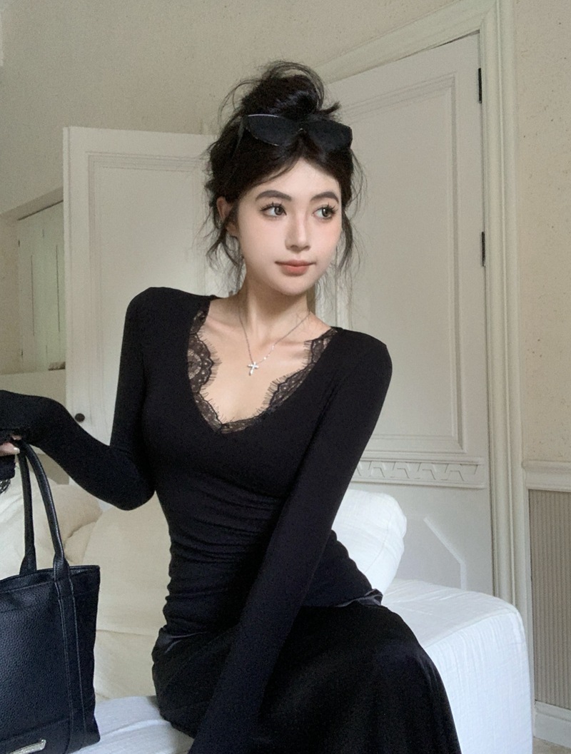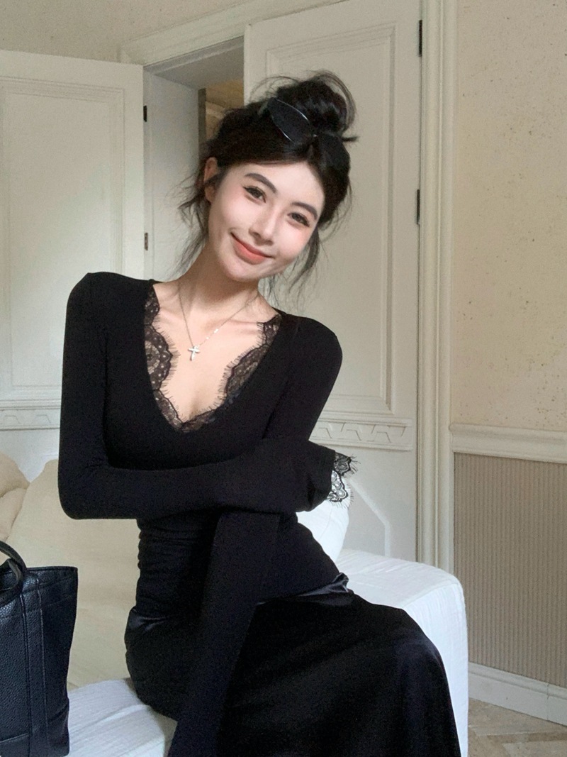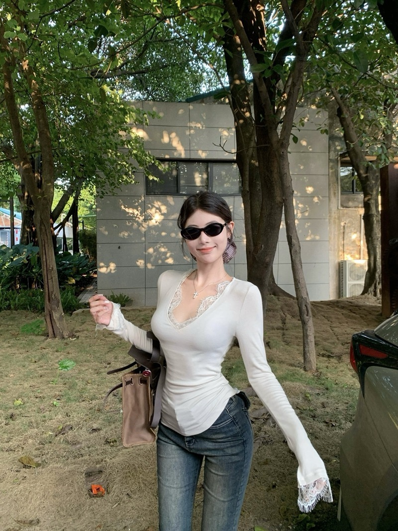 진짜 샷 봄과 가을 순수한 욕망 섹시한 여신 내베이스 셔츠 여성용 슬림핏 슬리밍 V 넥 레이스 탑