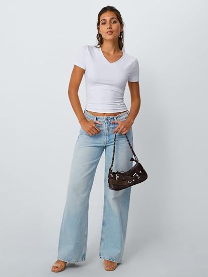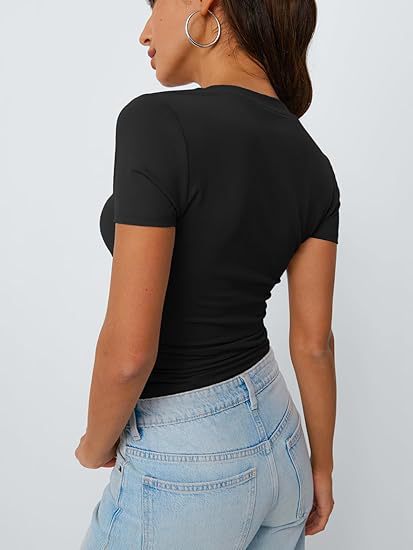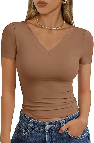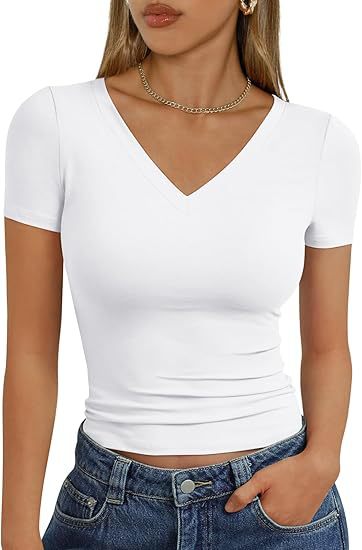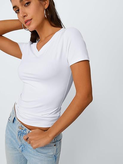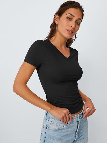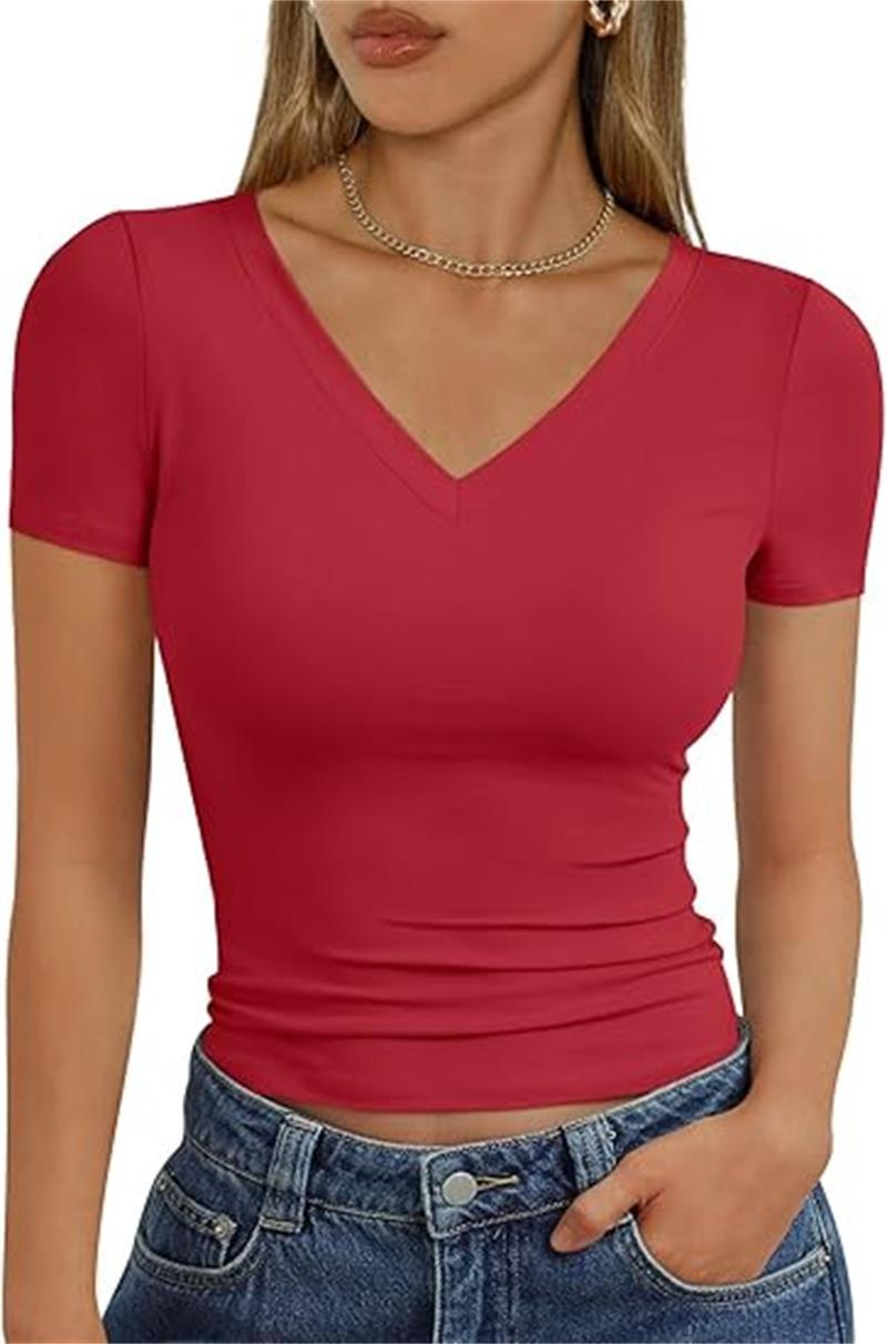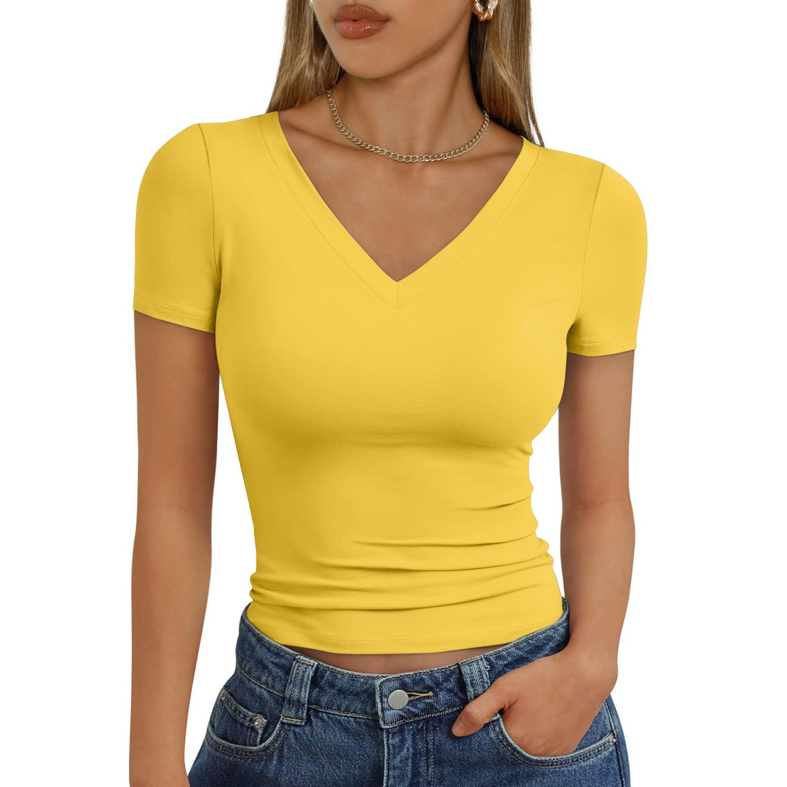 2025 아마존 국경 유럽 및 미국 대외 무역 V 넥 솔리드 컬러 슬림 솔리드 컬러 쇼트 슬리브 탑 티셔츠스토어 가기