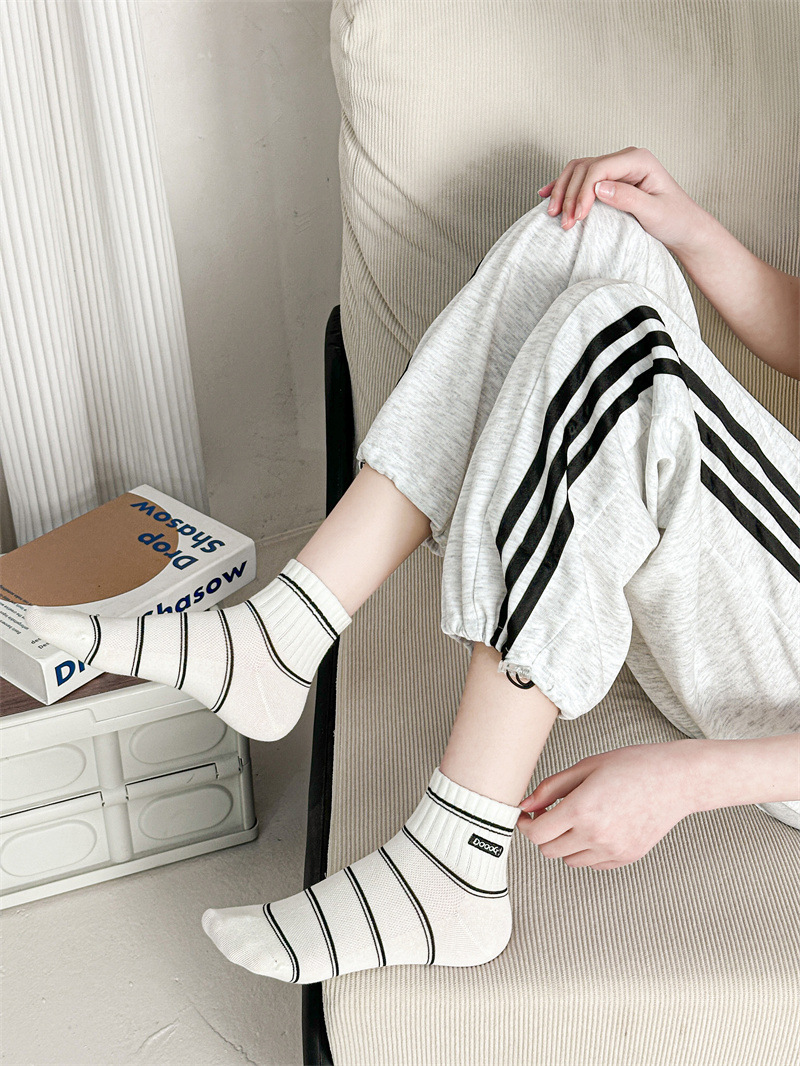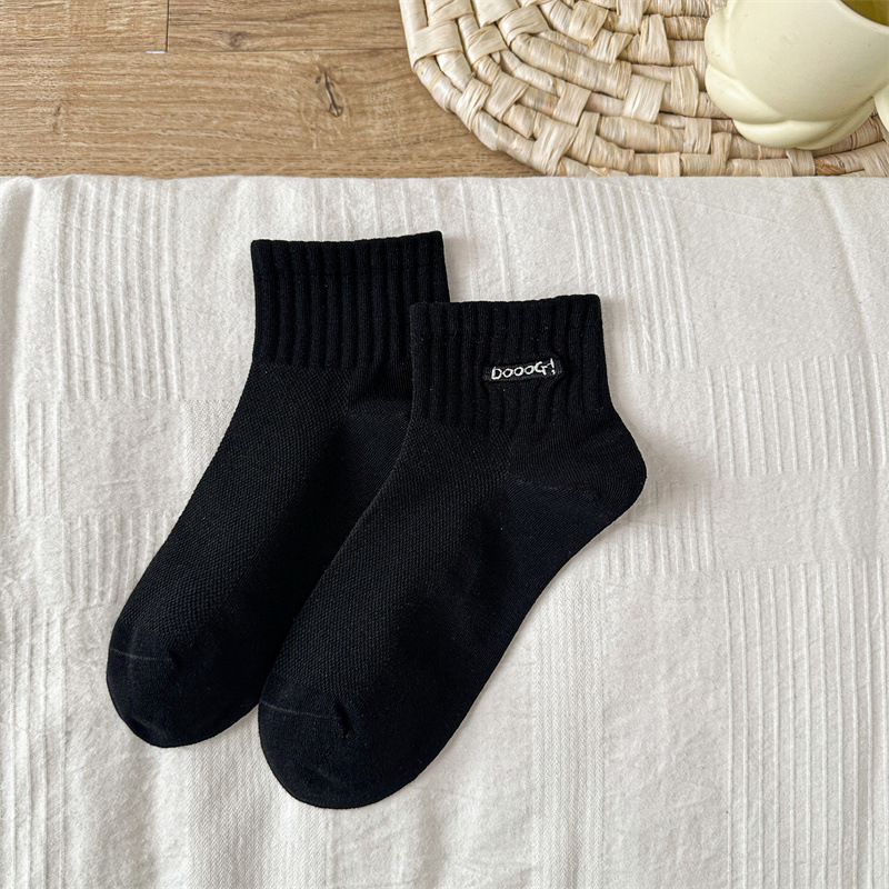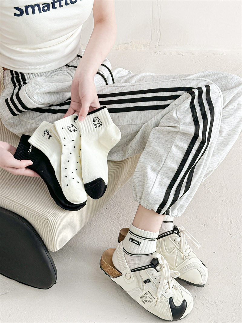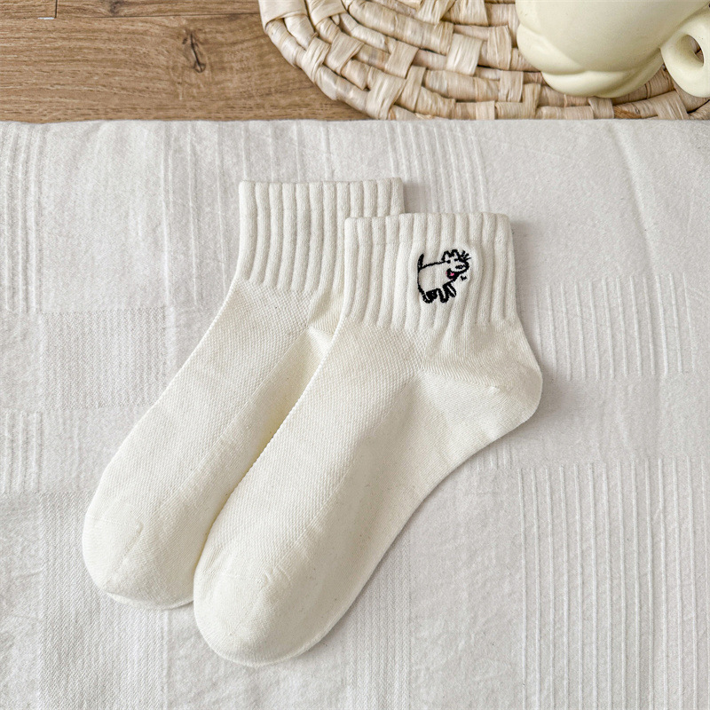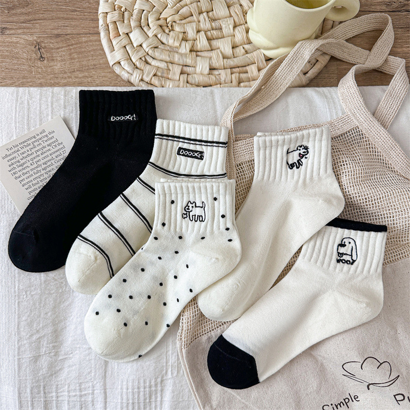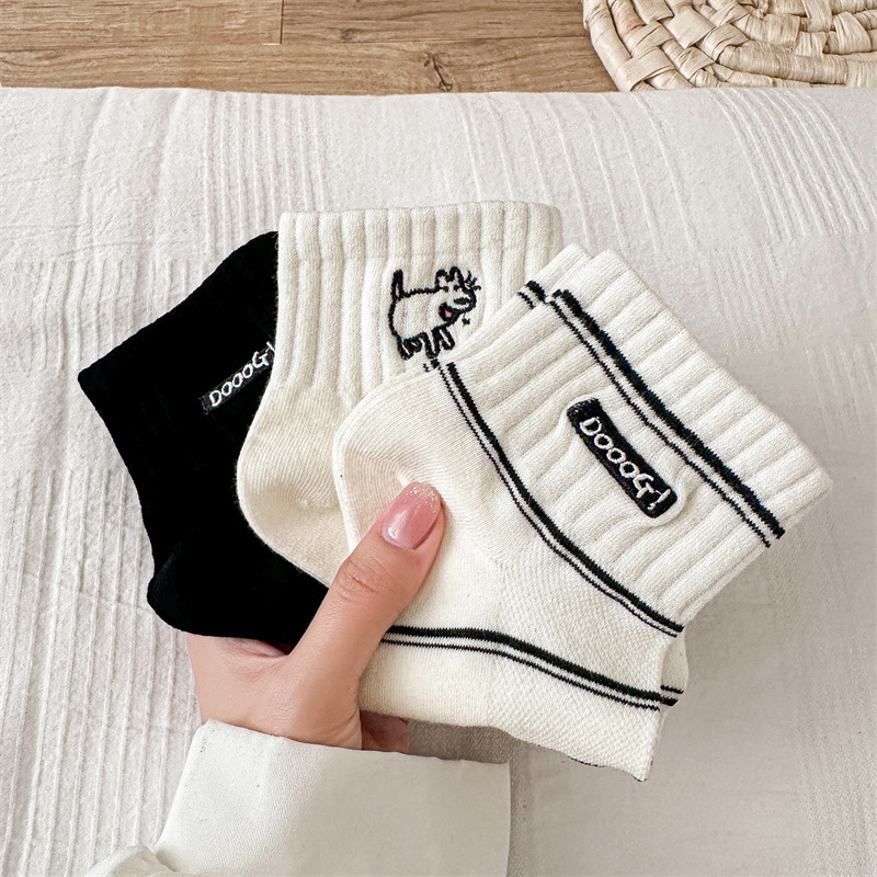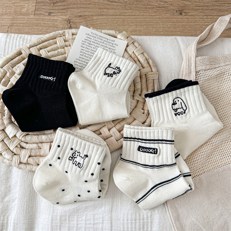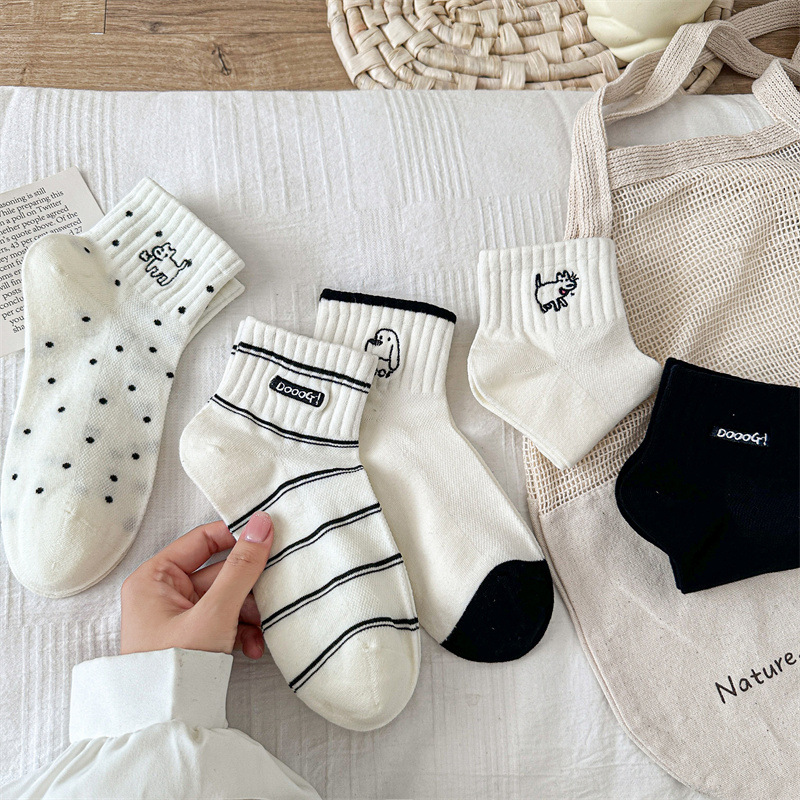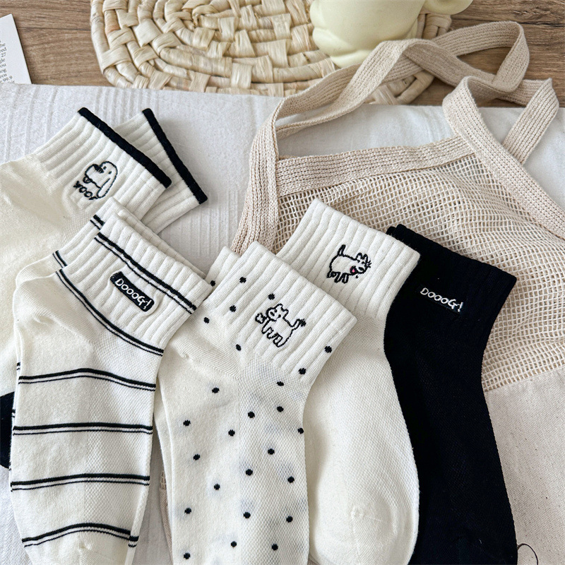 자수 강아지 양말 여성 한국 스타일 면 양말 봄과 여름 만화 귀여운 흑백 여성 양말 Ins 유행 짧은 양말