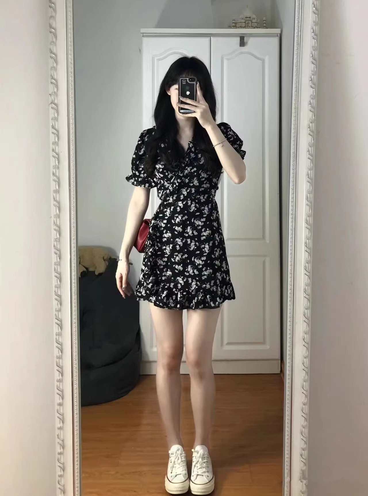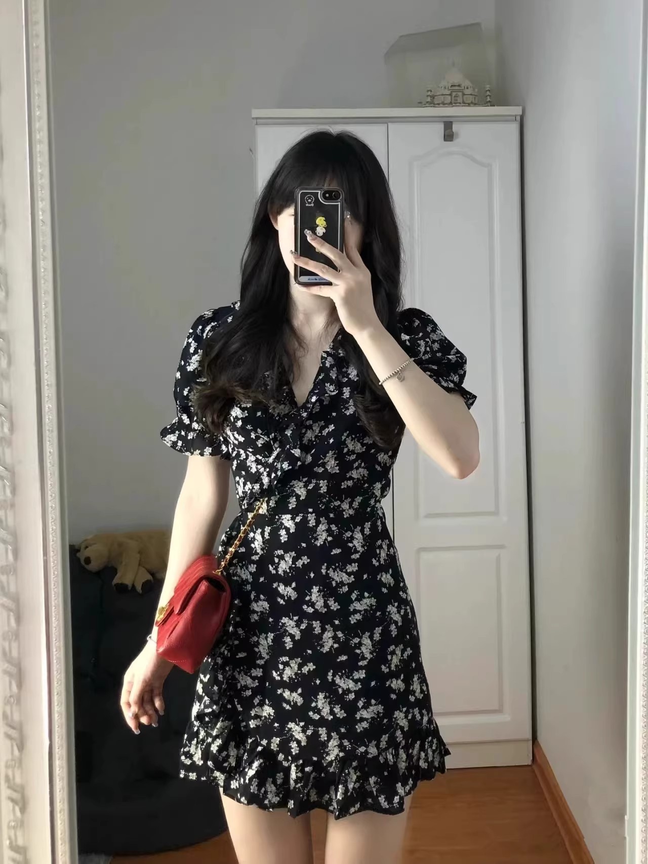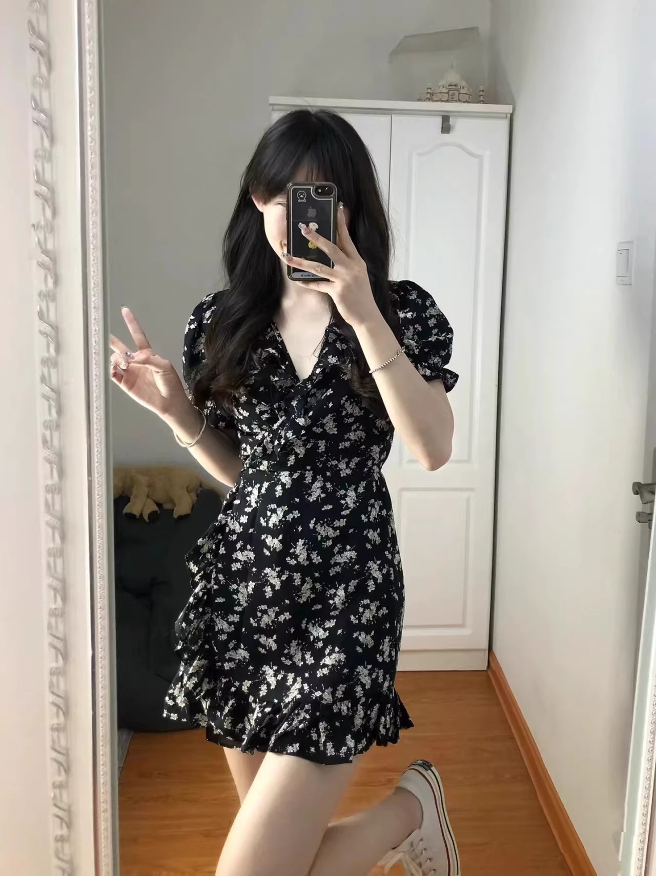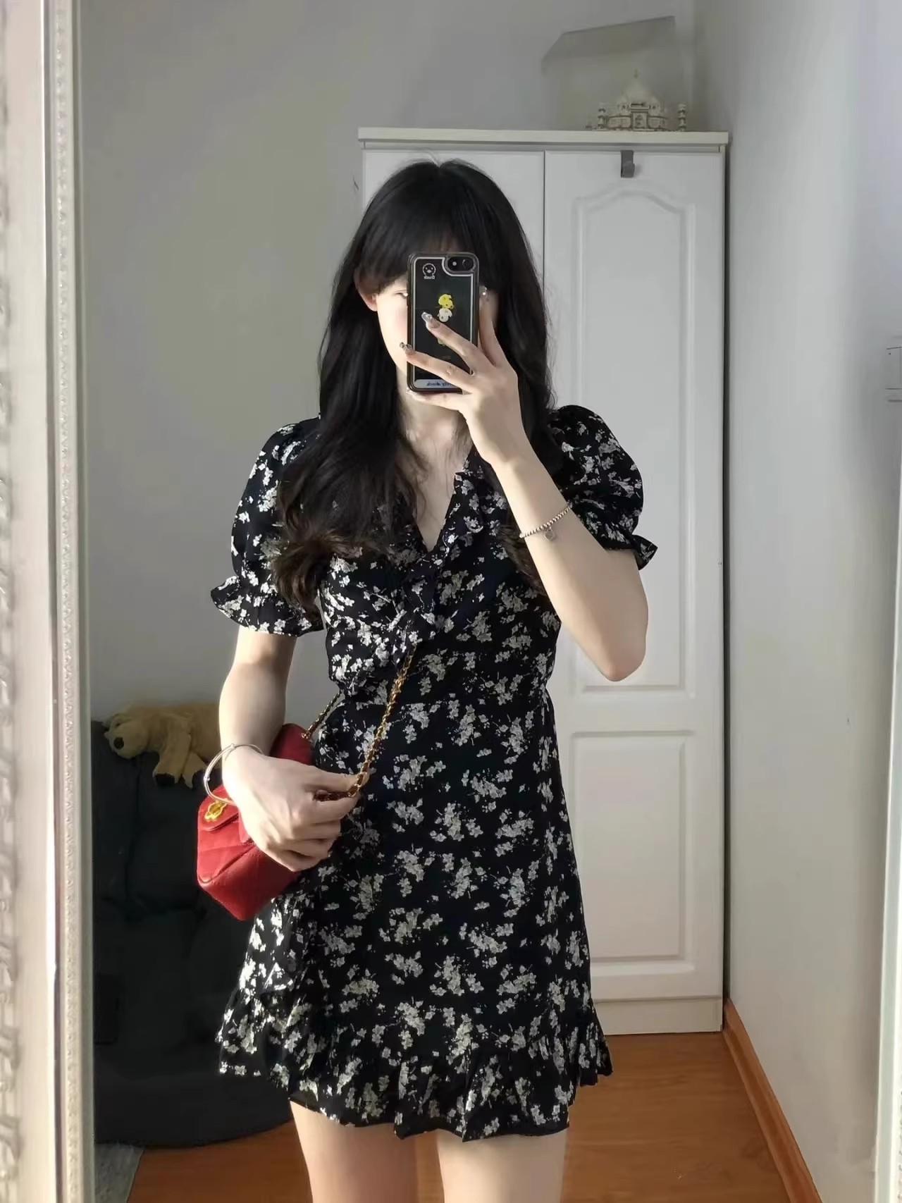 프랑스 스타일 꽃 V 넥 원피스 여성 여름 2025 새로운 스타일 헵번 스타일 블랙 우아한 짧은 치마 슬리밍스토어 가기
