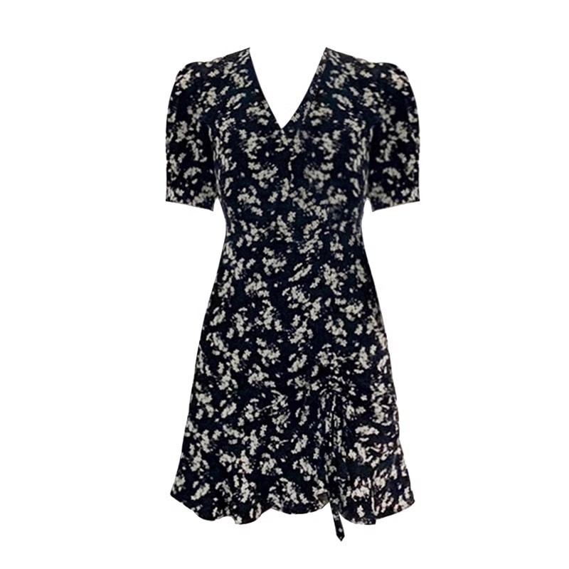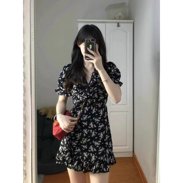 프랑스 스타일 꽃 V 넥 원피스 여성 여름 2025 새로운 스타일 헵번 스타일 블랙 우아한 짧은 치마 슬리밍