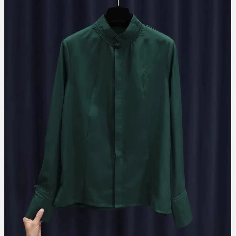 버튼과 수직 칼라가있는 빈티지 그린 셔츠 여성용 올매치 우아한 텐셀 톱 스타일리스트 세련된 작은 셔츠