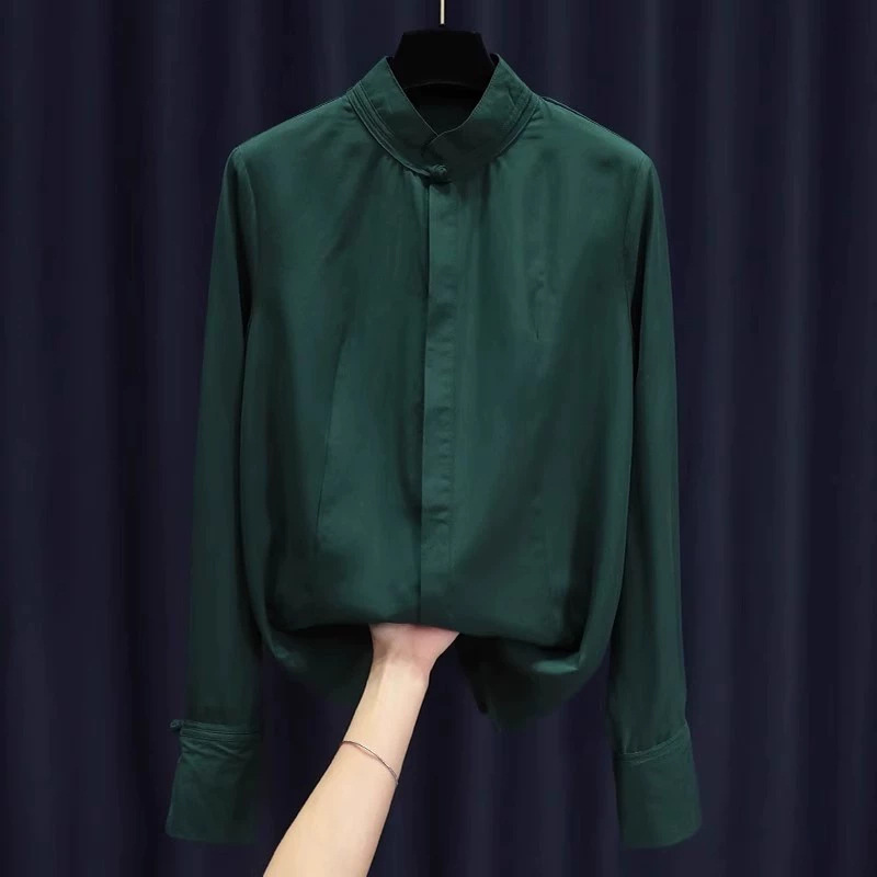 버튼과 수직 칼라가있는 빈티지 그린 셔츠 여성용 올매치 우아한 텐셀 톱 스타일리스트 세련된 작은 셔츠스토어 가기