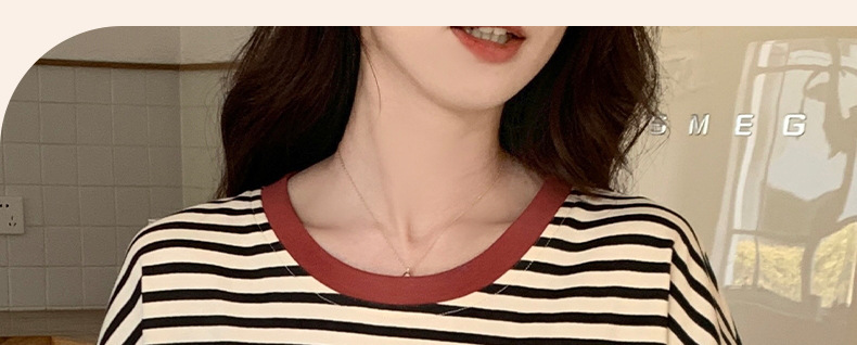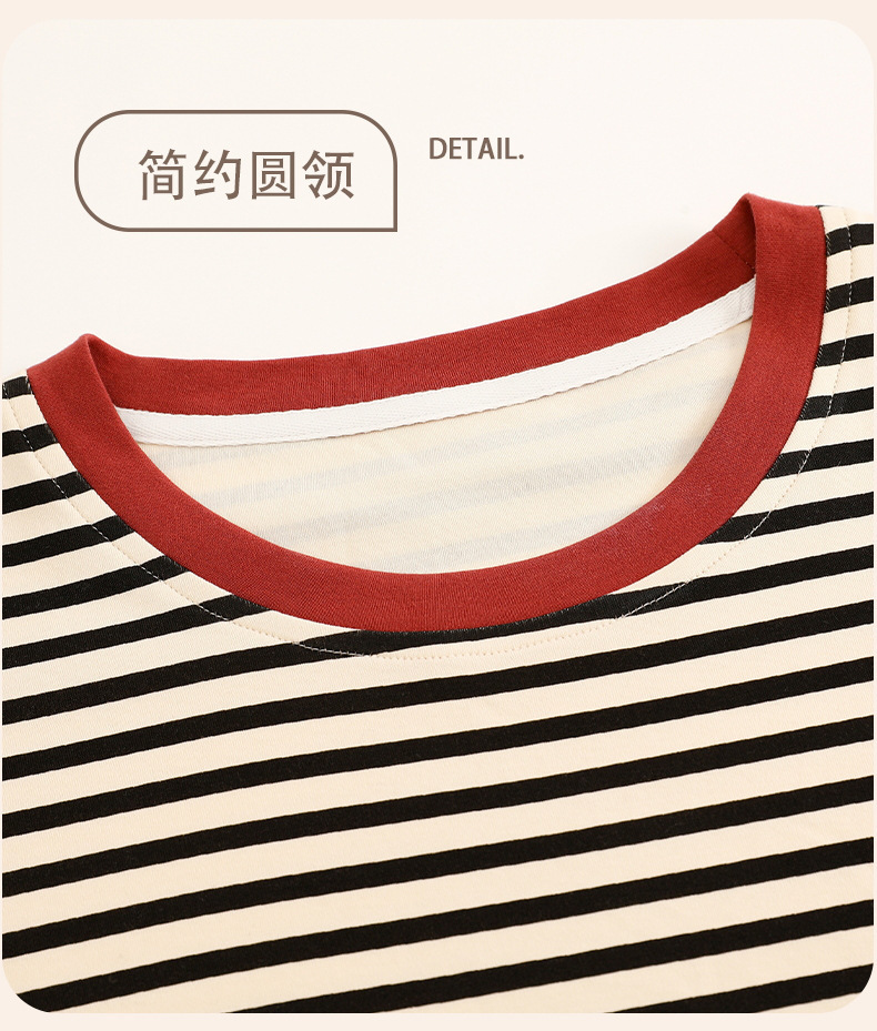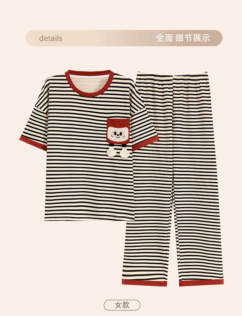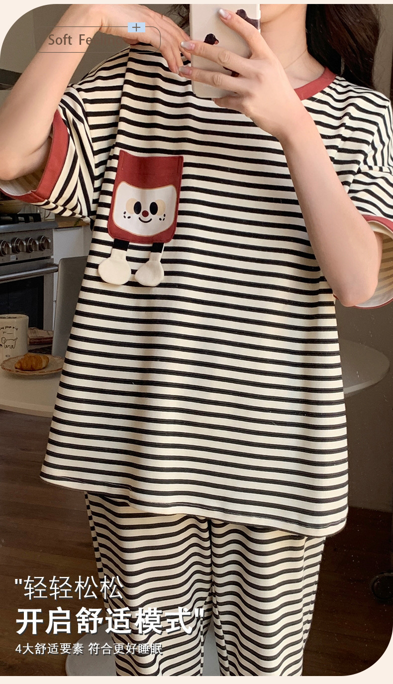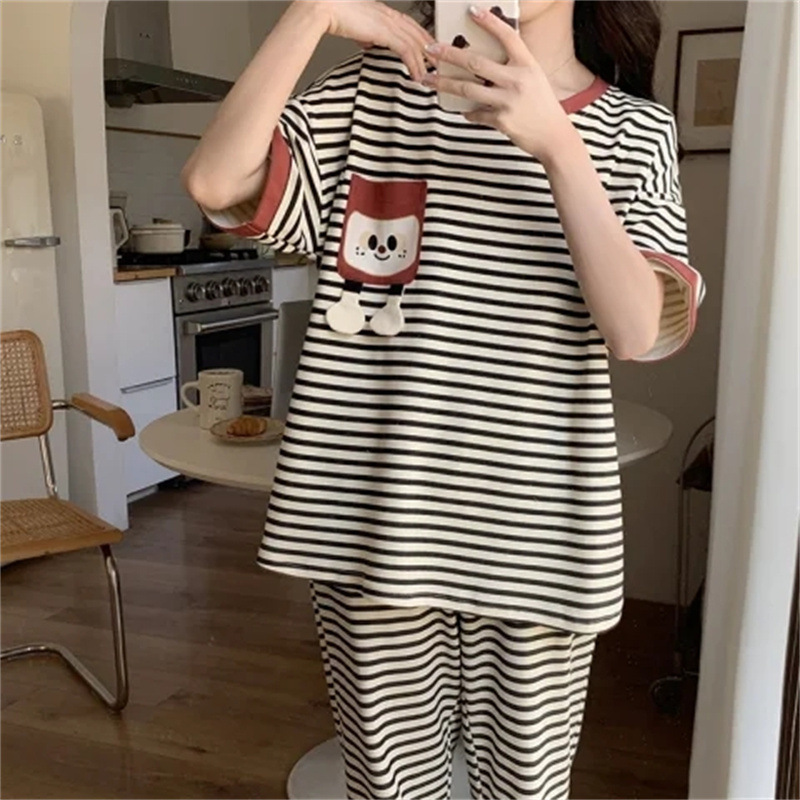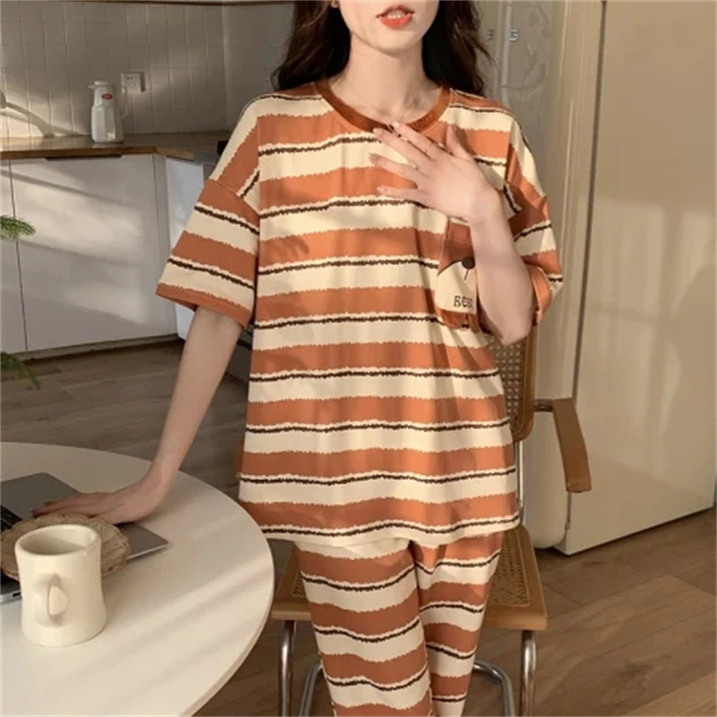 여름 모조 면 줄무늬 짧은 소매 바지 여성용 잠옷 여름 귀여운 둥근 목 달콤한 스타일 캐주얼 아웃웨어 홈 옷스토어 가기