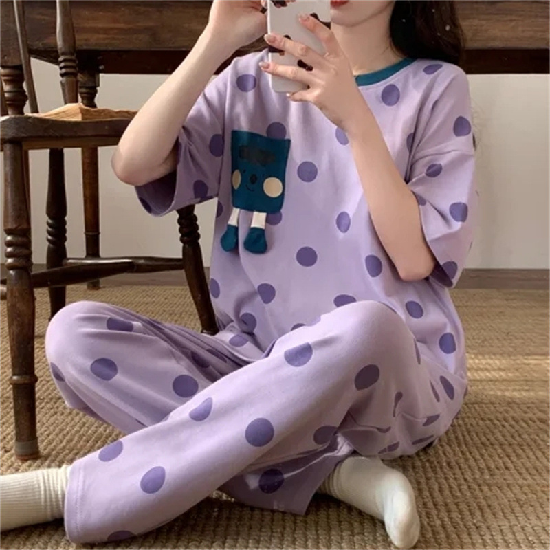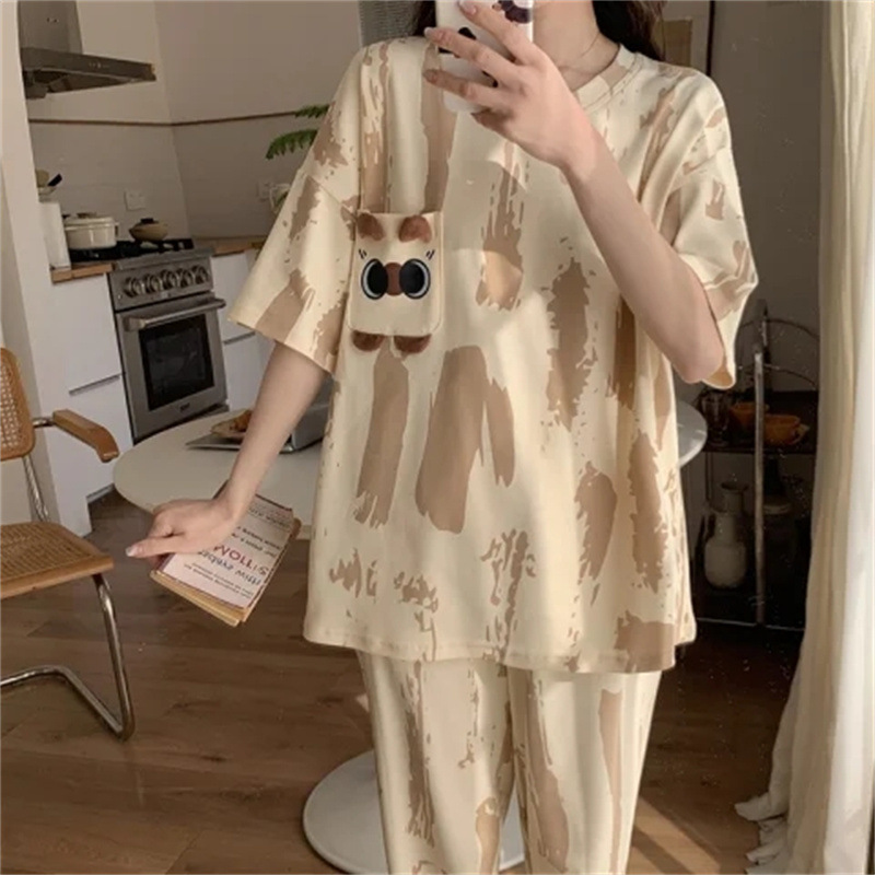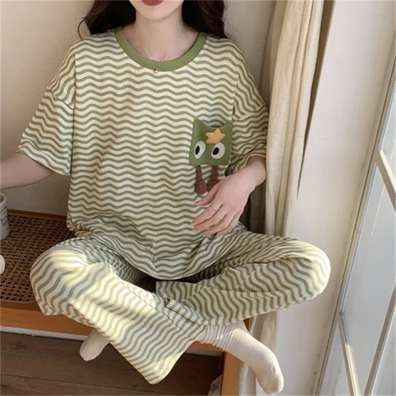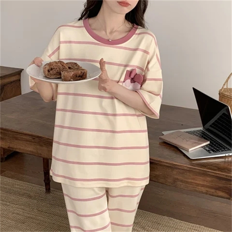 여름 모조 면 줄무늬 짧은 소매 바지 여성용 잠옷 여름 귀여운 둥근 목 달콤한 스타일 캐주얼 아웃웨어 홈 옷