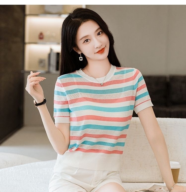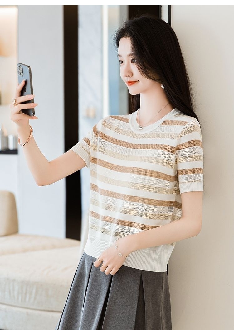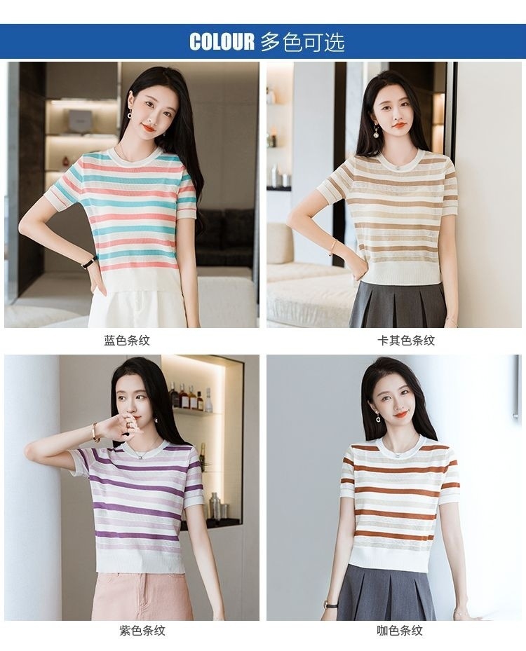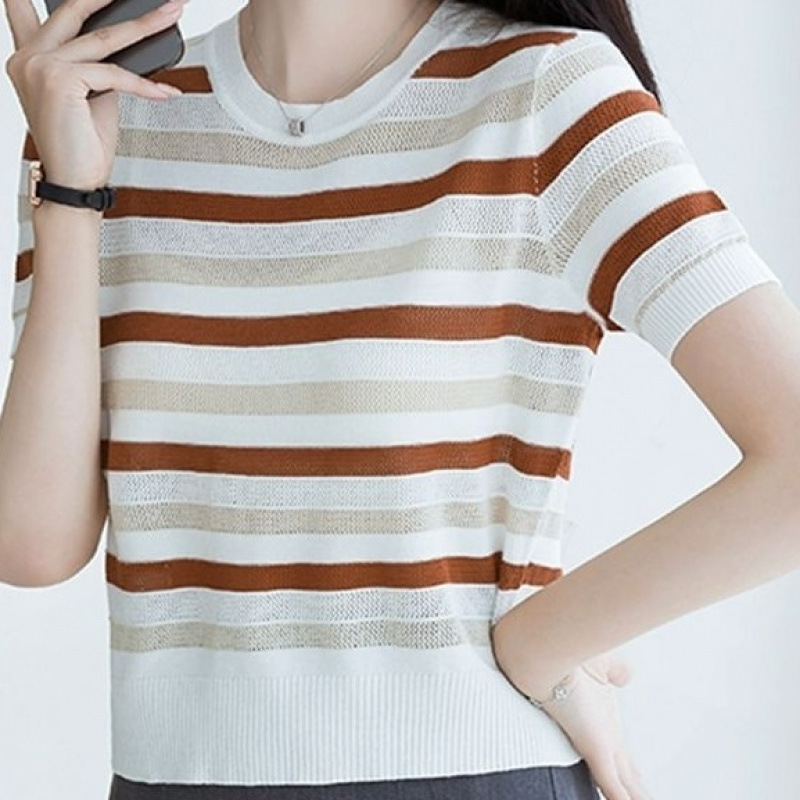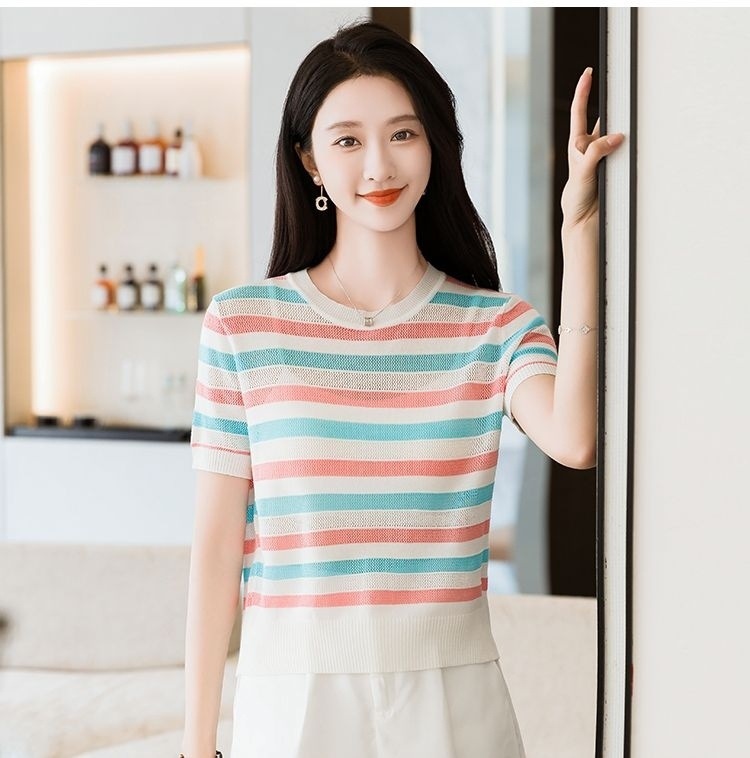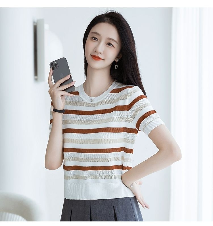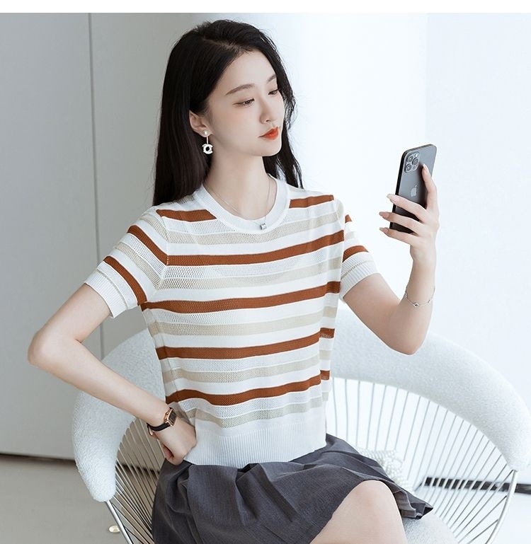 아이스 실크 스트라이프 티셔츠 여자 반팔 2025 여름 새로운 도착 유행 올매치 라운드 넥 스웨터 쇼트 탑 트렌디