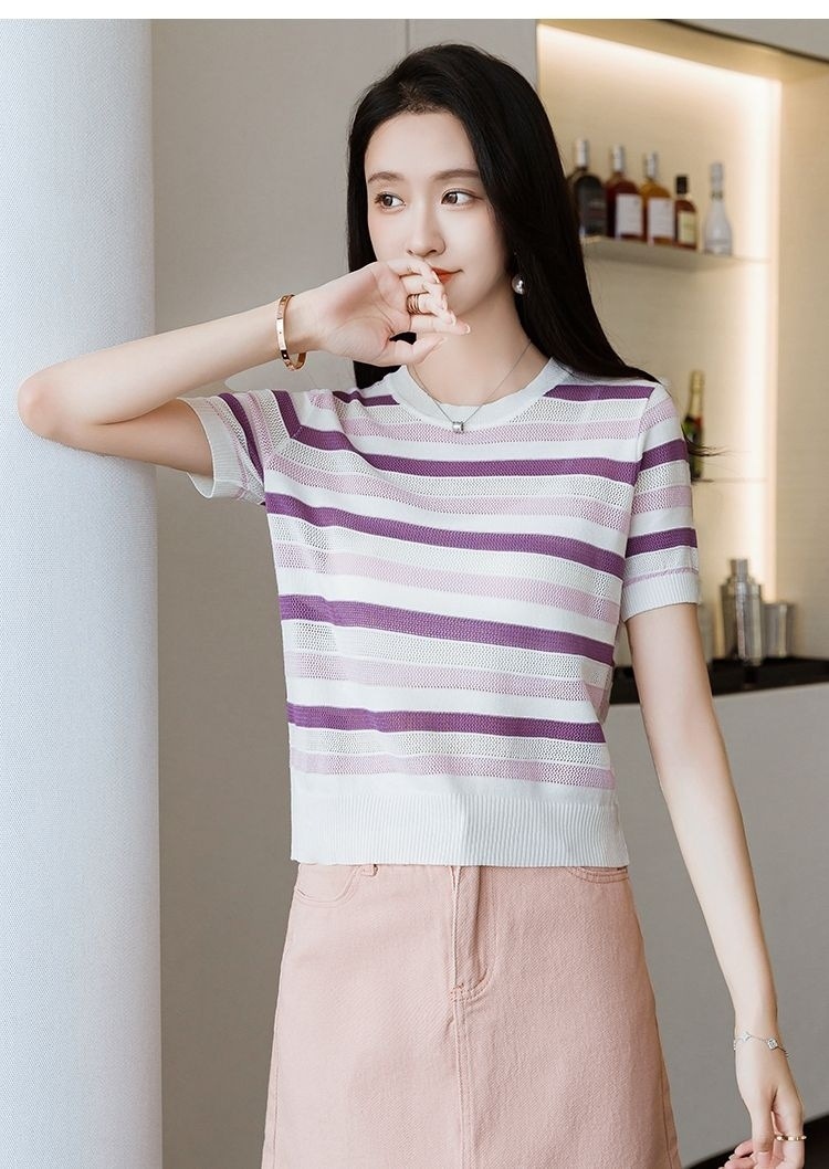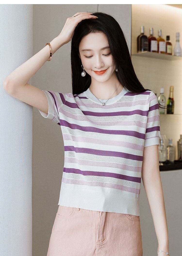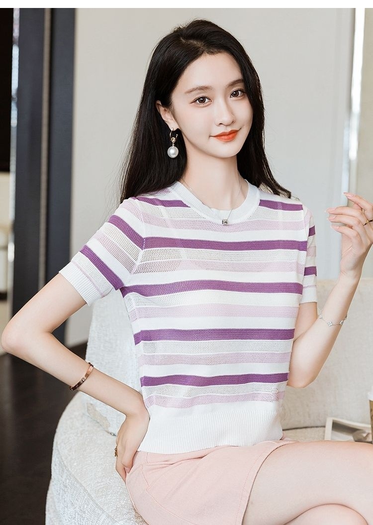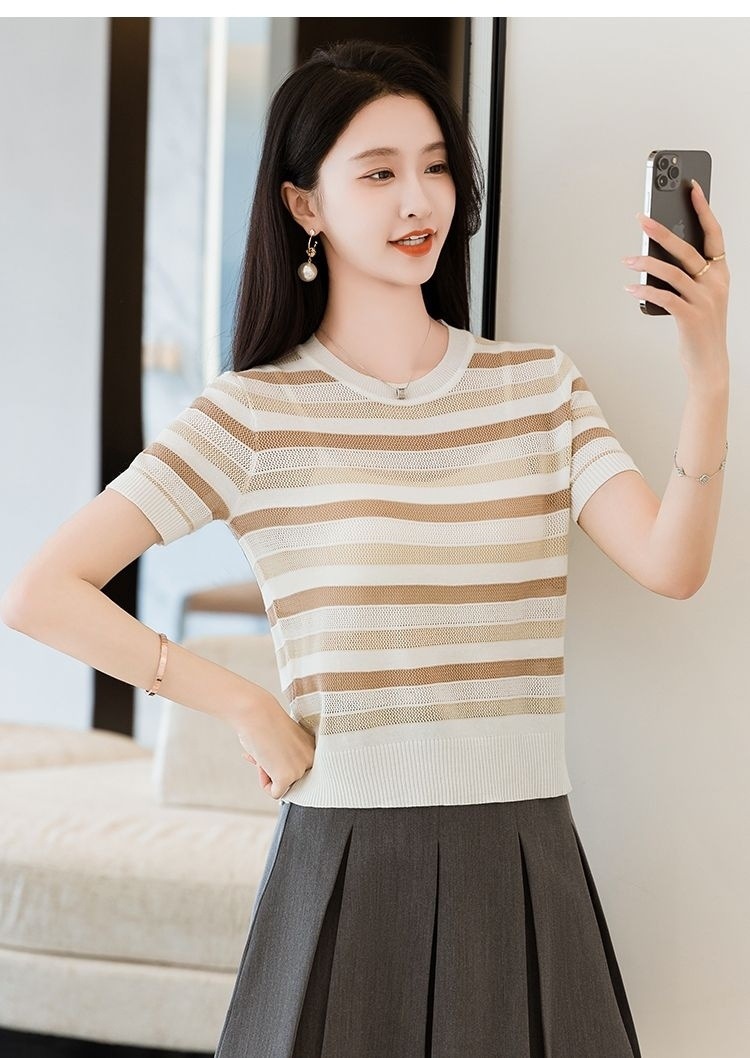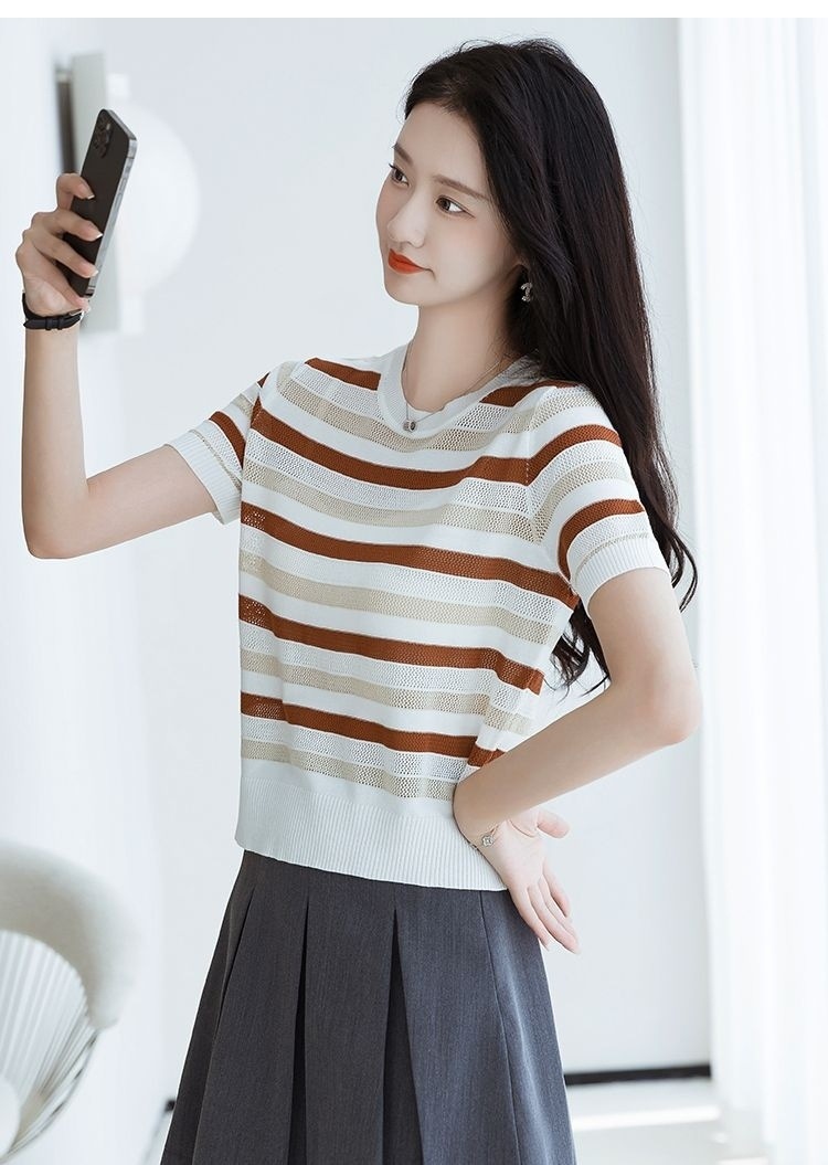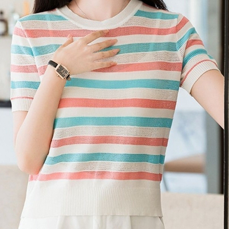 아이스 실크 스트라이프 티셔츠 여자 반팔 2025 여름 새로운 도착 유행 올매치 라운드 넥 스웨터 쇼트 탑 트렌디