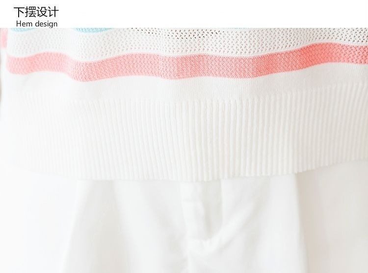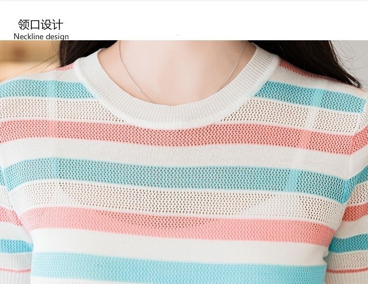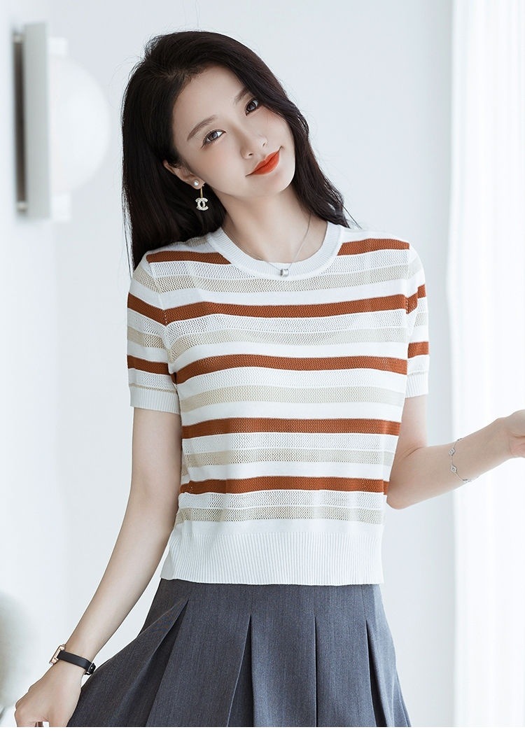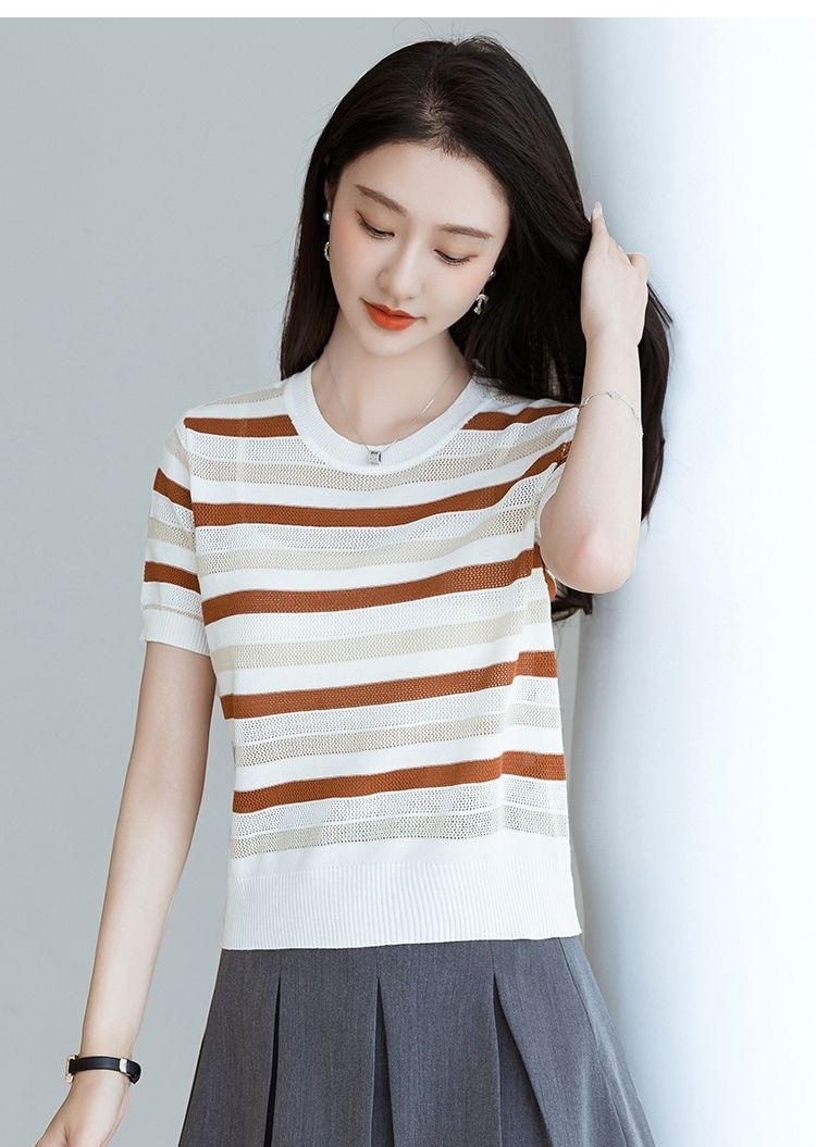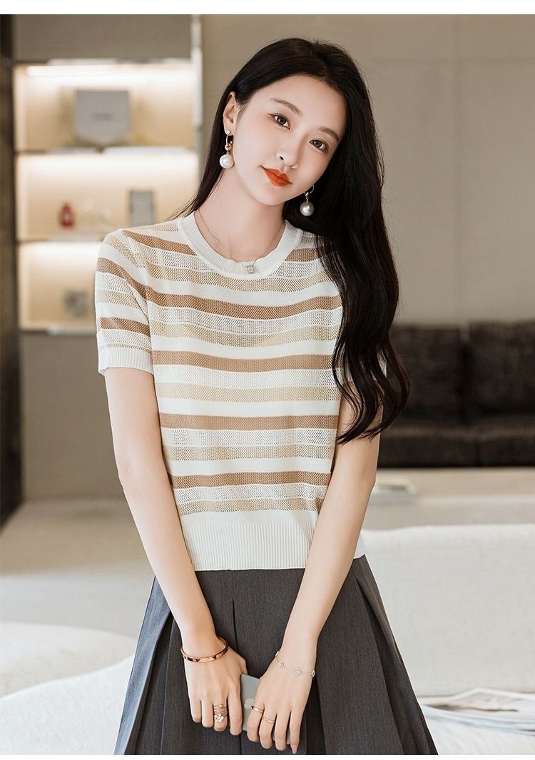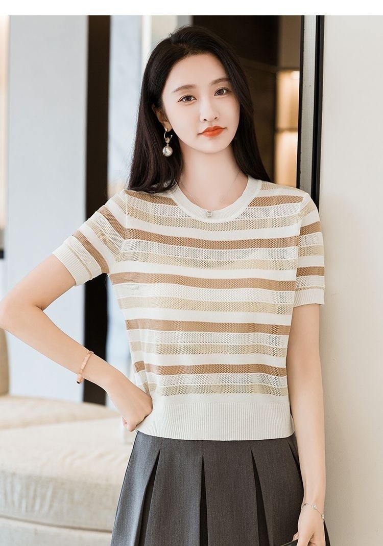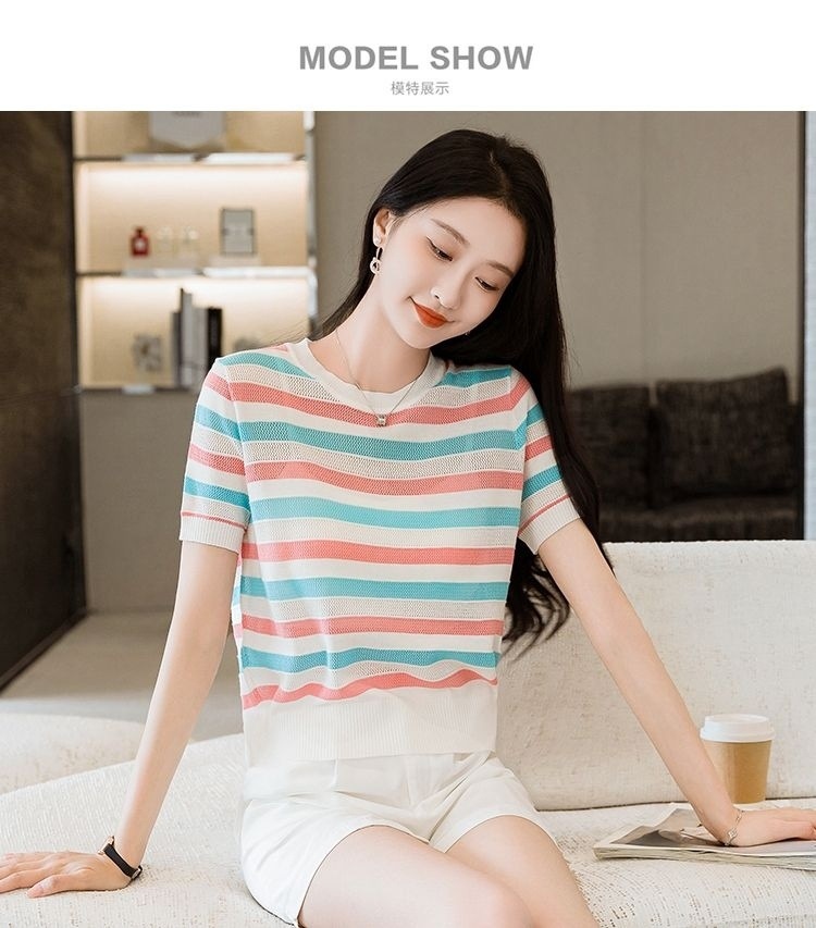 아이스 실크 스트라이프 티셔츠 여자 반팔 2025 여름 새로운 도착 유행 올매치 라운드 넥 스웨터 쇼트 탑 트렌디