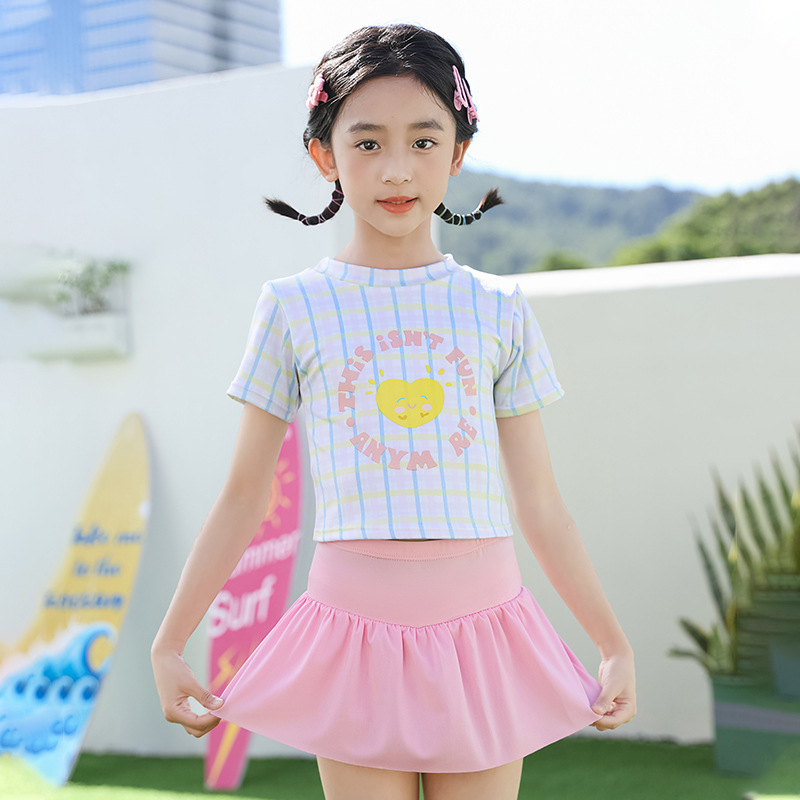어린이 격자 무늬 수영복 분할 치마 소녀 큰 어린이 서양식 귀여운 학생의 짧은 스커트 온천 비치 수영복스토어 가기