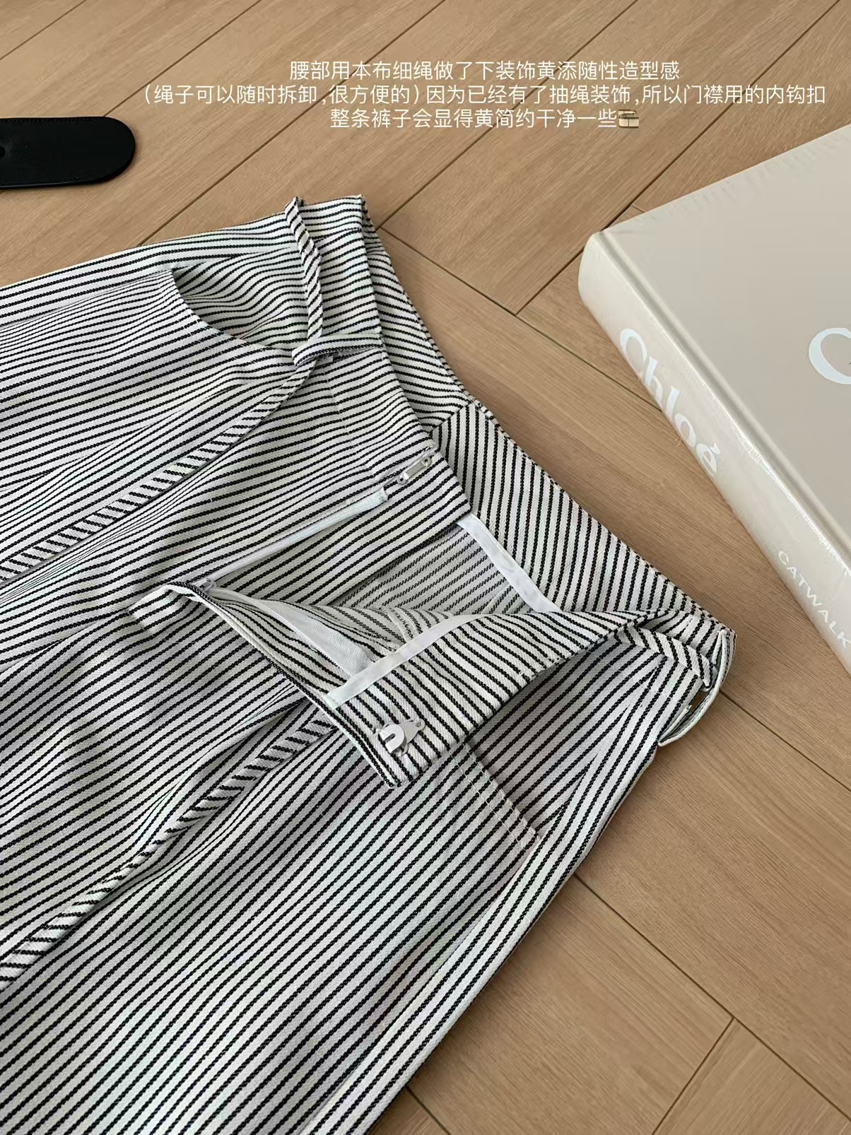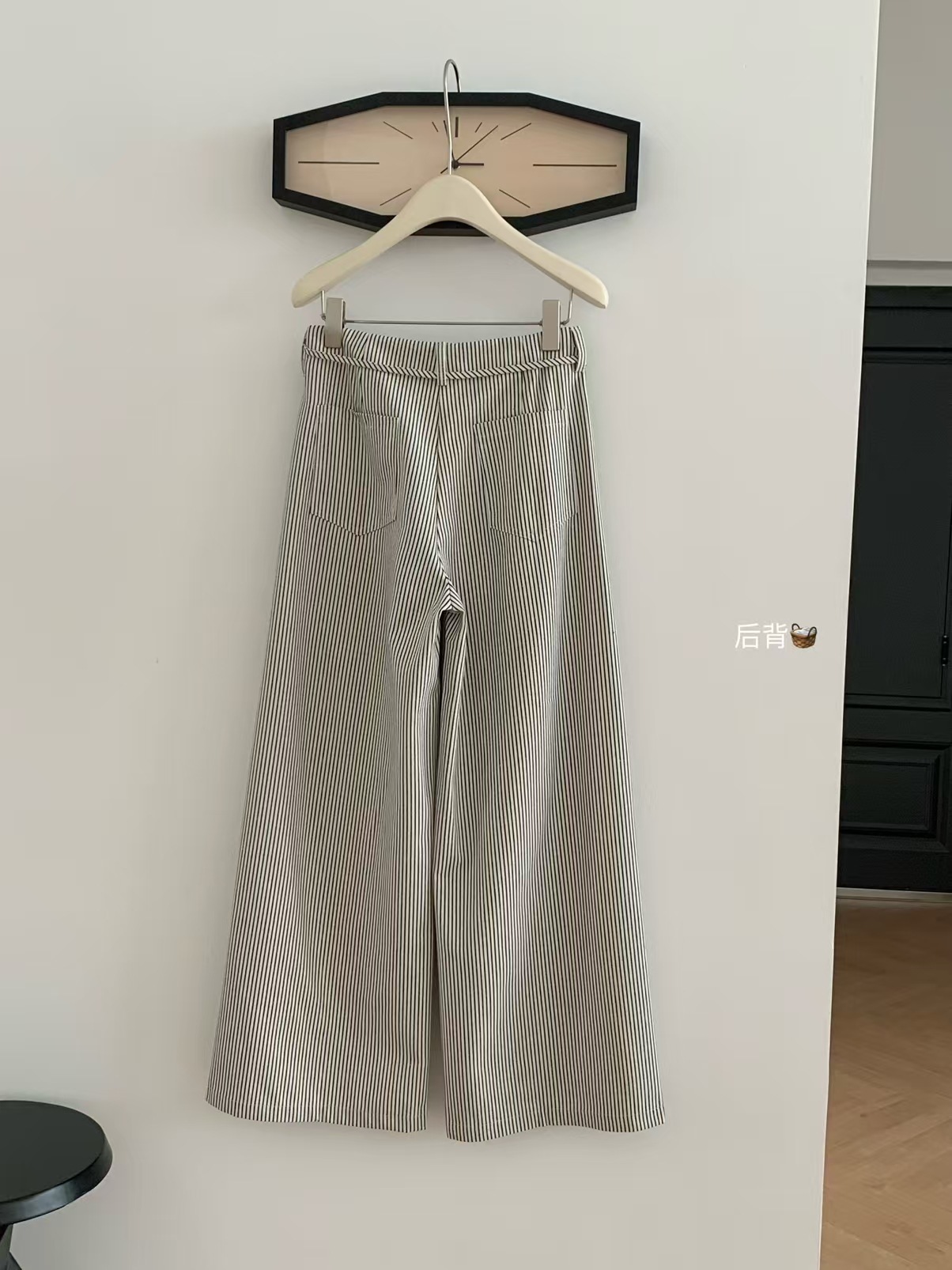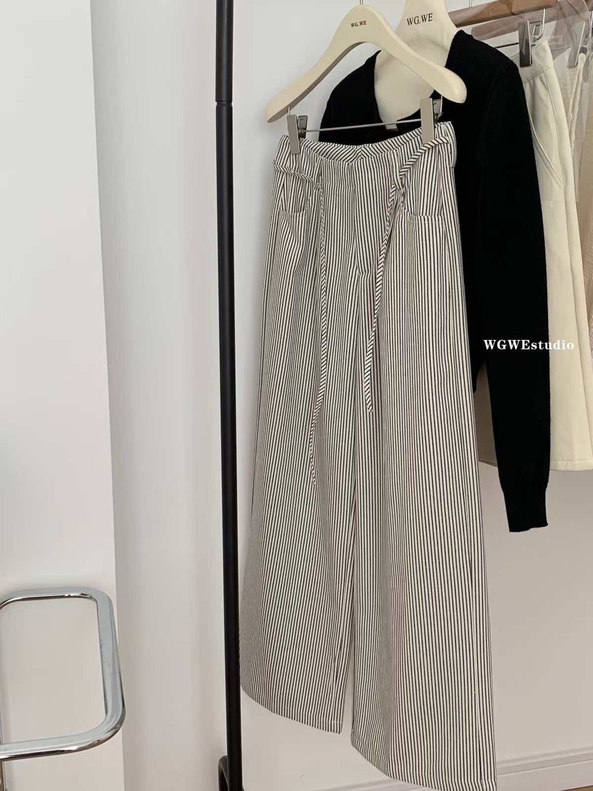 WGWE 한국 스타일 게으른 줄무늬 직선 캐주얼 바지 여성의 봄과 가을 디자인 느슨한 올 매치 와이드 다리 바지 (벨트 포함)스토어 가기