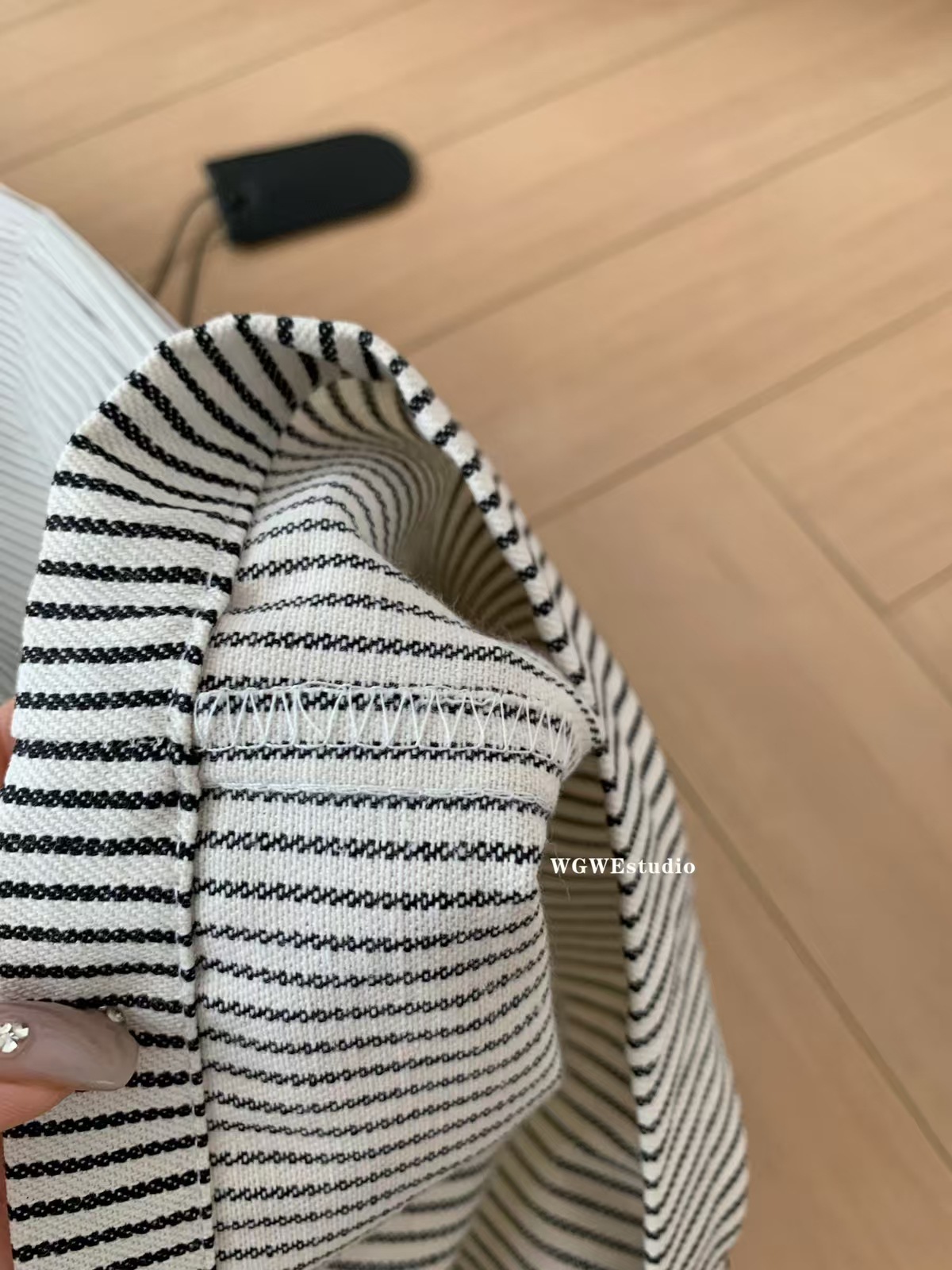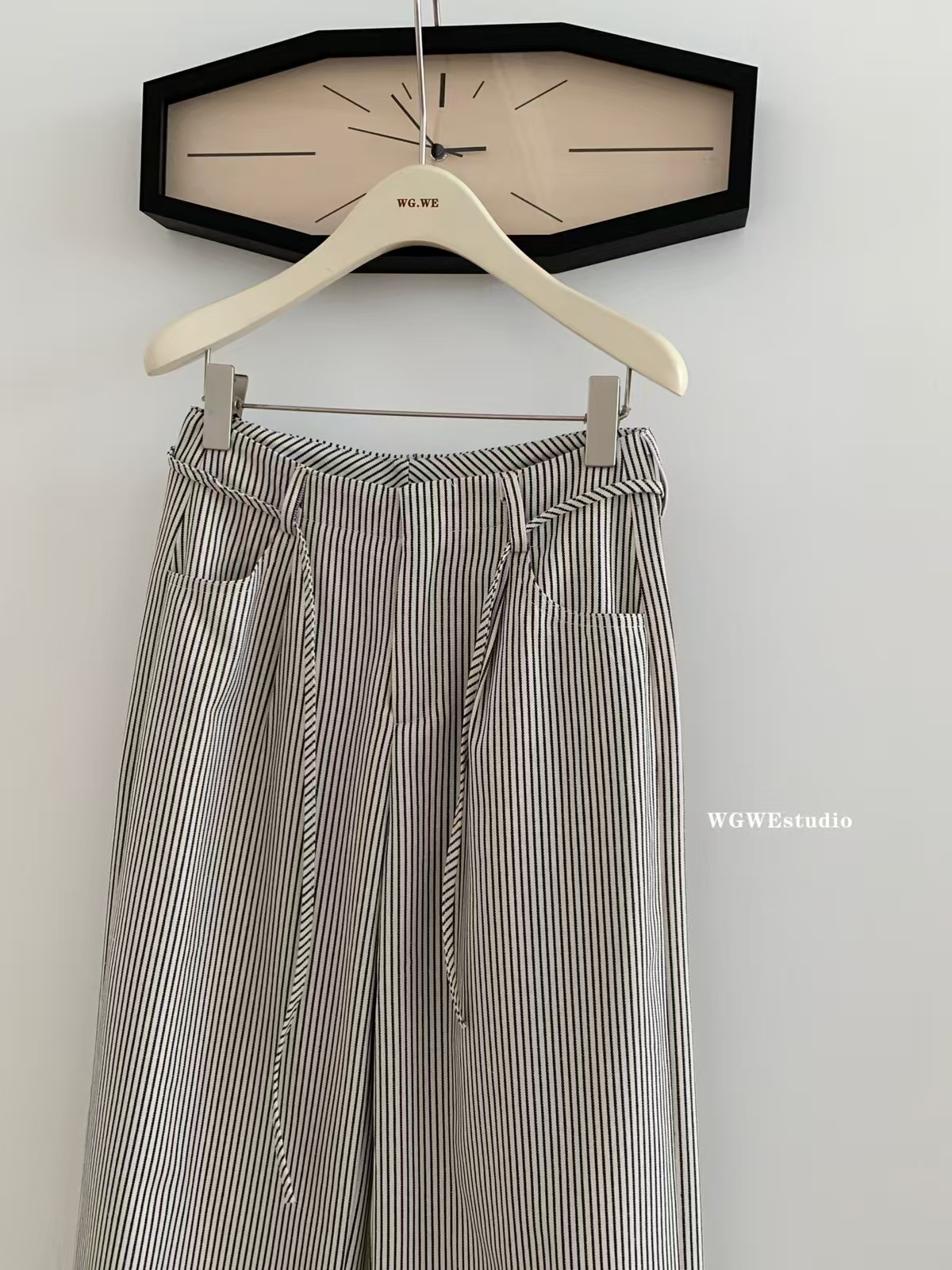 WGWE 한국 스타일 게으른 줄무늬 직선 캐주얼 바지 여성의 봄과 가을 디자인 느슨한 올 매치 와이드 다리 바지 (벨트 포함)