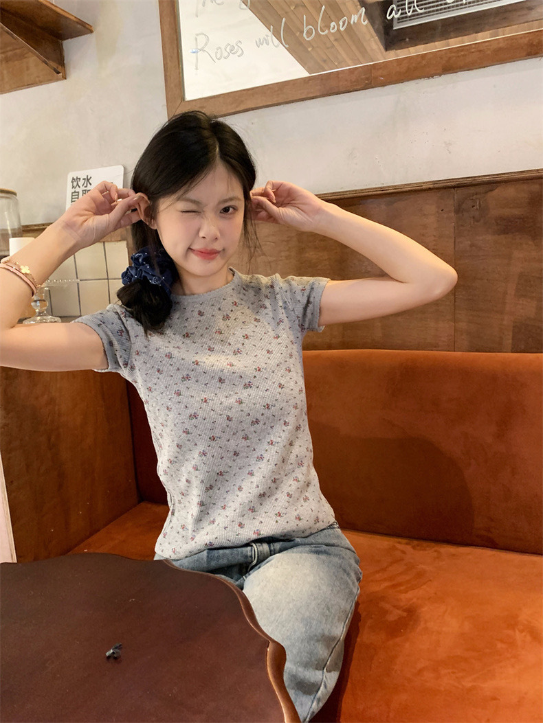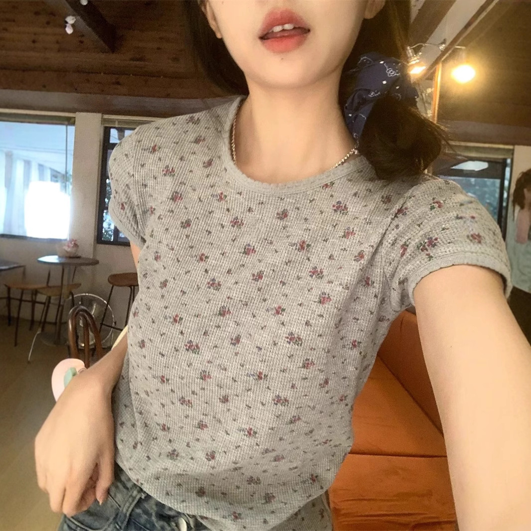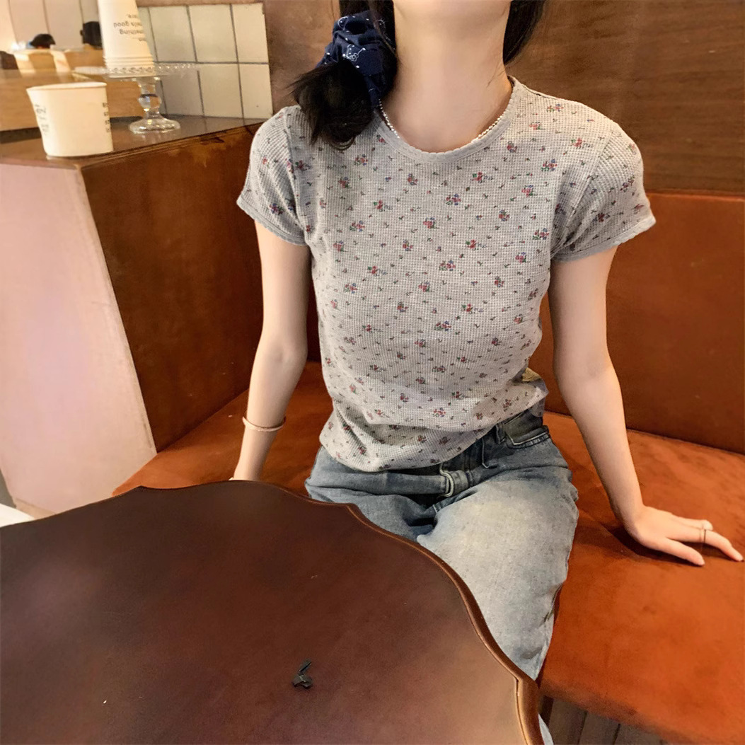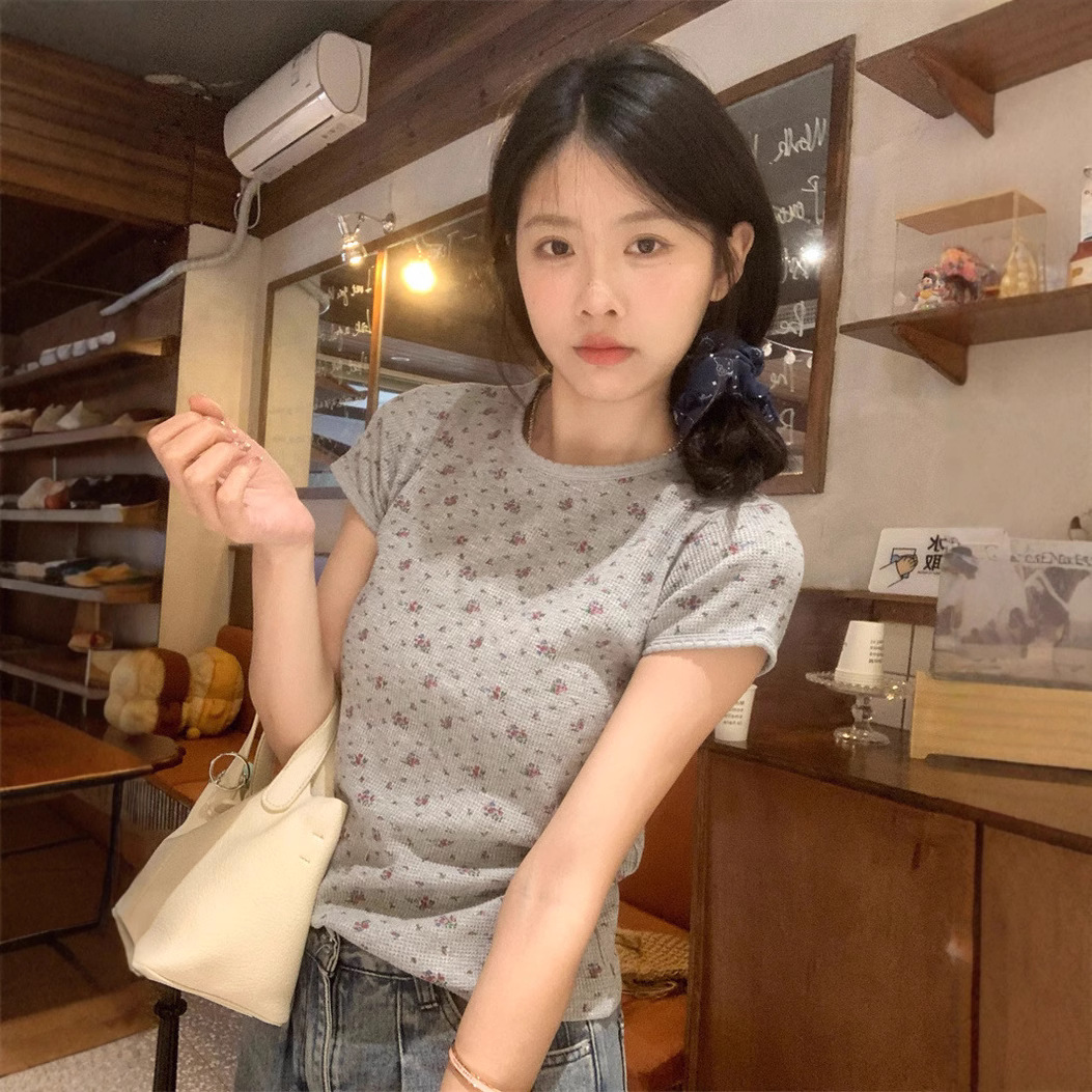 빈티지 신선한 작은 꽃 반팔 티셔츠 여성용 2025 년 봄과 여름 새로운 슬림 핏 슬리밍 와플렛베이스 셔츠 탑