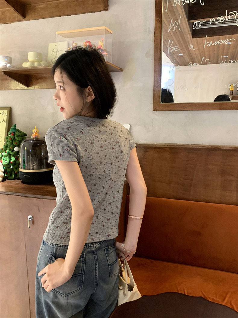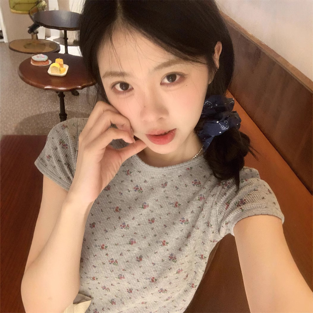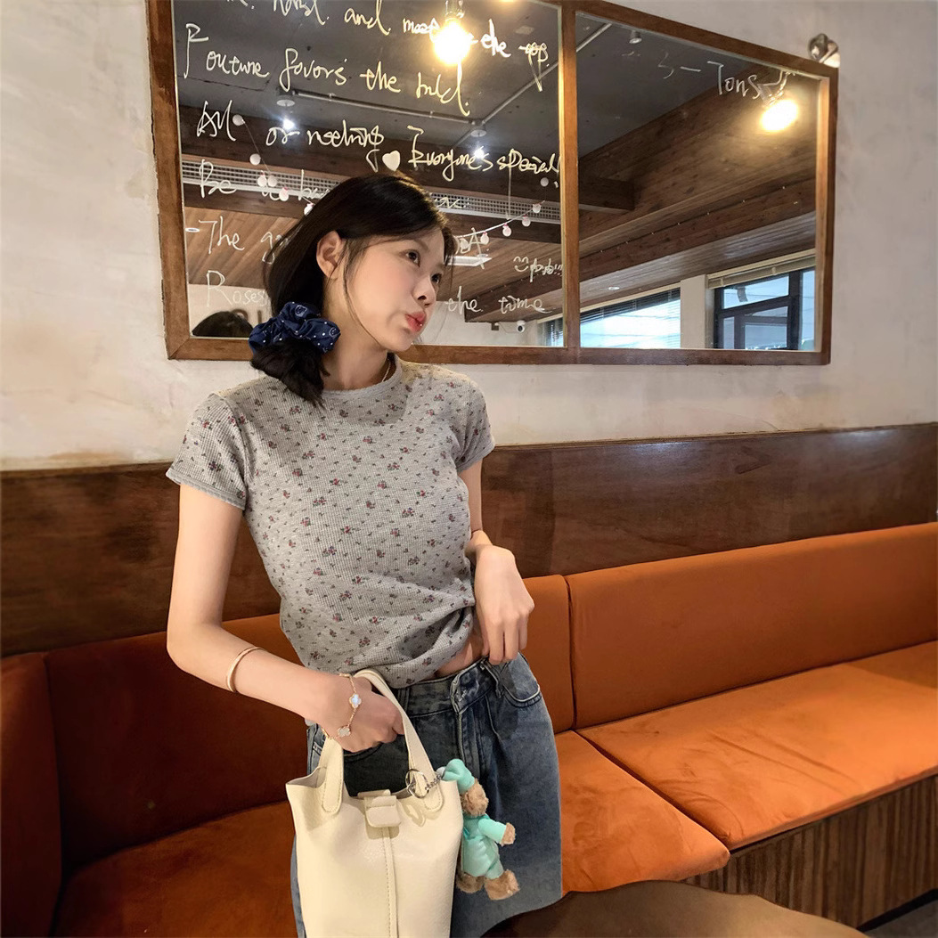 빈티지 신선한 작은 꽃 반팔 티셔츠 여성용 2025 년 봄과 여름 새로운 슬림 핏 슬리밍 와플렛베이스 셔츠 탑스토어 가기