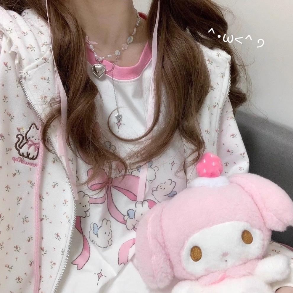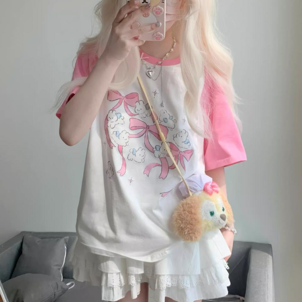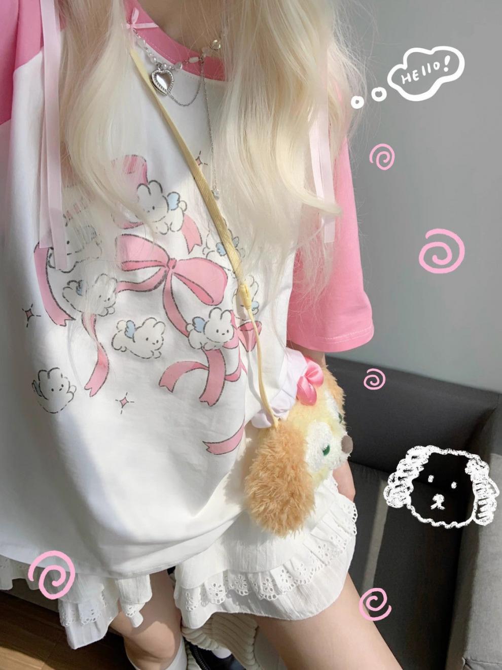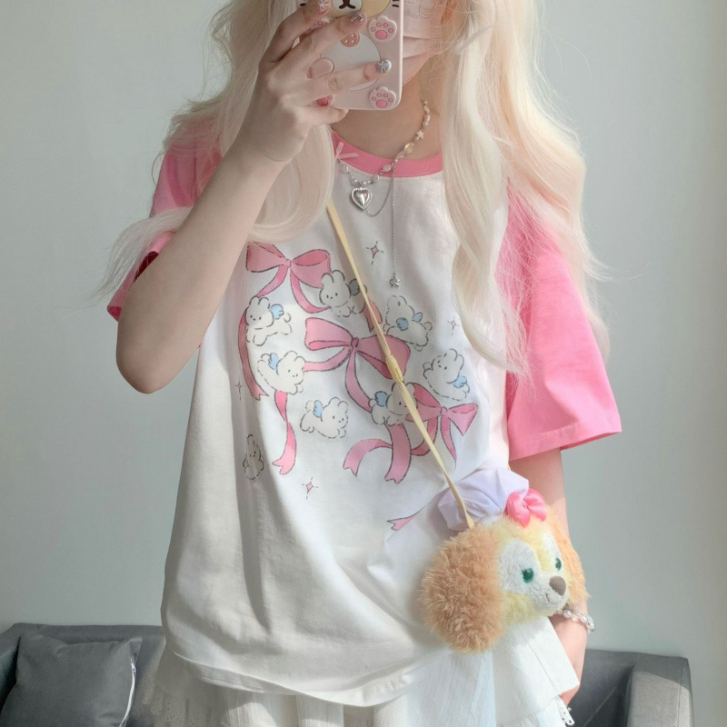 2025 여름 새로운 일본식 대비 컬러 만화 인쇄 어깨 반팔 티셔츠 여성용 귀여운 느슨한 올 매치 탑 Ins