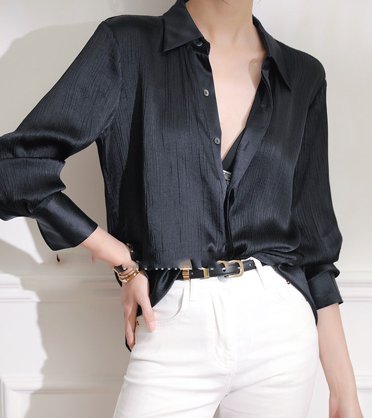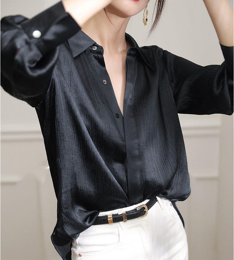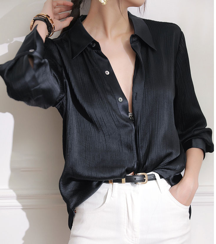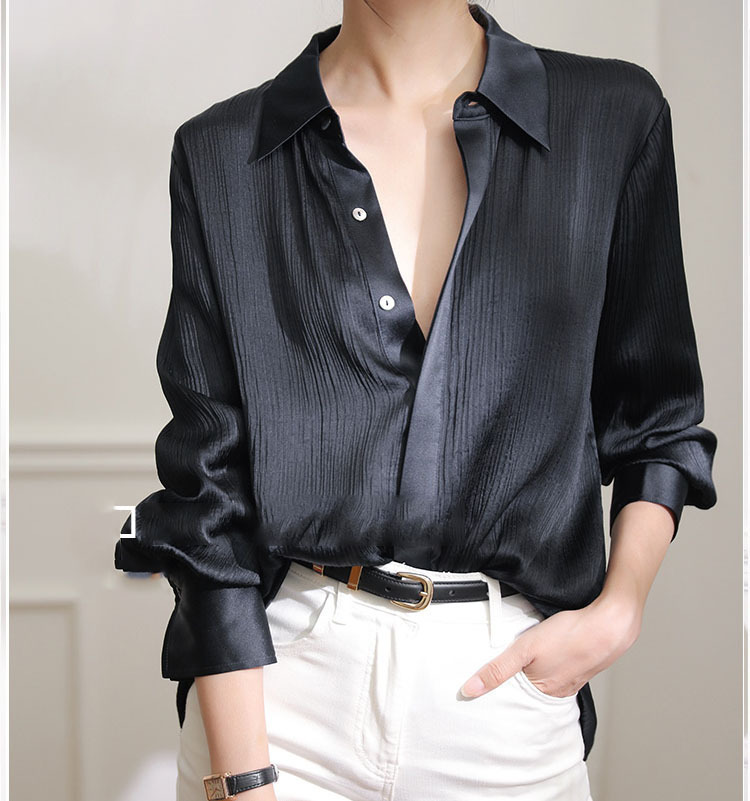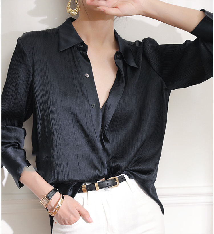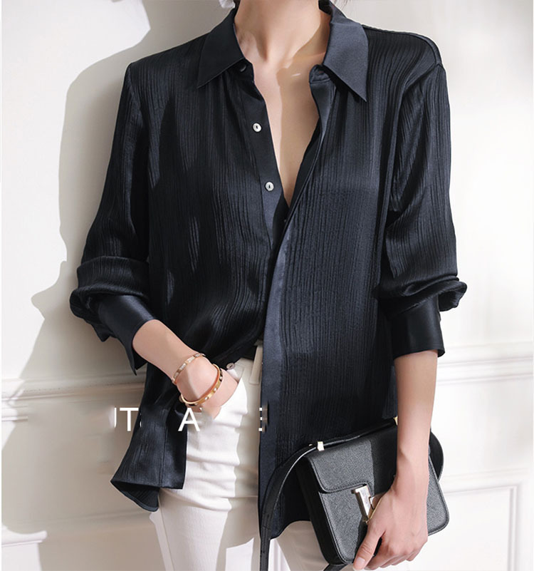 Acetic Acid 셔츠 여성용 긴팔 하이 엔드 플리츠 하이 엔드 퓨어 컬러 우아한 실크 셔츠 여성용 느슨한 구리 암모니아 실크 탑스토어 가기