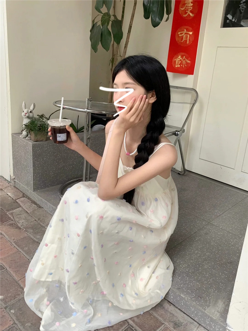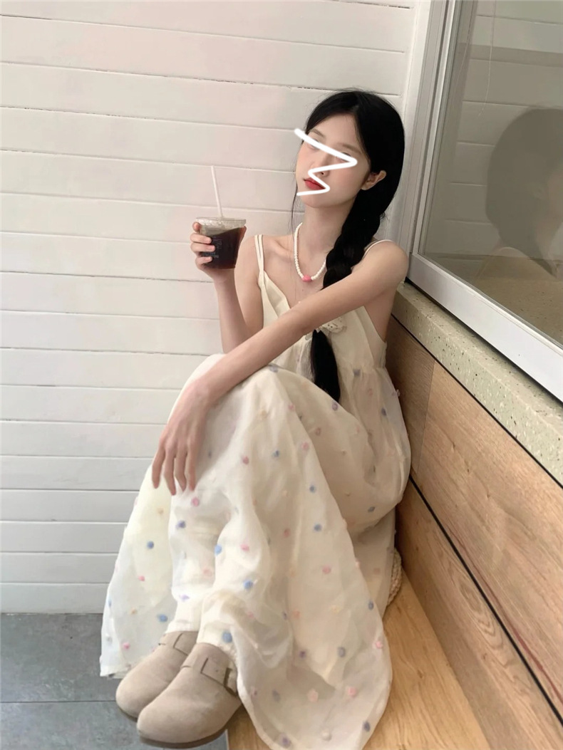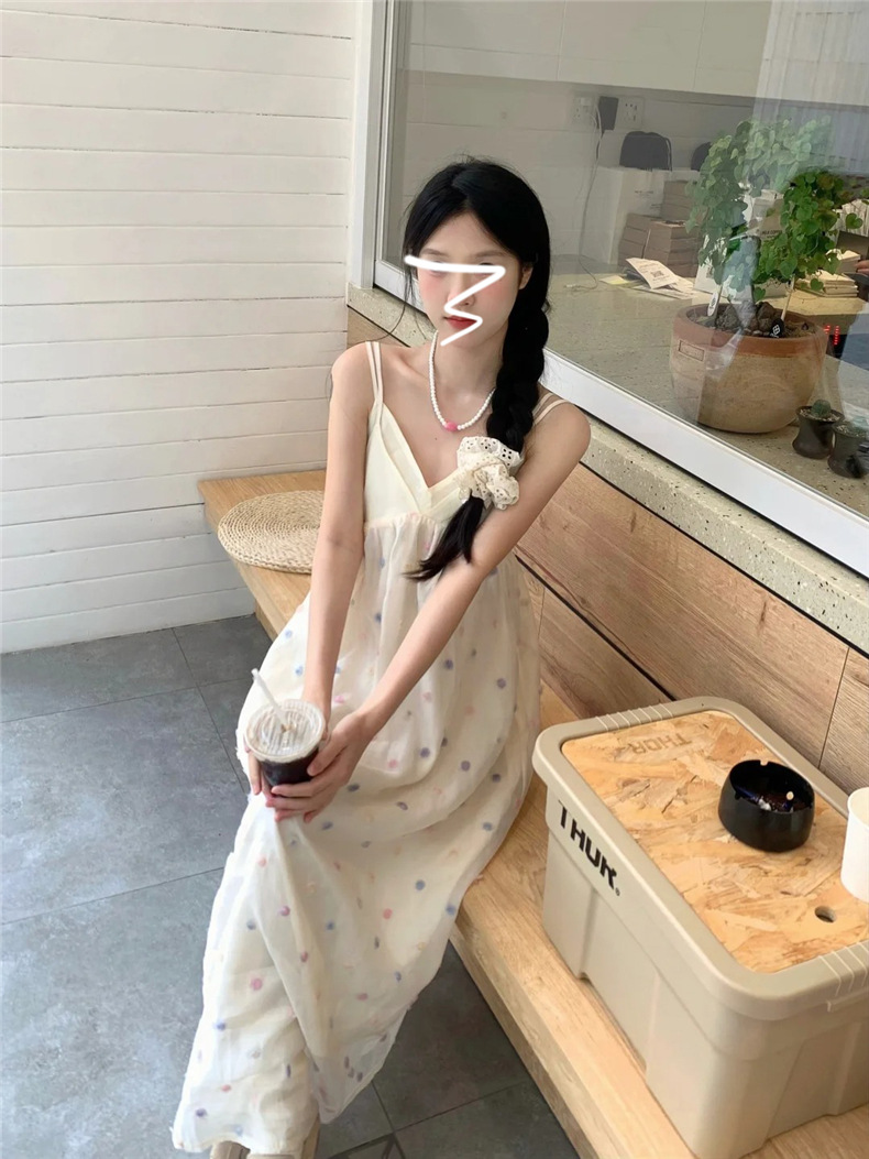 화려한 웨이브 도트 V 넥 슬링 원피스 여성 여름 해변 휴일 스타일 긴 원피스 한국 스타일 달콤한 느슨한 A 라인 원피스