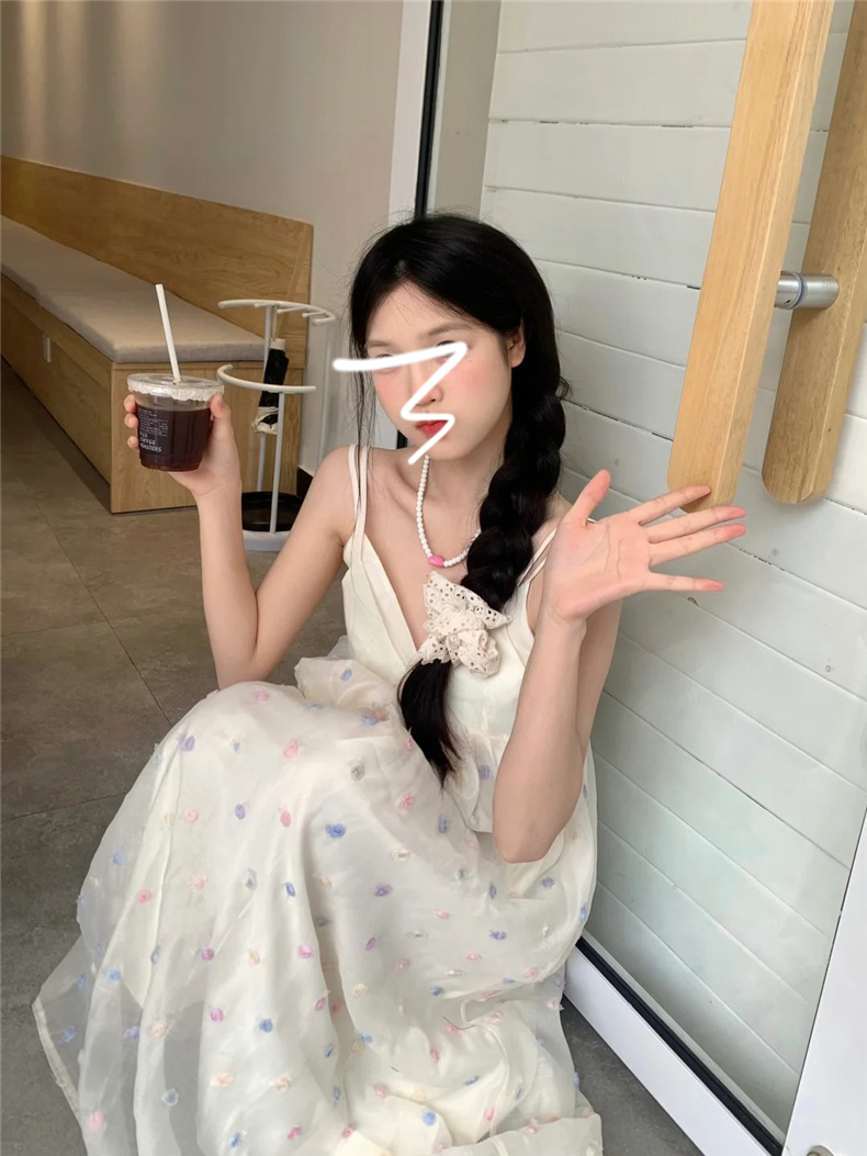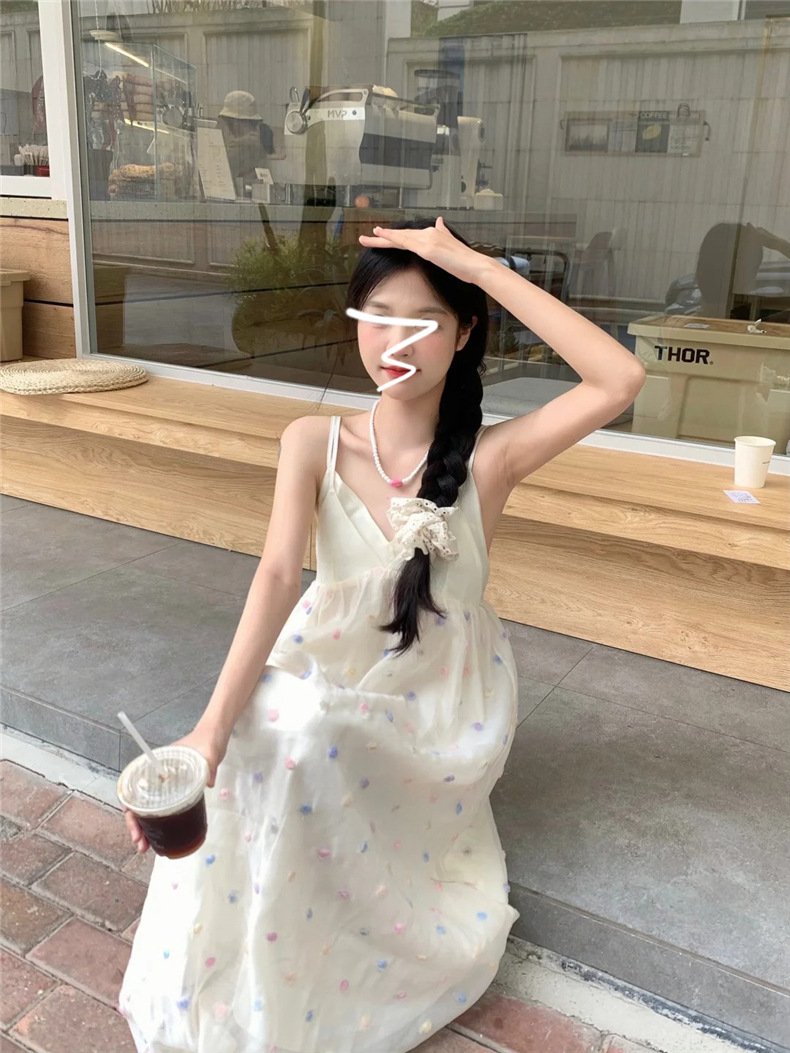 화려한 웨이브 도트 V 넥 슬링 원피스 여성 여름 해변 휴일 스타일 긴 원피스 한국 스타일 달콤한 느슨한 A 라인 원피스스토어 가기