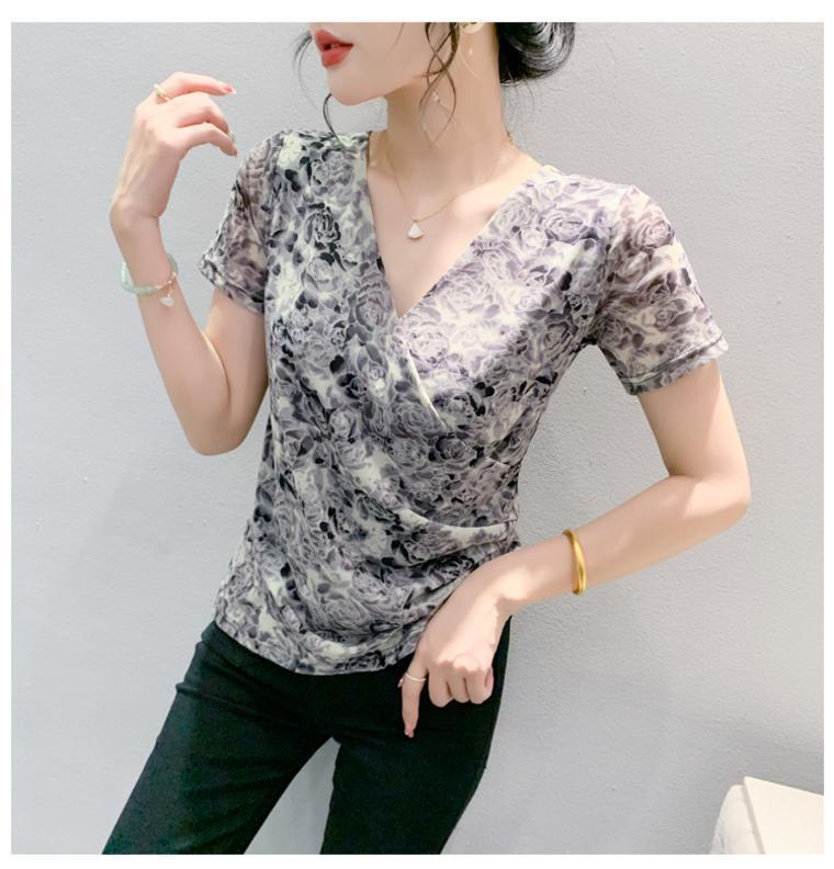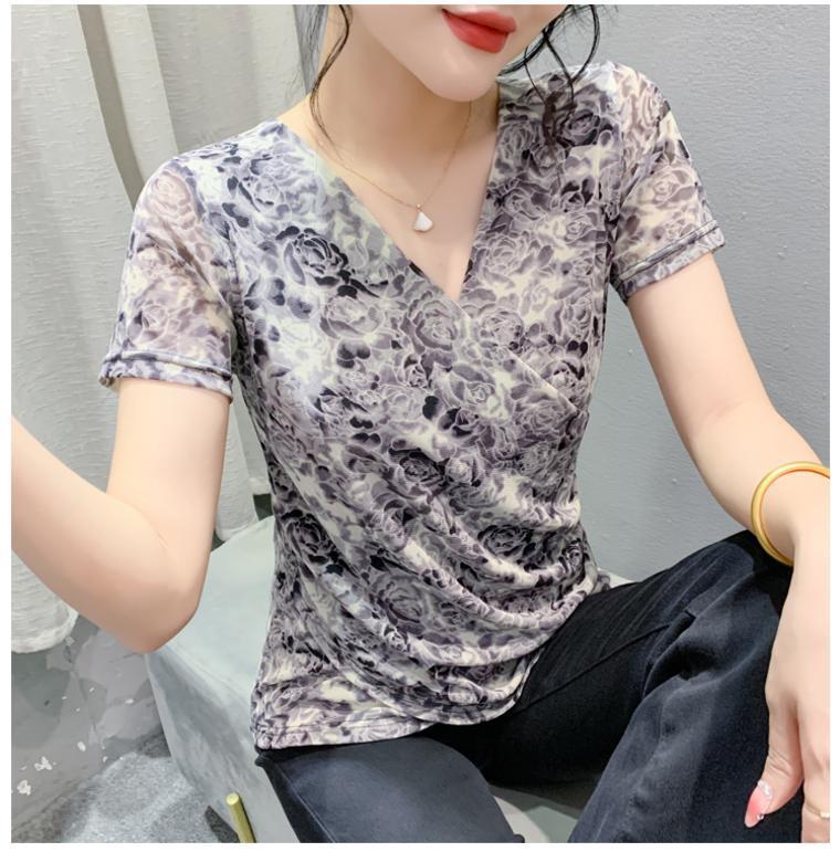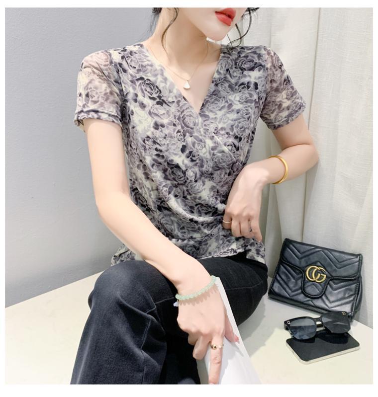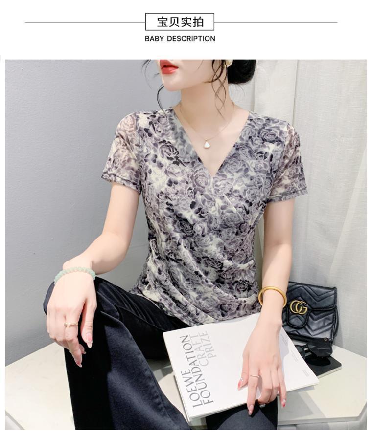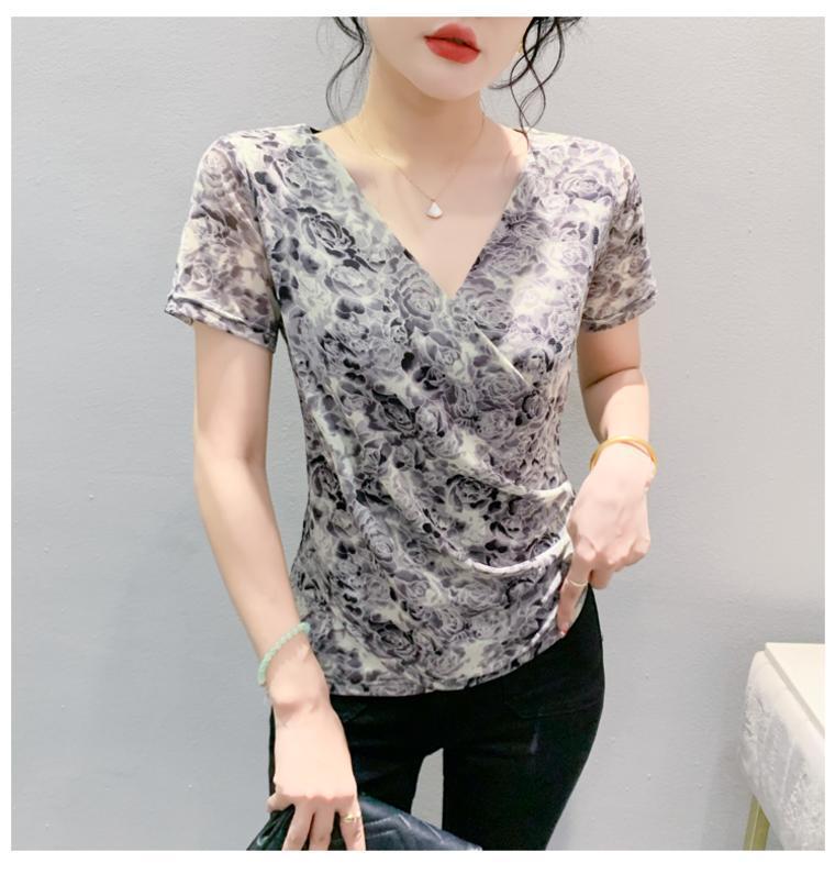 2025 여름 새로운 스타일의 어머니 원피스 패션 인쇄 V 넥 풀오버 메쉬 반팔 티셔츠 여성 꽃 탑 작은 셔츠스토어 가기