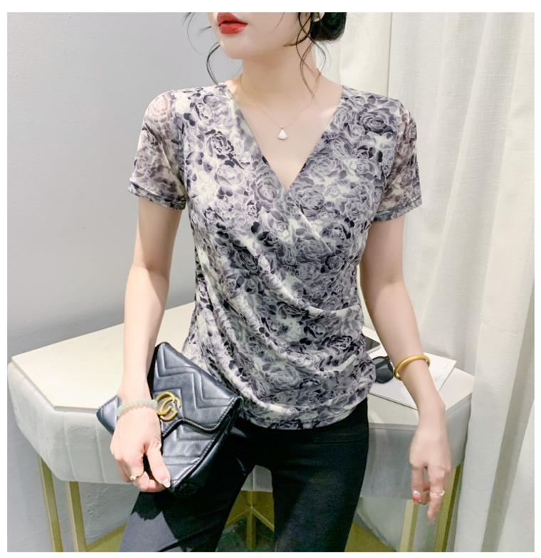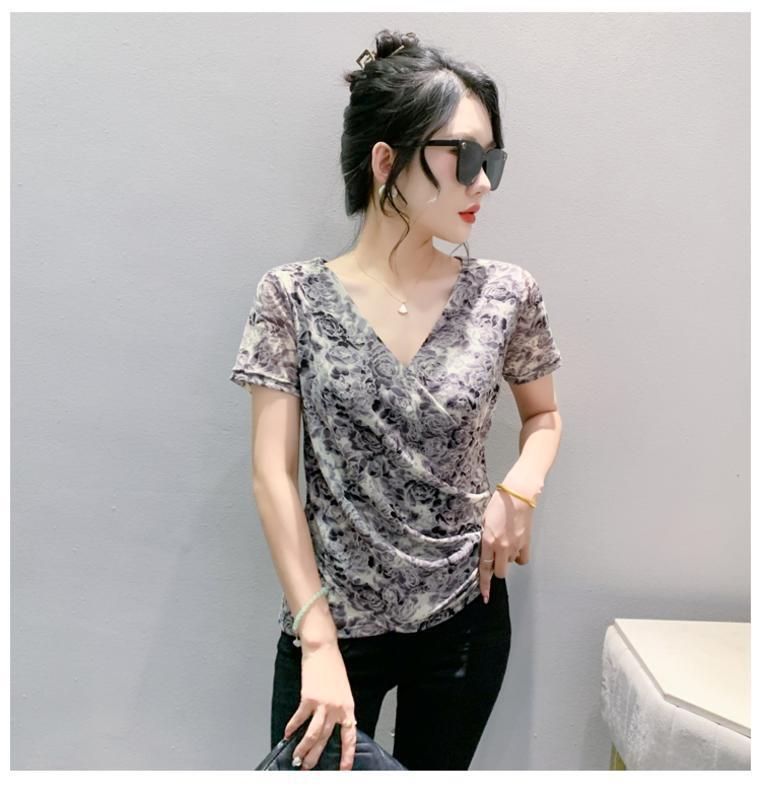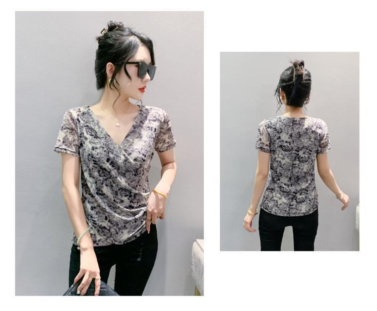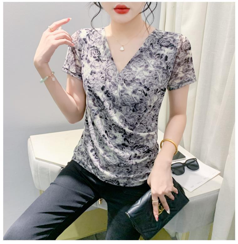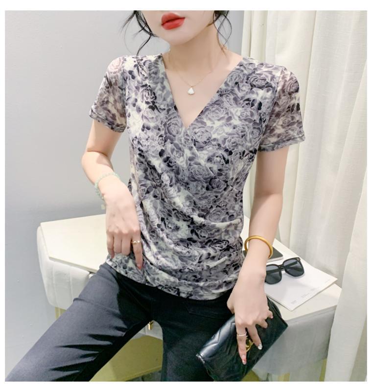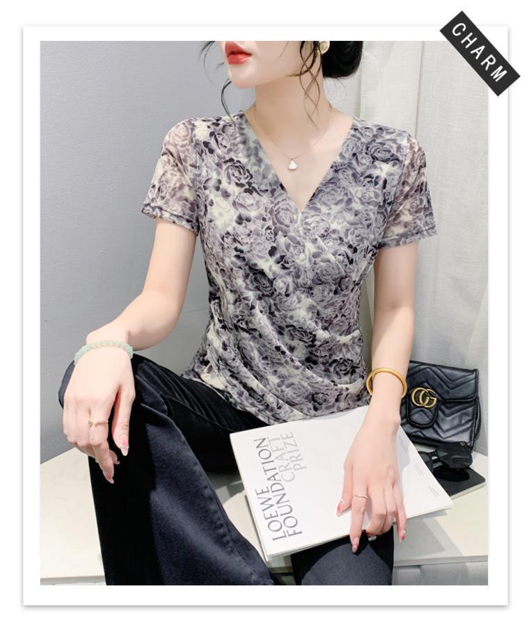 2025 여름 새로운 스타일의 어머니 원피스 패션 인쇄 V 넥 풀오버 메쉬 반팔 티셔츠 여성 꽃 탑 작은 셔츠스토어 가기