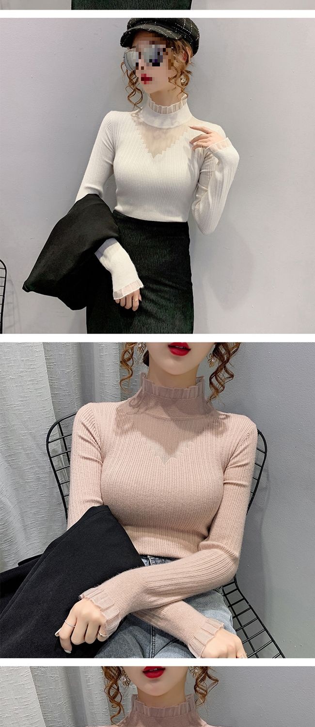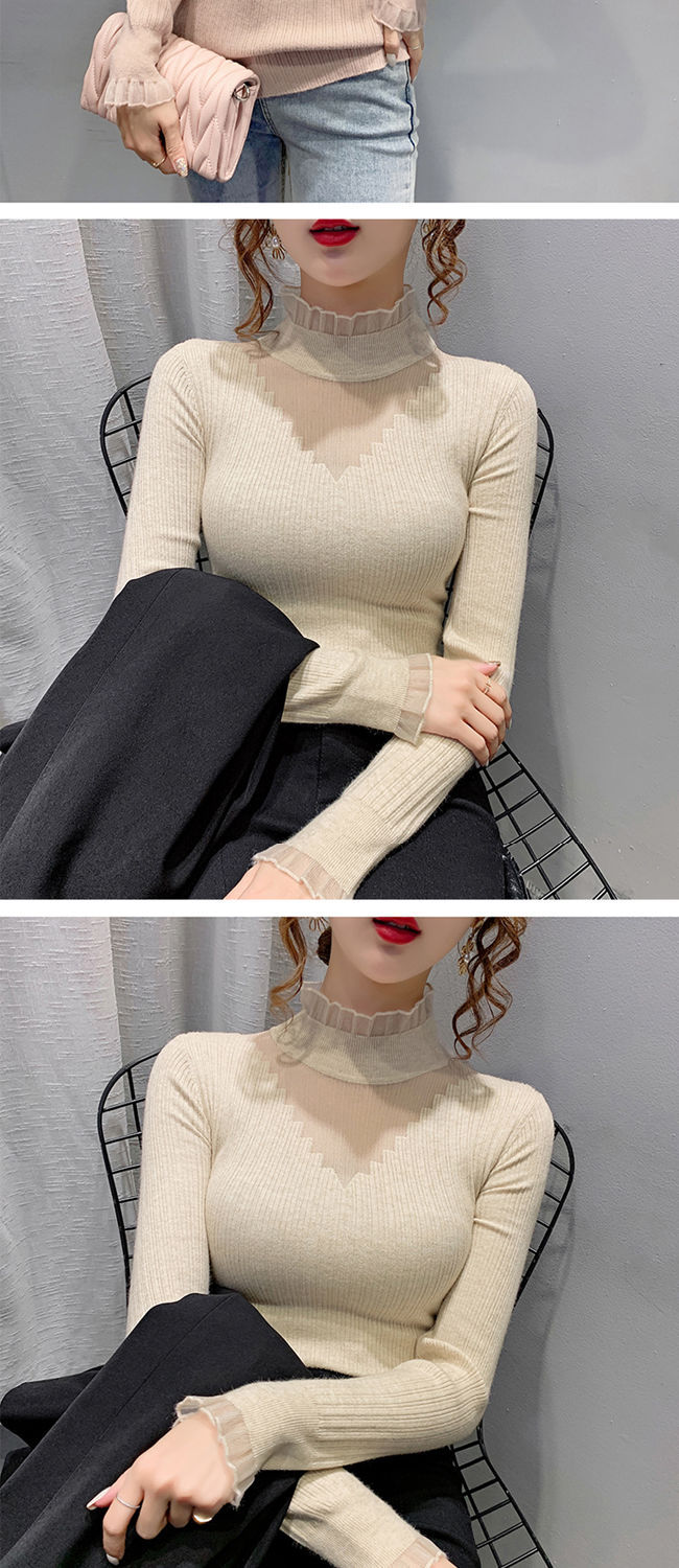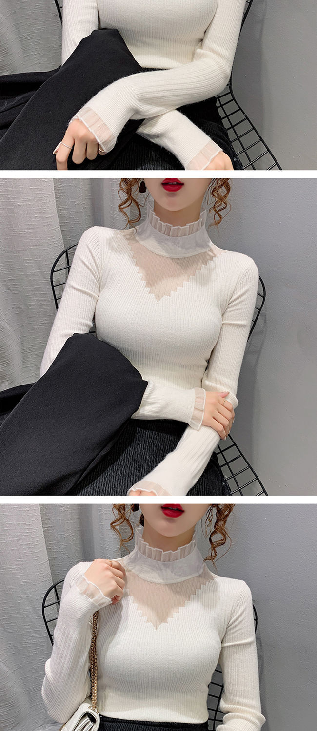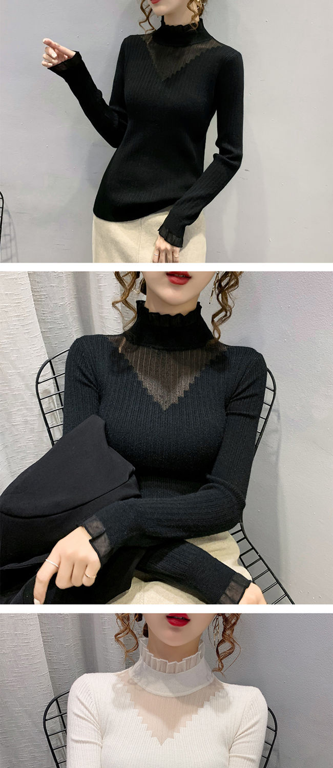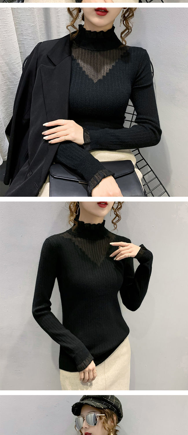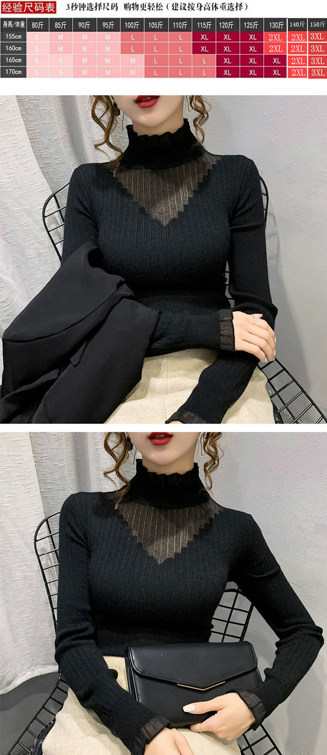 하프 터틀넥 레이스 스티칭 할로우 스웨터 여성 가을 및 겨울 새로운 서양식 슬림 핏 내부 니트 베이스 셔츠 여성용 탑
