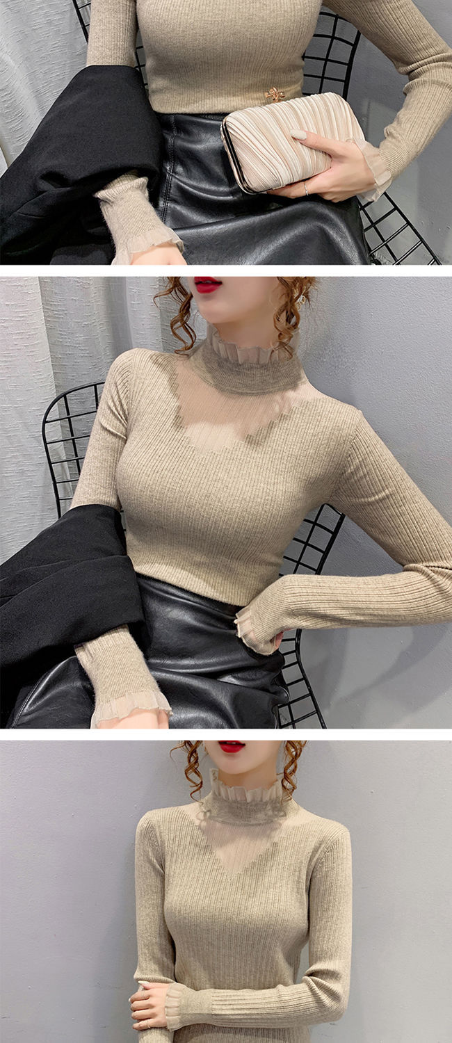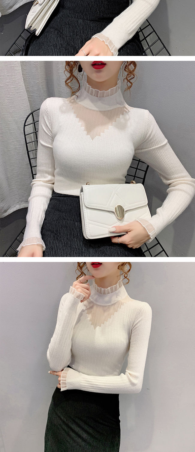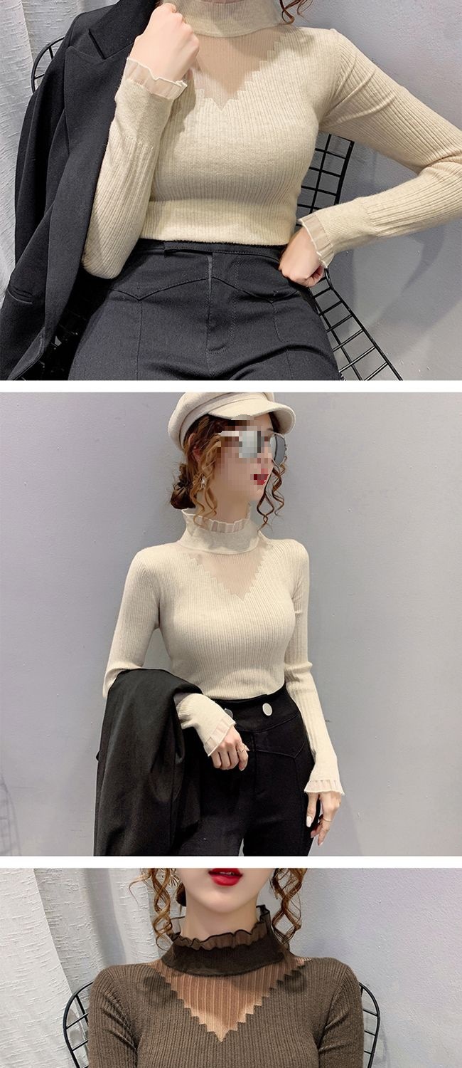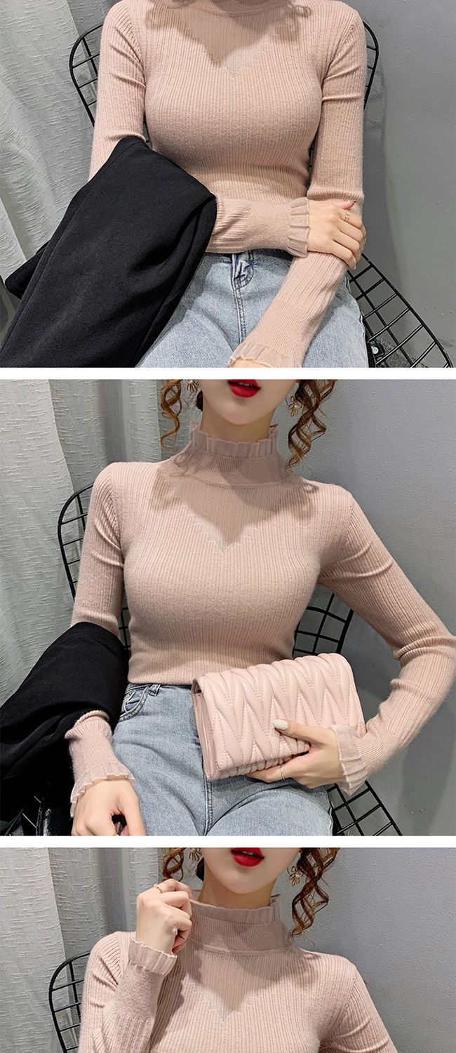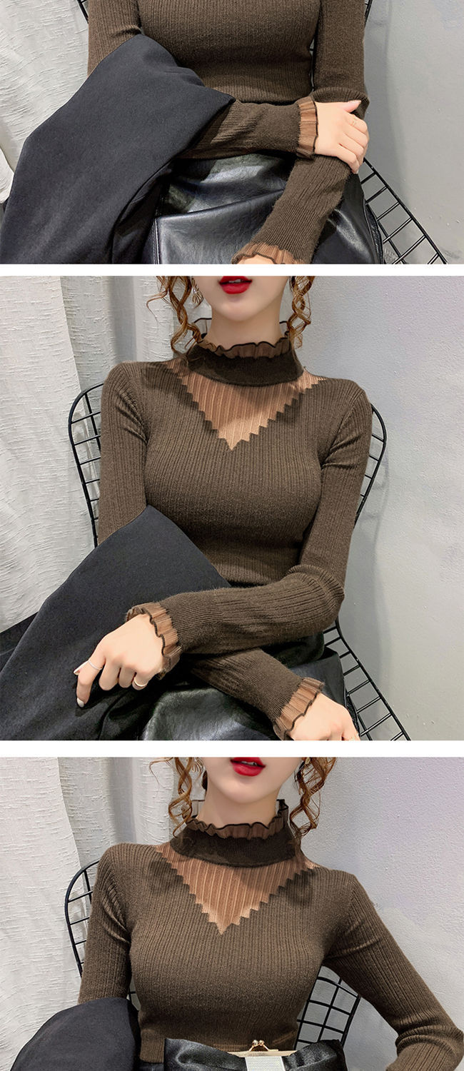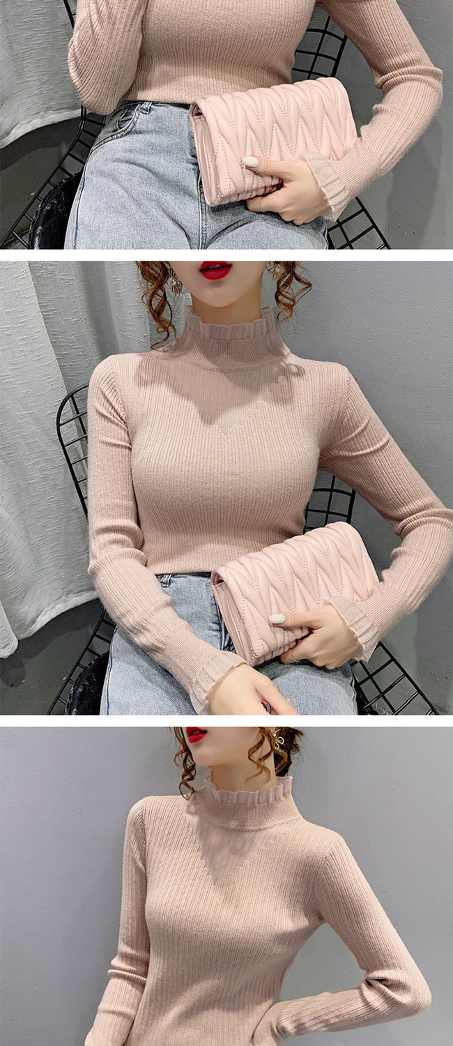 하프 터틀넥 레이스 스티칭 할로우 스웨터 여성 가을 및 겨울 새로운 서양식 슬림 핏 내부 니트 베이스 셔츠 여성용 탑