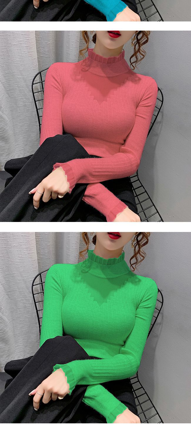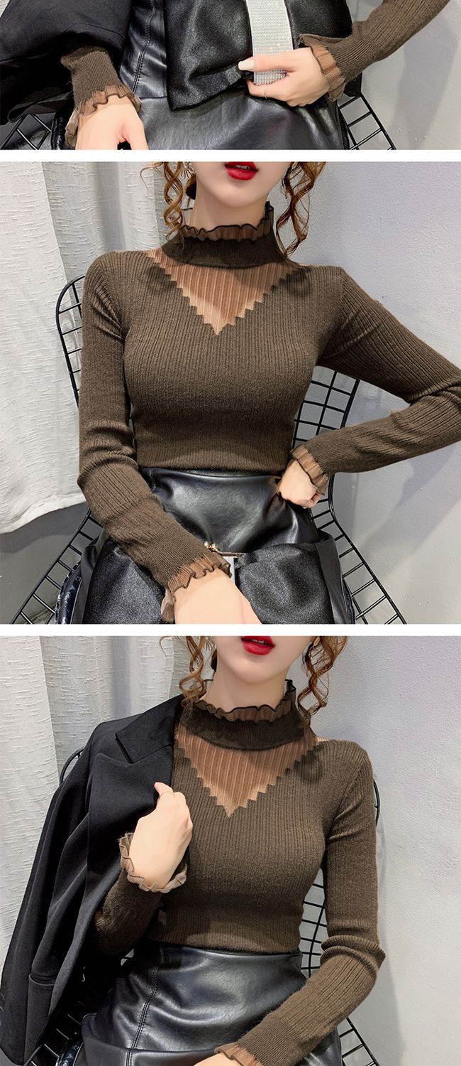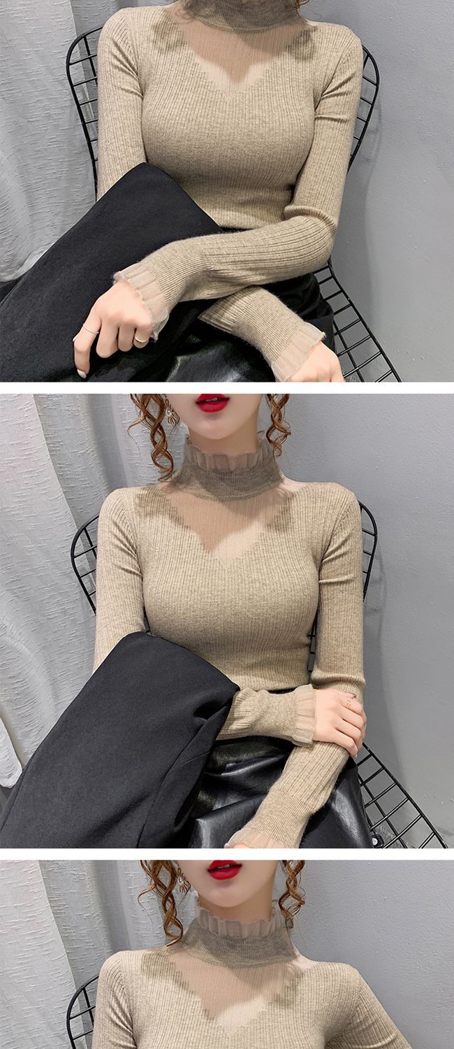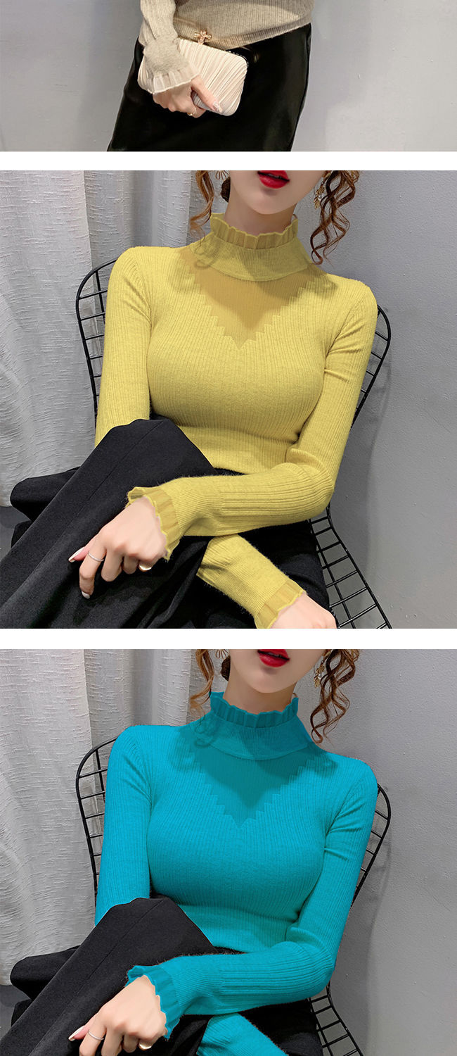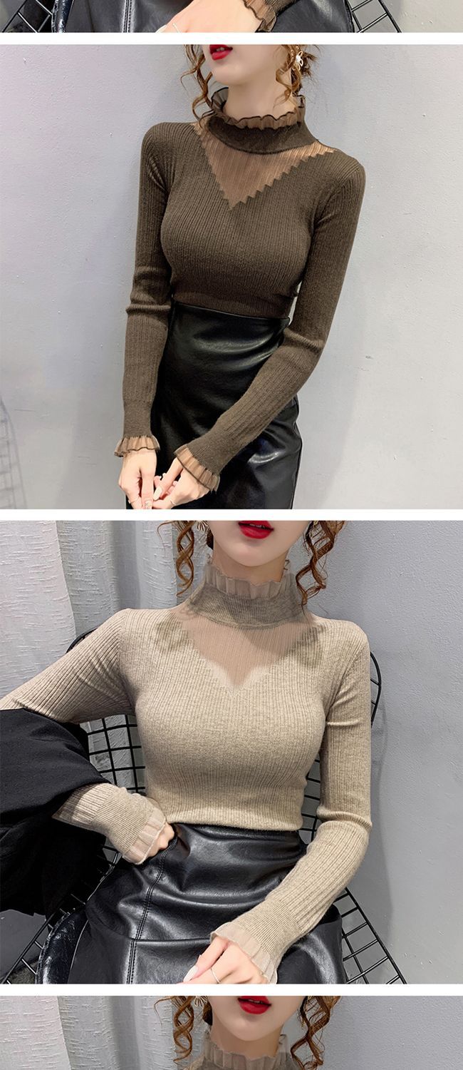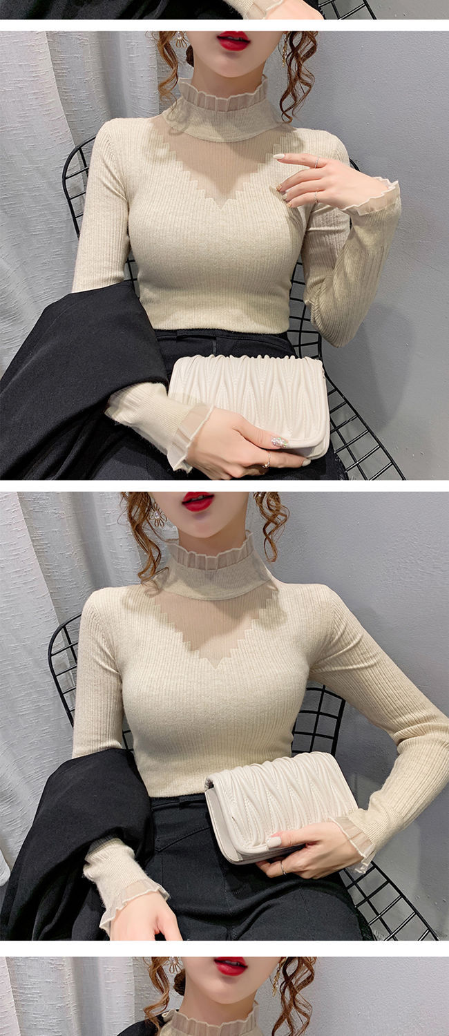 하프 터틀넥 레이스 스티칭 할로우 스웨터 여성 가을 및 겨울 새로운 서양식 슬림 핏 내부 니트 베이스 셔츠 여성용 탑