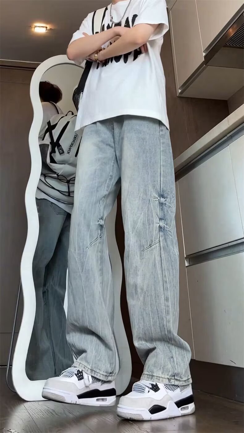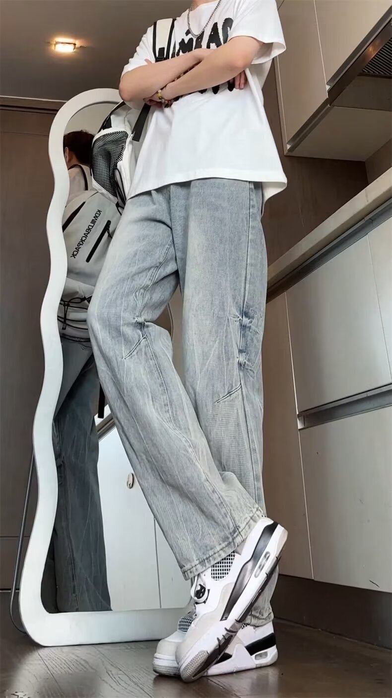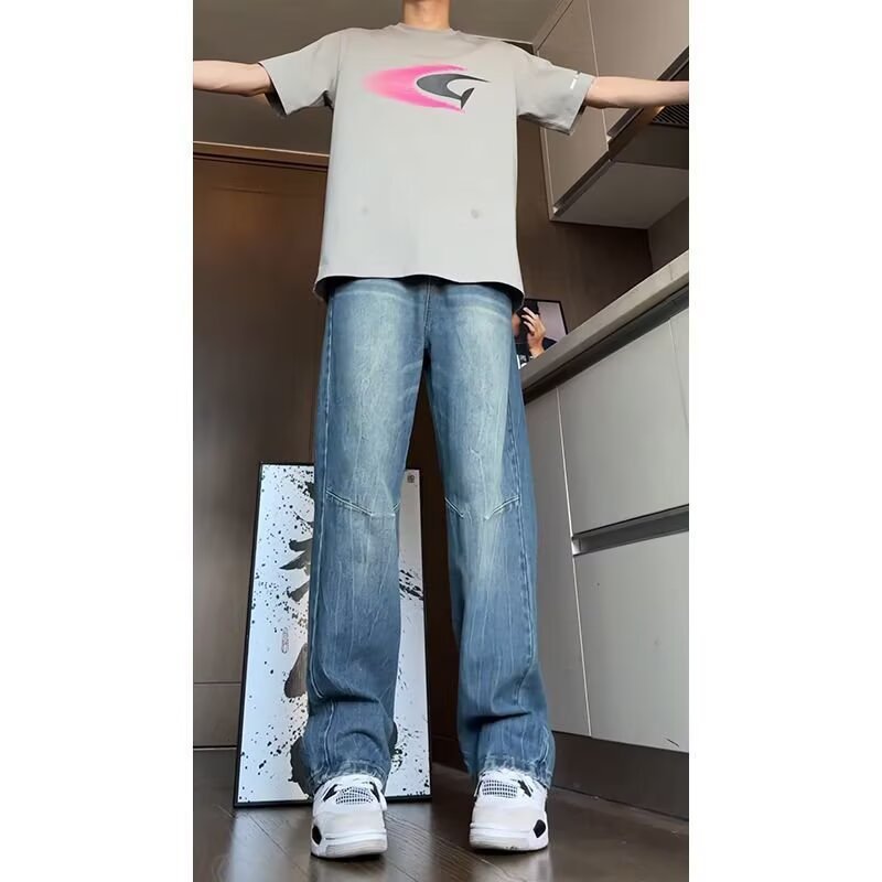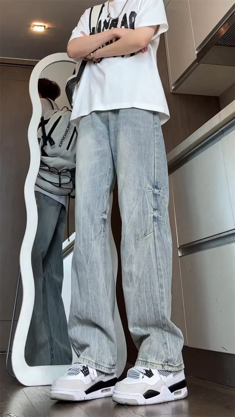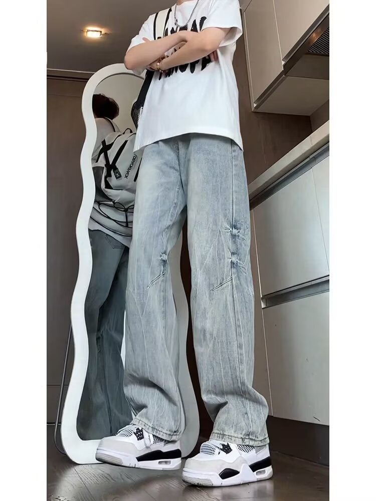 홍콩 스타일 트렌디 브랜드 청바지 남성 여름 새로운 도착 2025 미국 스타일 하이 스트리트 인 트렌디 유피 잘 생긴 스트레이트 바지 남성복스토어 가기