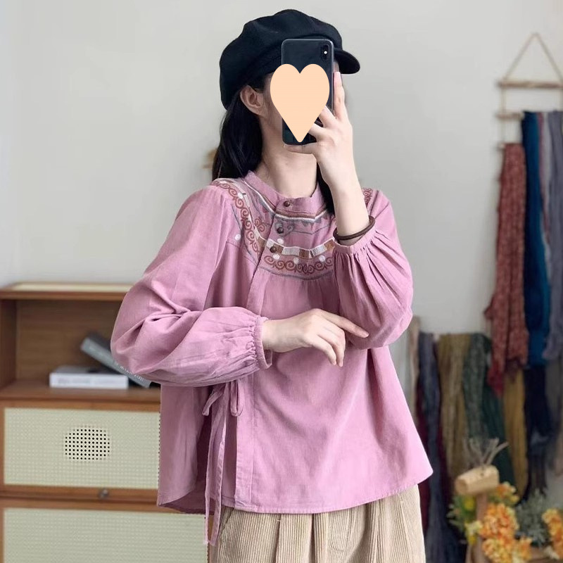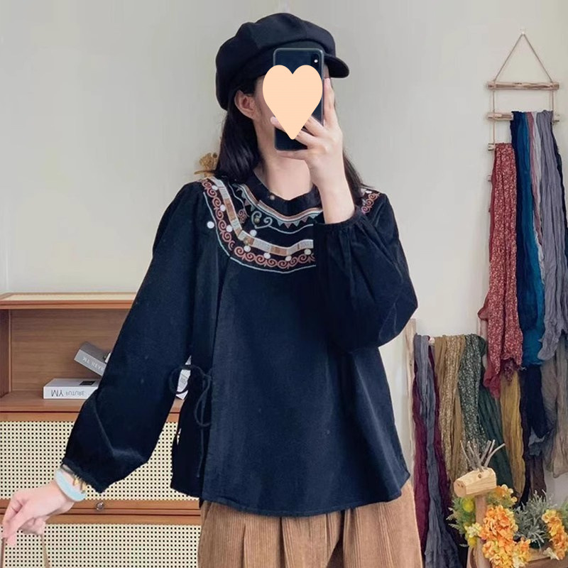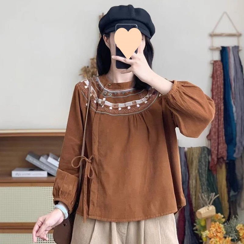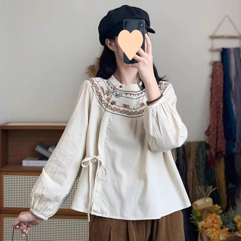 캐주얼 민족 스타일 셔츠 여성의 2024 년 봄과 가을 새로운 예술적 복고로는 느슨한 면화와 리넨 레이스 업 탑스토어 가기