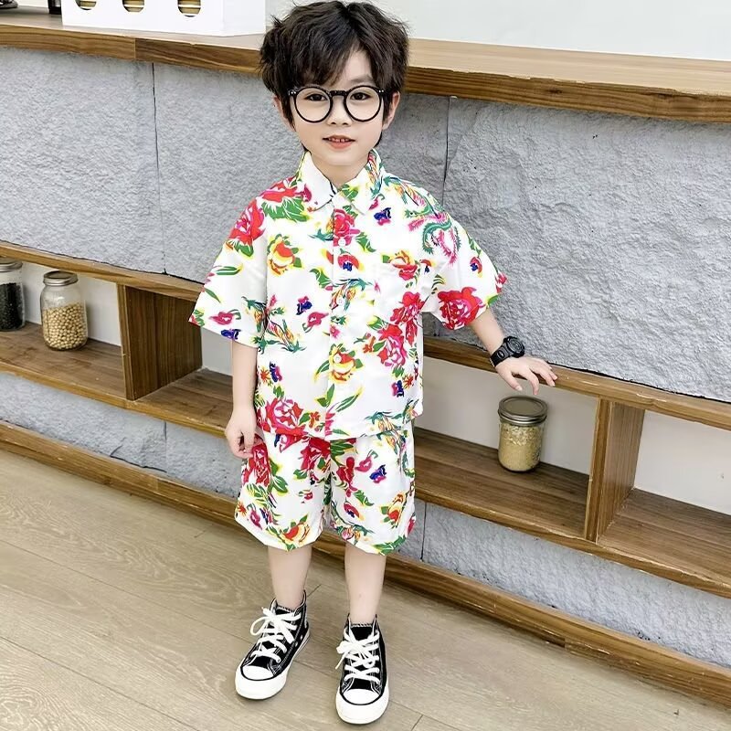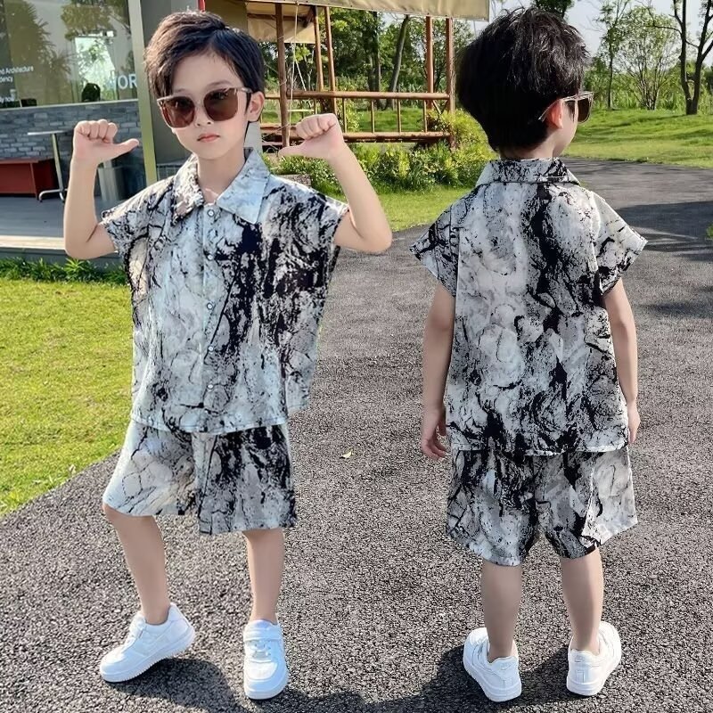 남자들의 봄과 여름 반팔 세트 멋진 잘 생긴 어린이 서양식 패셔너블한 여름복 소년 아이스웨어 아이스 실크 셔츠 투피스 세트