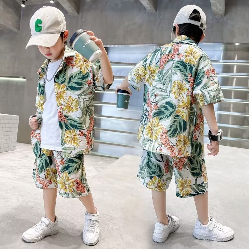 남자들의 봄과 여름 반팔 세트 멋진 잘 생긴 어린이 서양식 패셔너블한 여름복 소년 아이스웨어 아이스 실크 셔츠 투피스 세트스토어 가기