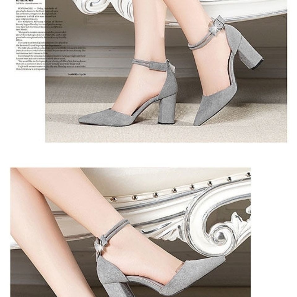 봄과 가을 패션 두꺼운 힐 여성 신발 따뜻한 벨벳 야외 올 매치 한 단어 버클 벨트 로얄 자매 뾰족한 하이힐 신발 여성용 싱글 레이어 신발스토어 가기