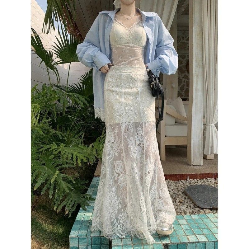 패션 세트 디자인 센스 레이스 바느질 셔츠 내부 카미 솔 여성의 봄 높은 허리 스커트 3 피스 세트