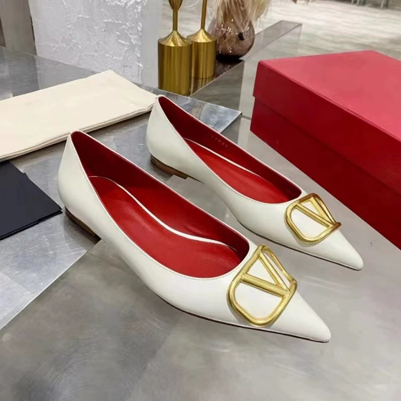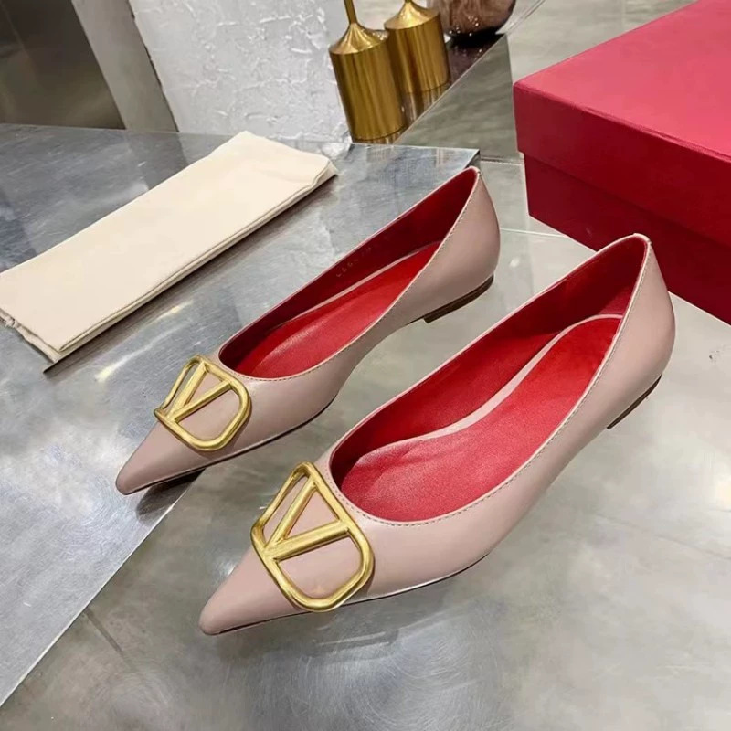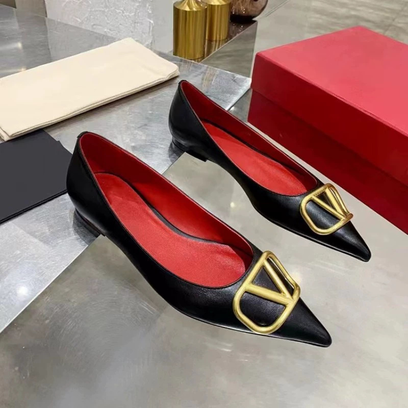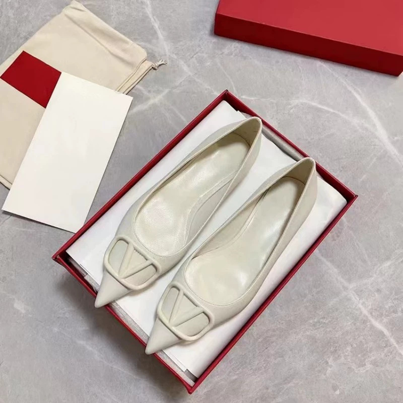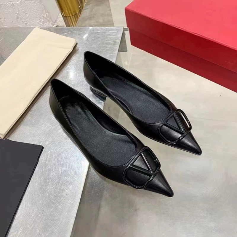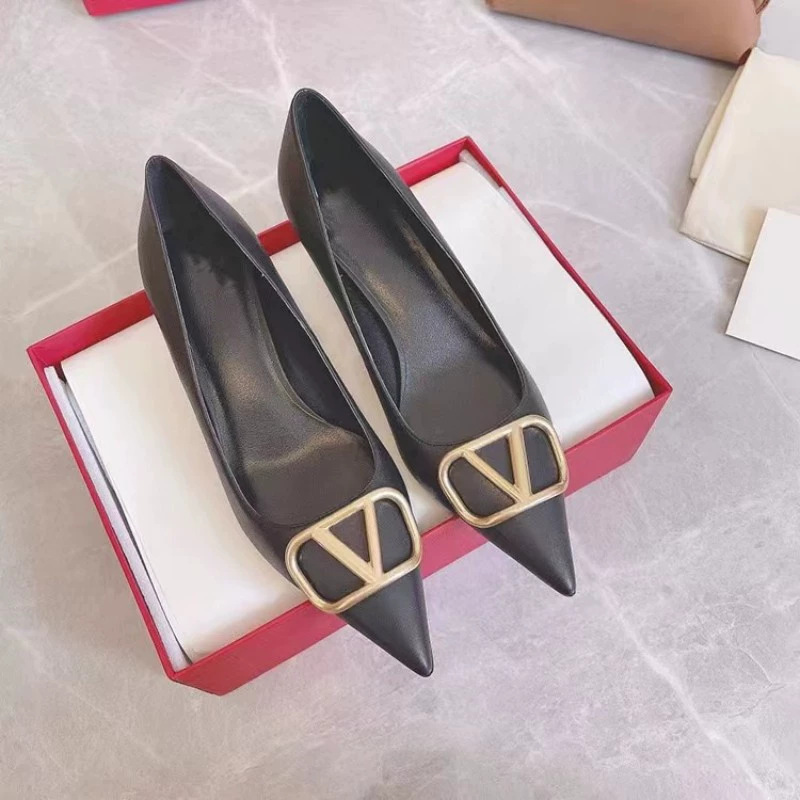 봄과 여름 2025 새로운 V 스타일 포인팅 싱글 레이어 신발 여성용 얇은 굽 가죽 금속 버클 미드 힐 얕은 입 올 매치 편안한 리벳스토어 가기