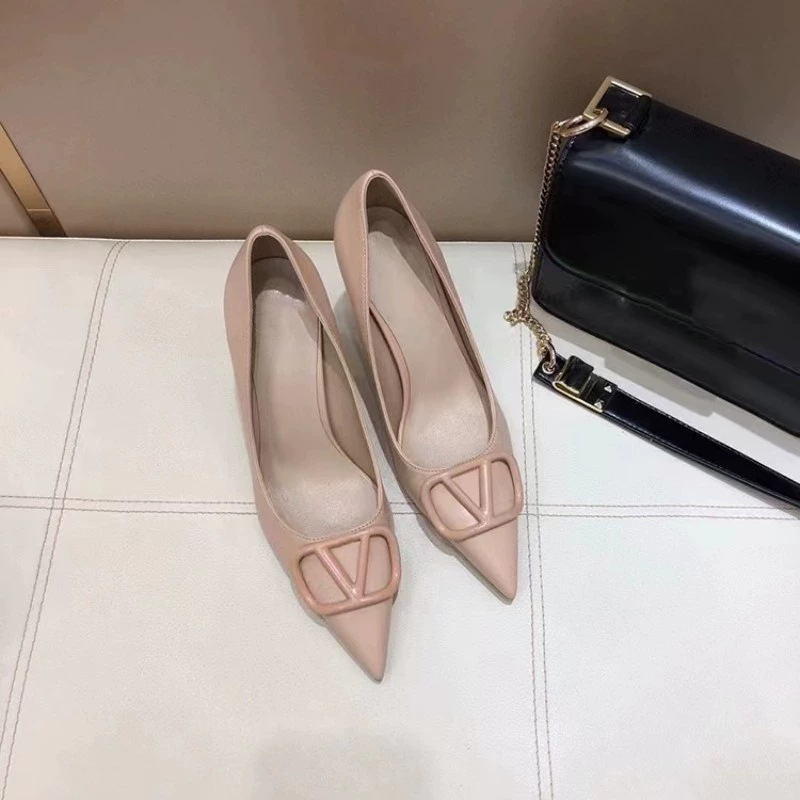봄과 여름 2025 새로운 V 스타일 포인팅 싱글 레이어 신발 여성용 얇은 굽 가죽 금속 버클 미드 힐 얕은 입 올 매치 편안한 리벳