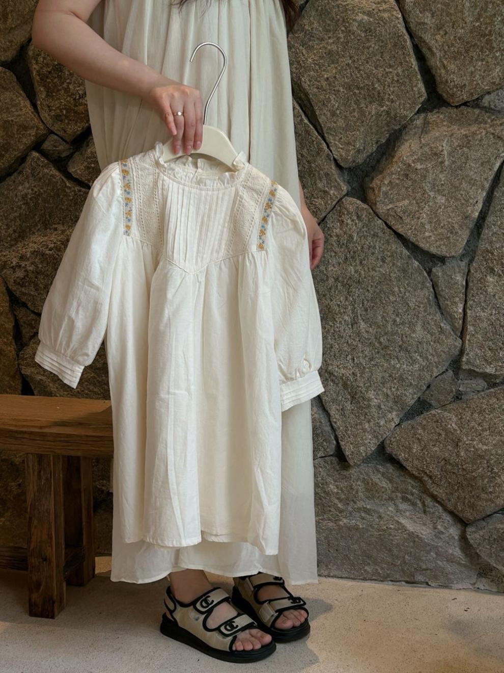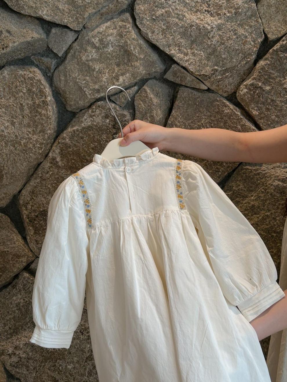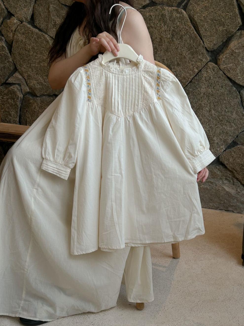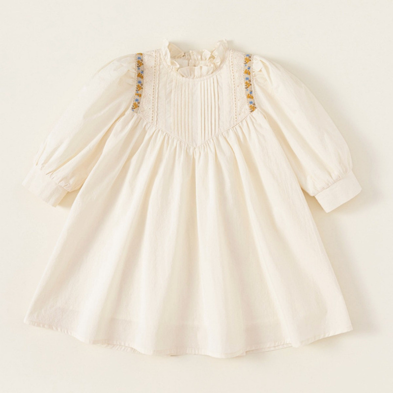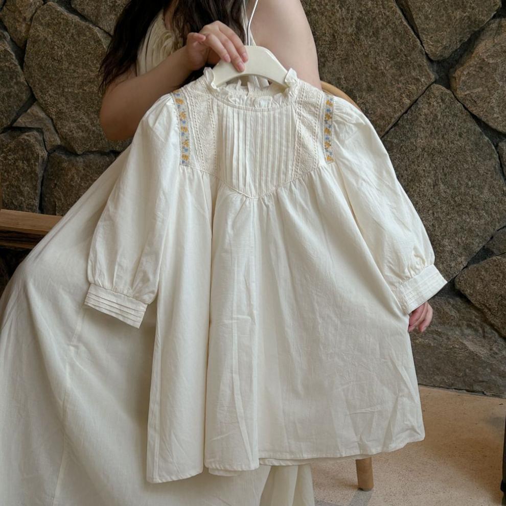 가을과 겨울 어린이 착용 새로운 소녀 프랑스 스타일 레트로 틈새 헵번 스타일 주름 수직 칼라 화이트 퍼프 소매 원피스스토어 가기