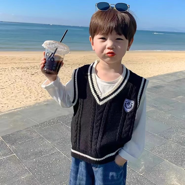 젊은 및 중학교 소년 및 여자 대학 스타일 니트 조끼 가을 새로운 어린이 서양식 대비 색상 외부 착용 민소매 스웨터 조끼스토어 가기