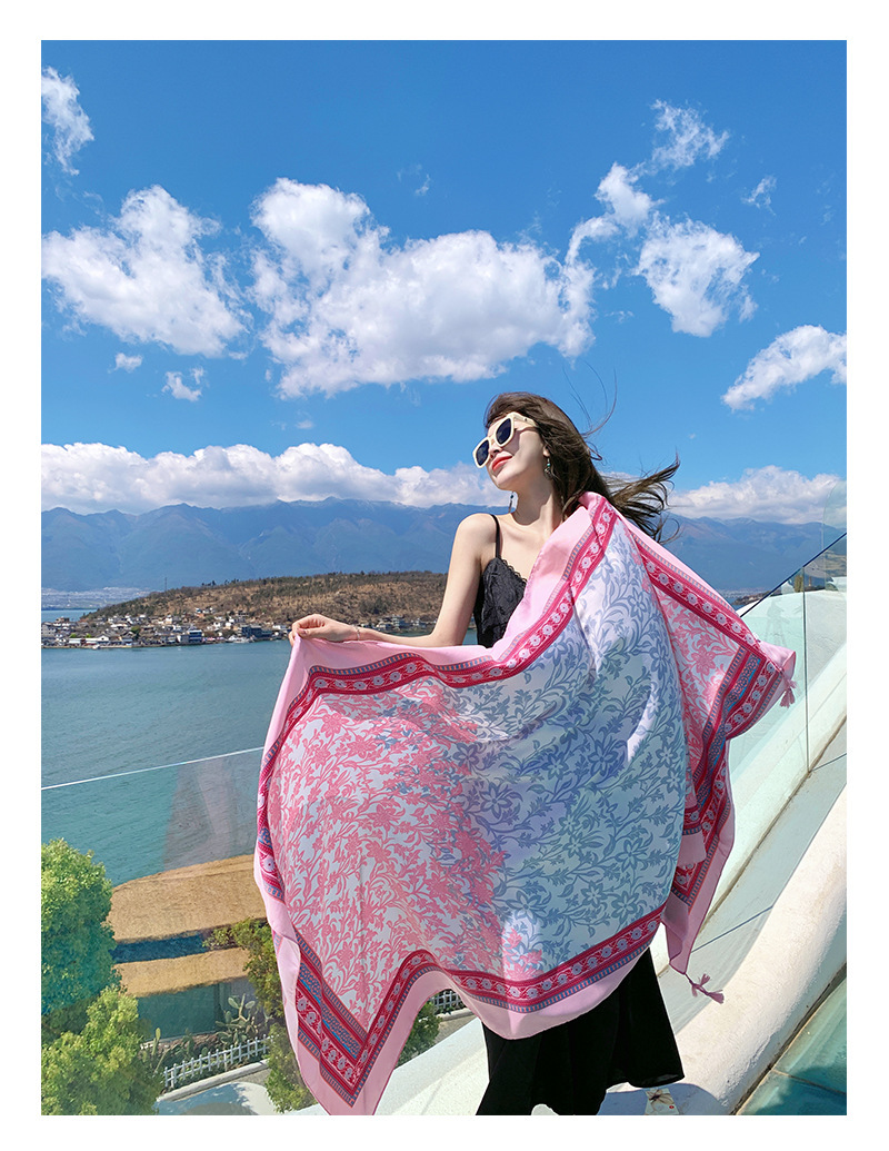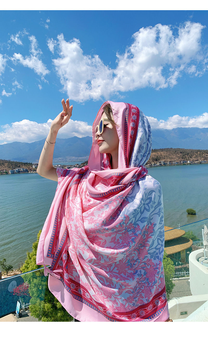 여름 휴가 여행 실크 스카프 여성 긴 스카프 외부 햇빛 민족 스타일 이중 사용 경량 스카프 대형 선스크린 목도리