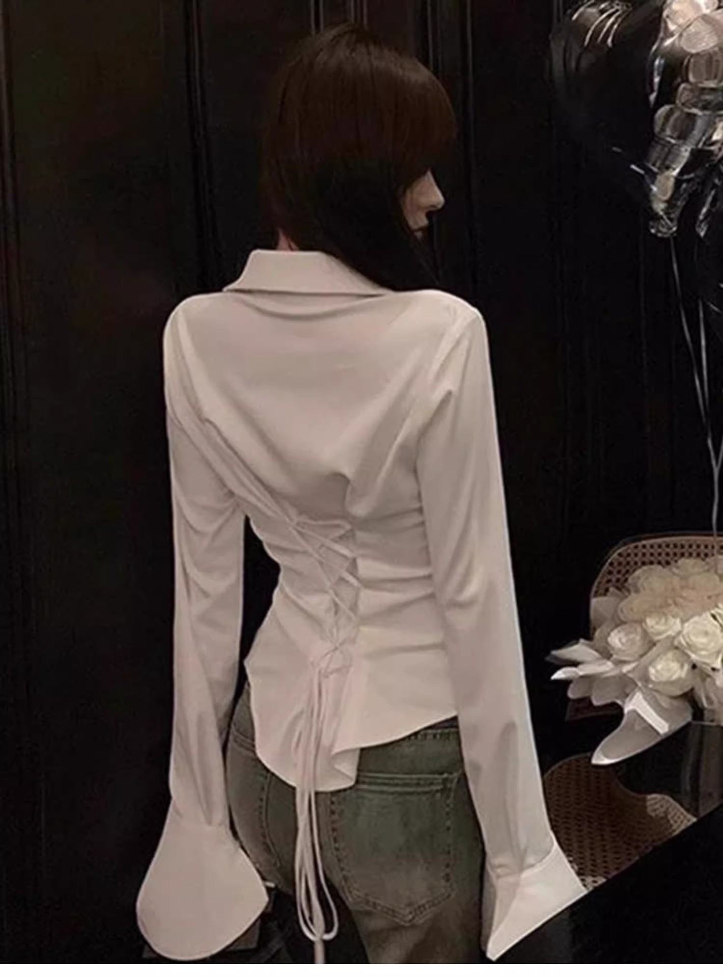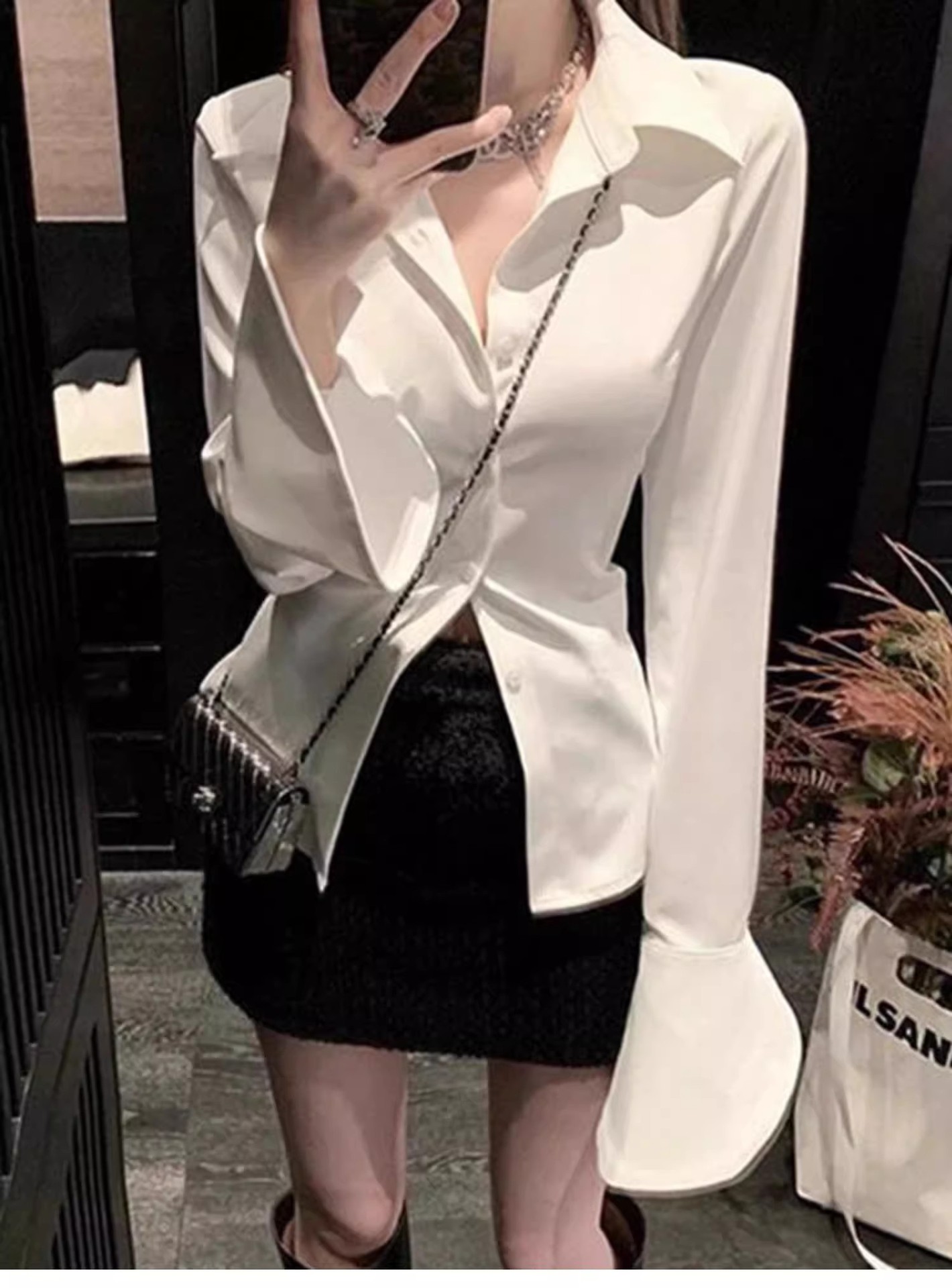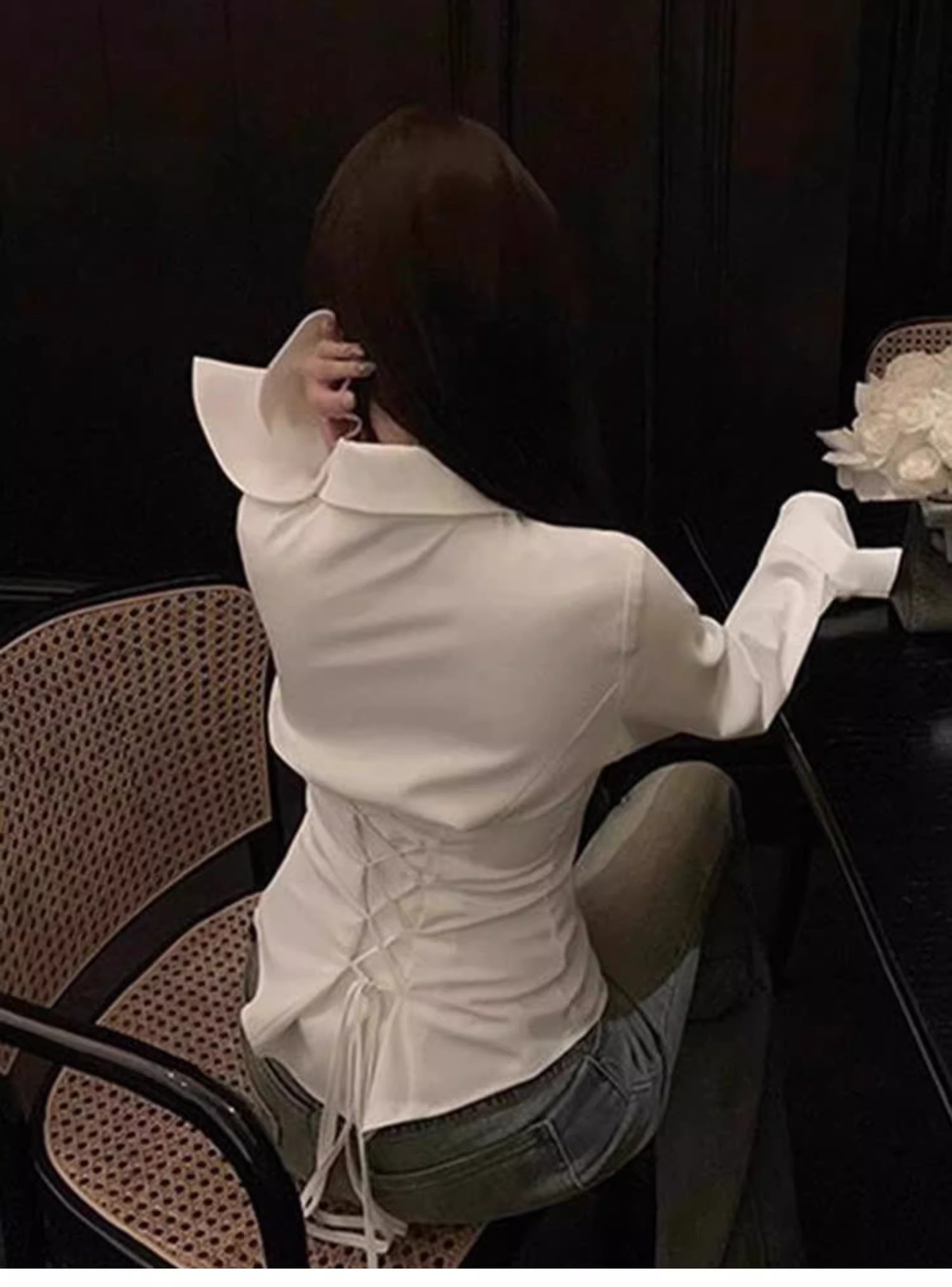 프랑스 스타일 아름다운 니트 허리 탑 여성의 봄 새로운 성숙한 왕실 자매 인테리어 디자인 틈새 흰색 긴 소매 셔츠