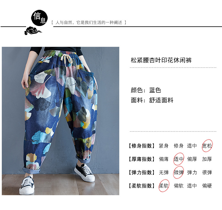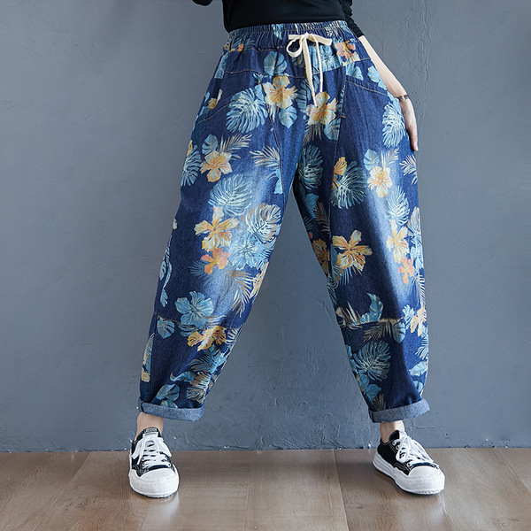 2025 봄 레트로 프린트 캐주얼 슬림핏 루즈핏 밴딩 허리끈 통통한 여성용 워싱 데님 하렘 팬츠스토어 가기