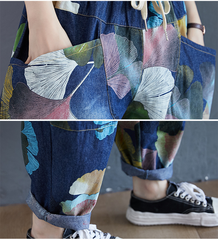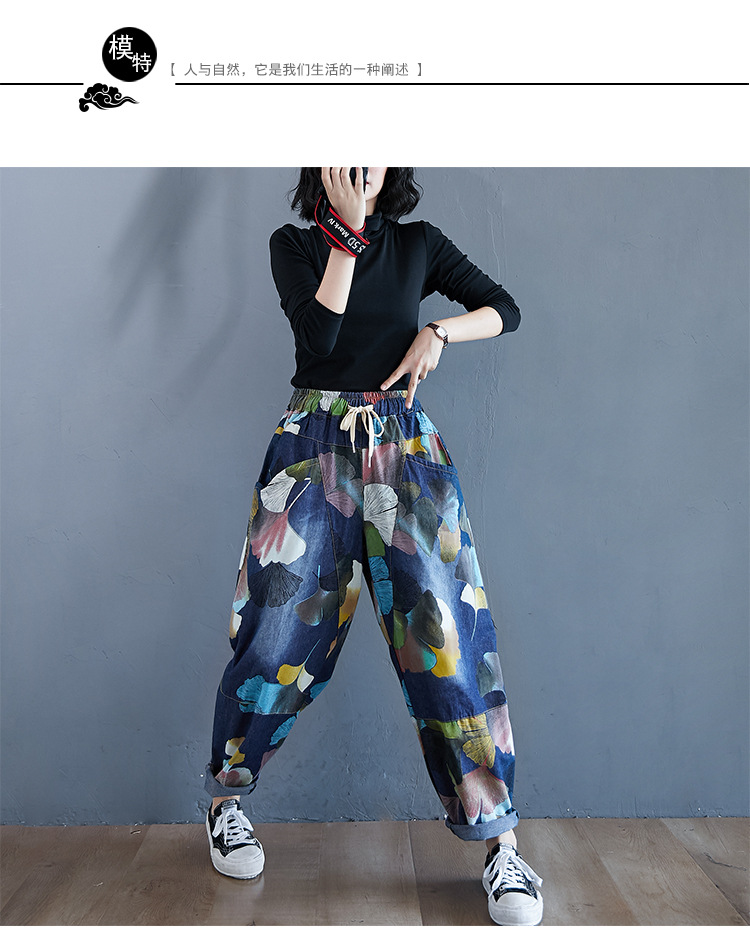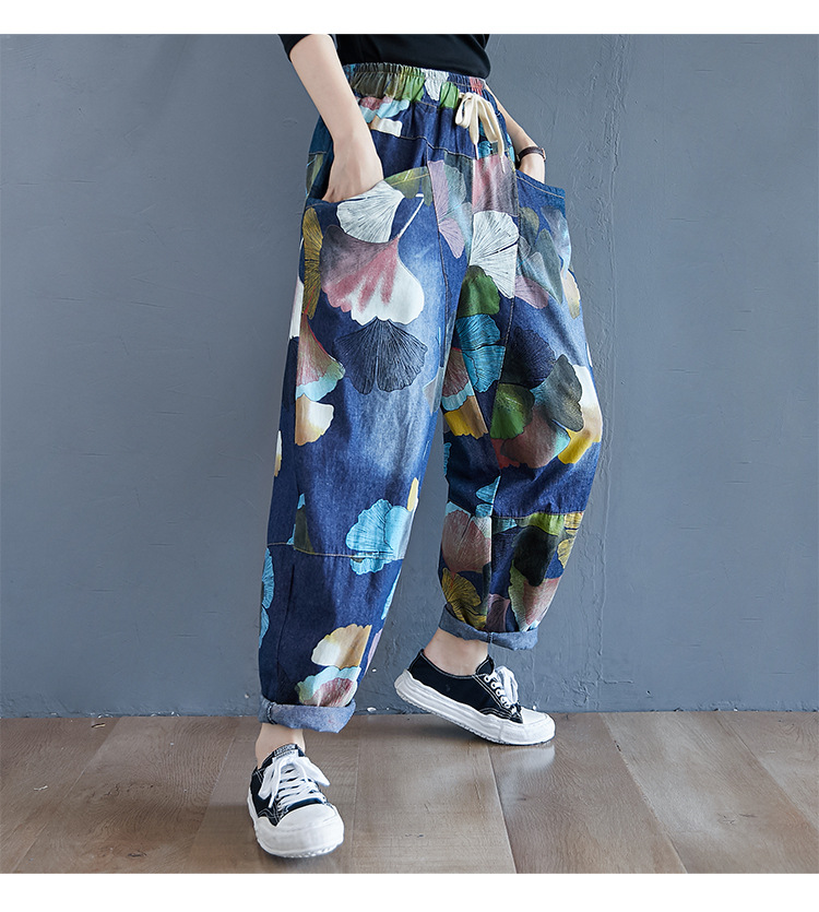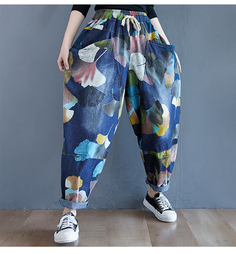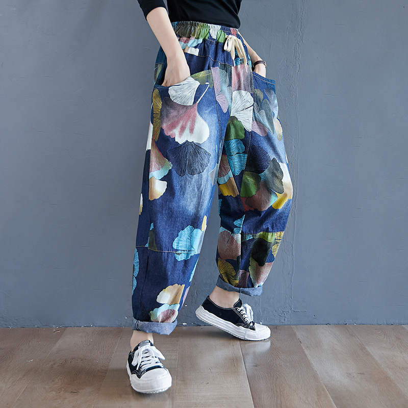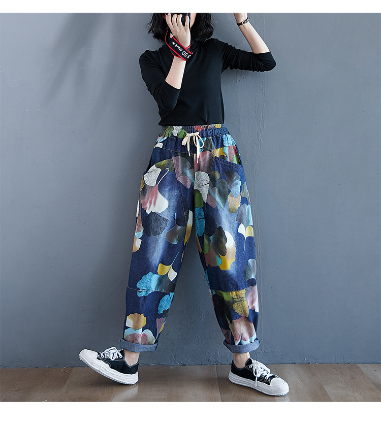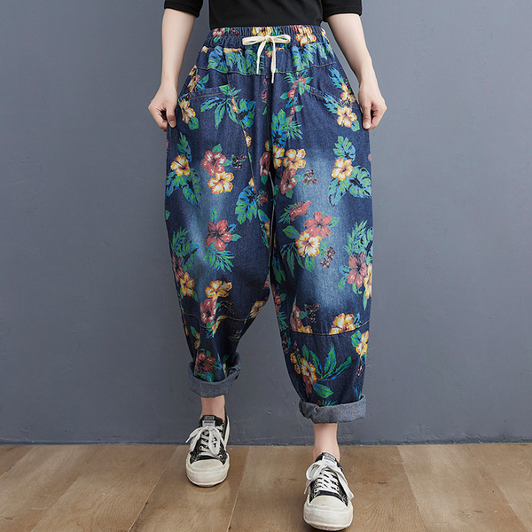 2025 봄 레트로 프린트 캐주얼 슬림핏 루즈핏 밴딩 허리끈 통통한 여성용 워싱 데님 하렘 팬츠