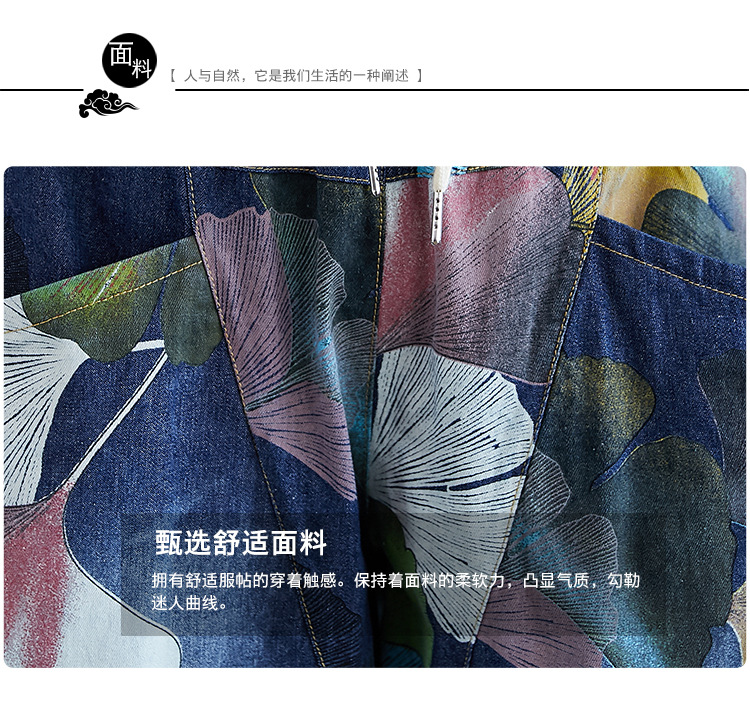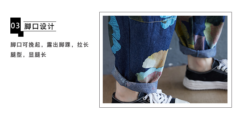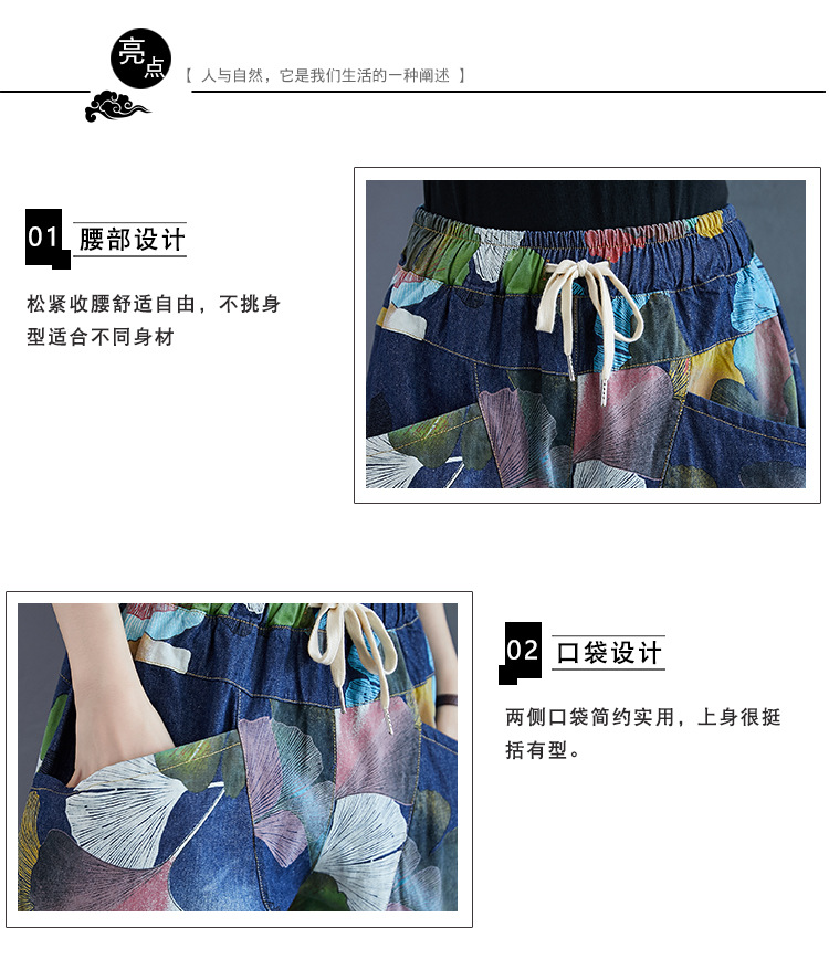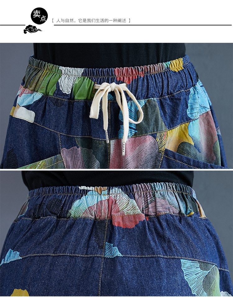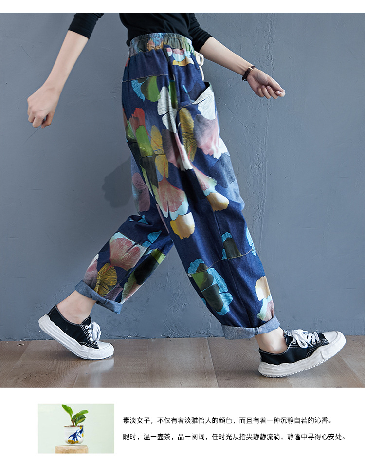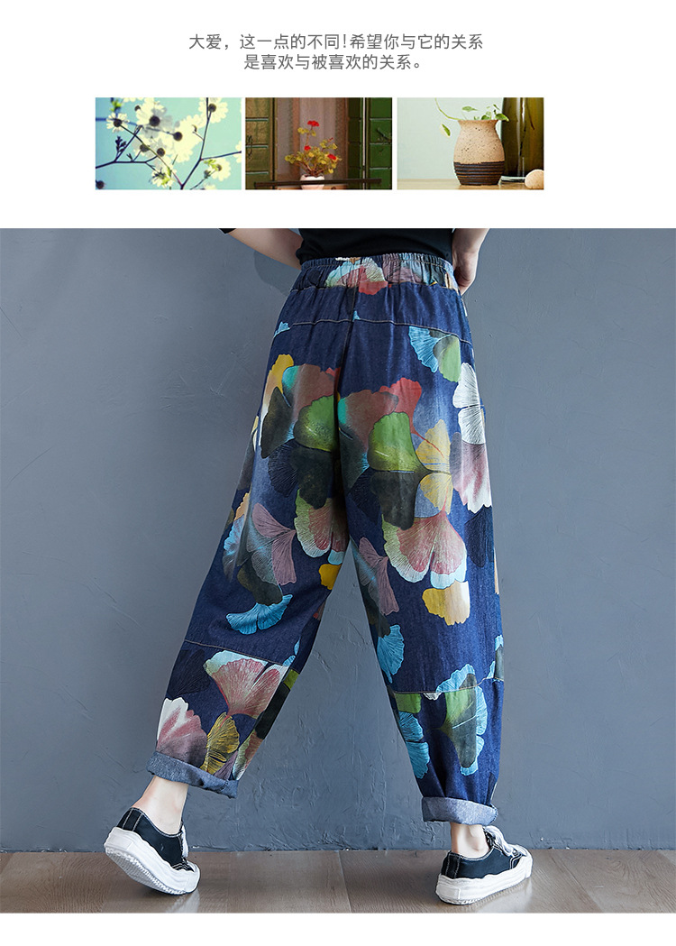 2025 봄 레트로 프린트 캐주얼 슬림핏 루즈핏 밴딩 허리끈 통통한 여성용 워싱 데님 하렘 팬츠